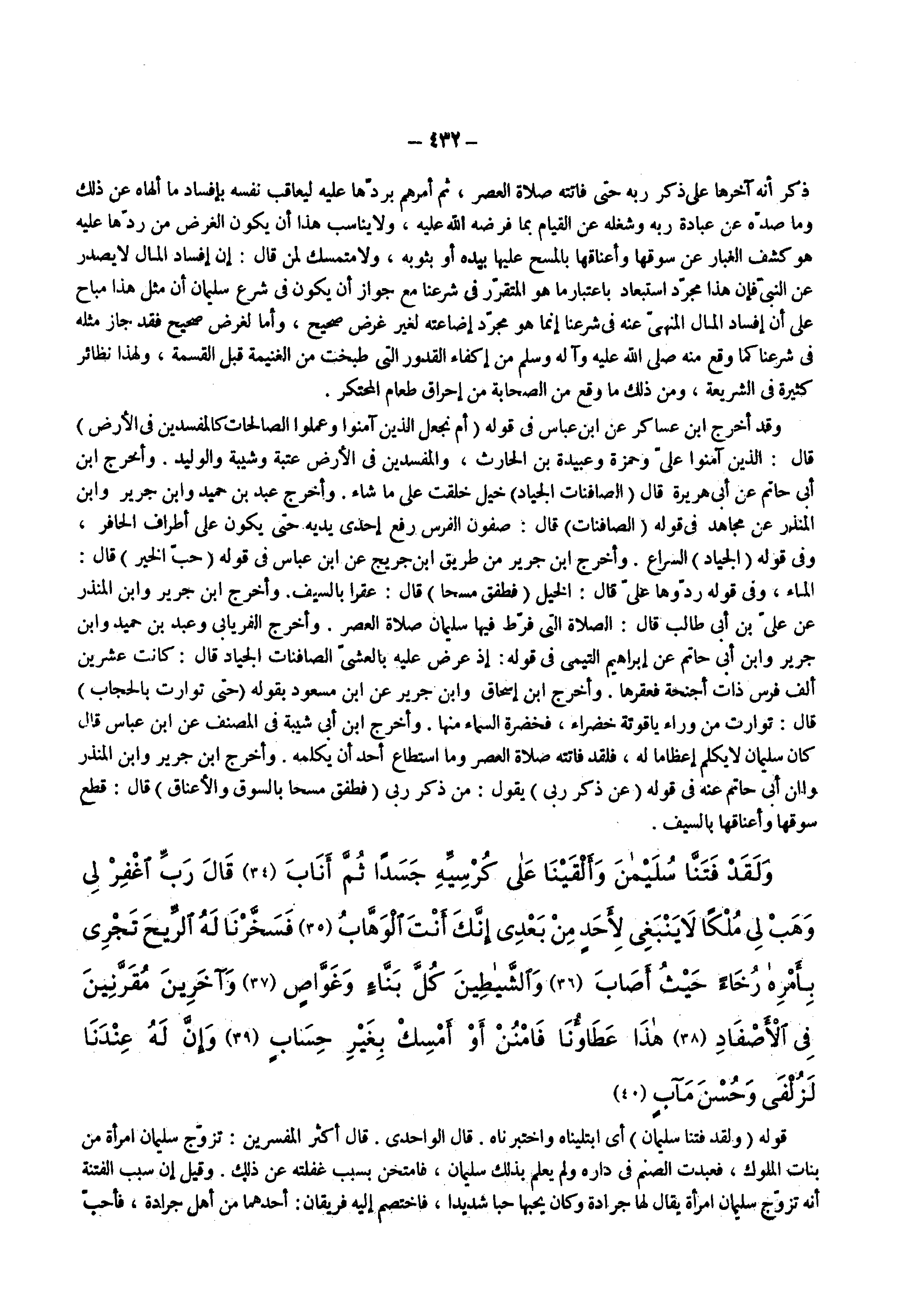 وقد أخرج ابن عساكر عن ابن عباس فى قوله ) أم نجعل الذين آمنوا وعملوا الصالحات كالمفسدين في الأرض ( قال الذين آمنوا على وحمزة وعبيدة بن الحارث والمفسدين فى الأرض عتبة وشيبة والوليد وأخرج ابن أبى حاتم عن أبى هريرة قال ) الصافنات الجياد ( خيل خلقت على ما شاء وأخرج عبد بن حميد وابن جرير وابن المنذر عن مجاهد فى قوله ) الصافنات ( قال صفون الفرس رفع إحدى يديه حتى يكون على أطراف الحافر وفى قوله الجياد السراع وأخرج ابن جرير من طريق ابن جريج عن ابن عباس فى قوله حب الخير قال الماء وفى قوله ردوها على قال الخيل ) فطفق مسحا ( قال عقرا بالسيف وأخرج ابن جرير وابن المنذر عن على بن أبى طالب قال الصلاة التى فرط فيها سليمان صلاة العصر وأخرج الفريابى وعبد بن حميد وابن جرير وابن أبى حاتم عن إبراهيم التيمى فى قوله إذ عرض عليه بالعشى الصافنات الجياد قال كانت عشرين ألف فرس ذات أجنحة فعقرها وأخرج ابن إسحاق وابن جرير عن ابن مسعود بقوله ) حتى توارت بالحجاب ( قال توارت من وراء ياقوتة خضراء فخضرة السماء منها وأخرج ابن أبى شيبة فى المصنف عن ابن عباس قال كان سليمان لا يكلم إعظاما له فلقد فاتته صلاة العصر وما استطاع أحد أن يكلمه وأخرج ابن جرير وابن المنذر وابن أبى حاتم عنه فى قوله ) عن ذكر ربي ( يقول من ذكر ربى ) فطفق مسحا بالسوق والأعناق ( قال قطع سوقها وأعناقها بالسيف