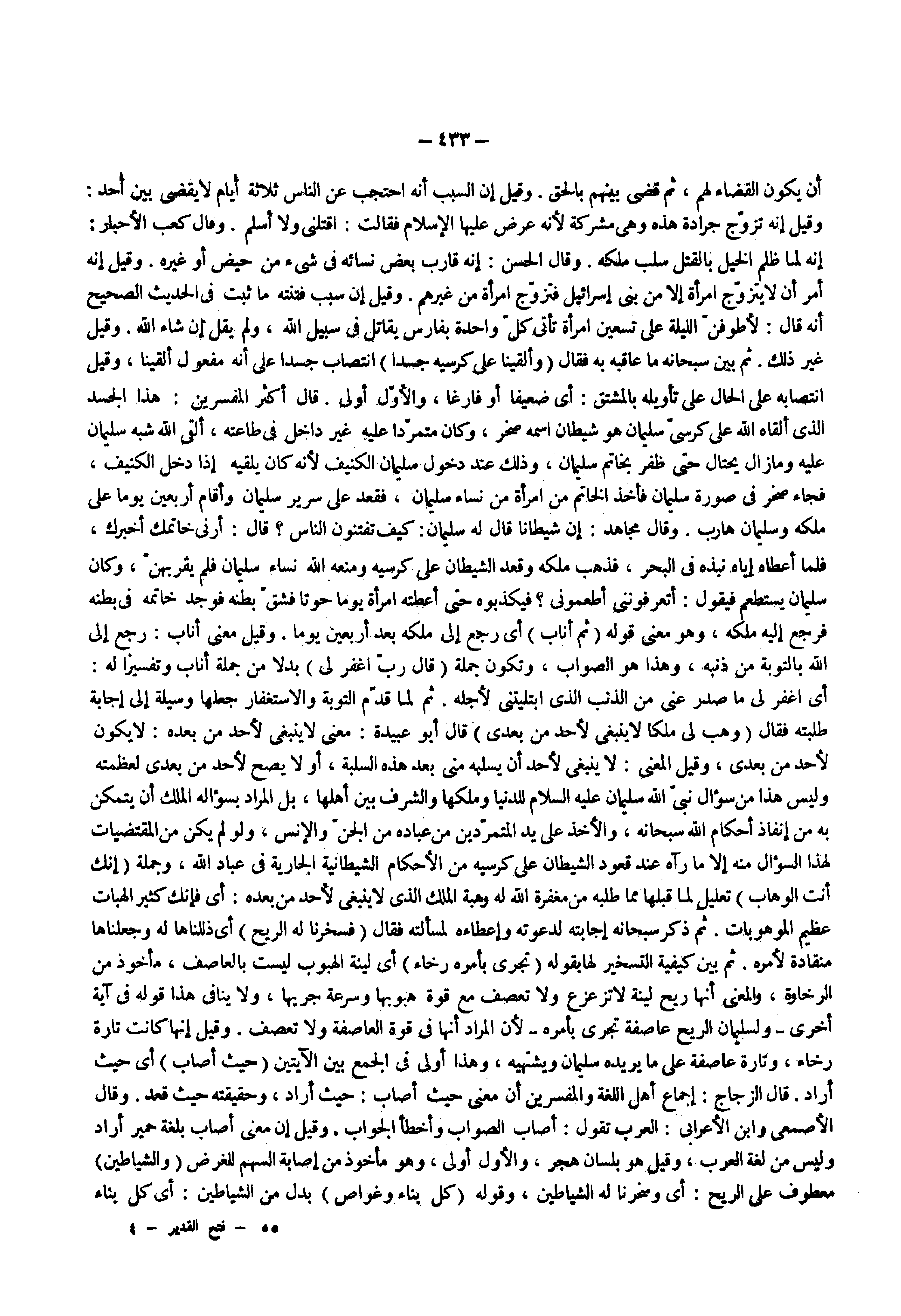 أن يكون القضاء لهم ثم قضى بينهم بالحق وقيل إن السبب أنه احتجب عن الناس ثلاثة أيام لا يقضى بين أحد وقيل إنه تزوج جرادة هذه وهى مشركة لأنه عرض عليها الإسلام فقالت اقتلنى ولا أسلم وقال كعب الأحبار إنه لما ظلم الخيل بالقتل سلب ملكه وقال الحسن إنه قارب بعض نسائه فى شىء من حيض أو غيره وقيل إنه أمر أن لا يتزوج امرأة إلا من بنى إسرائيل فتزوج من غيرهم وقيل إن سبب فتنته ما ثبت فى الحديث الصحيح أنه قال لأطوفن الليلة على تسعين امرأة تأتى كل واحدة بفارس يقاتل فى سبيل الله ولم يقل إن شاء الله وقيل غير ذلك ثم بين سبحانه ما عاقبه به فقال ) وألقينا على كرسيه جسدا ( انتصاب جسدا على أنه مفعول ألقينا وقيل انتصابه على الحال على تأويله بالمشتق أى ضعيفا أو فارغا والأول أولى قال أكثر المفسرين هذا الجسد الذى ألقاه الله على كرسى سليمان هو شيطان اسمه صخر وكان متمردا عليه غير داخل فى طاعته ألقى الله شبه سليمان عليه وما زال يحتال حتى ظفر بخاتم سليمان وذلك عند دخول سليمان الكنيف لأنه كان يلقيه إذ دخل الكنيف فجاء صخر فى صورة سليمان فأخذ الخاتم من امرأة من نساء سليمان فقعد على سرير سليمان وأقام أربعين يوما على ملكه وسليمان هارب وقال مجاهد إن شيطانا قال له سليمان كيف تفتنون الناس قال أرنى خاتمك أخبرك فلما أعطاه إياه نبذه فى البحر فذهب ملكه وقعد الشيطان على كرسيه ومنعه الله نساء سليمان فلم يقربهن وكان سليمان يستطعم فيقول أتعرفوننى أطعمونى فيكذبوه حتى أعطته امرأة يوما حوتا فشق بطنه فوجد خاتمه فى بطنه فرجع إليه ملكه وهو معنى قوله ) ثم أناب ( أى رجع إلى ملكه بعد أربعين يوما وقيل معنى أناب رجع إلى الله بالتوبة من ذنبه وهذا هو الصواب
