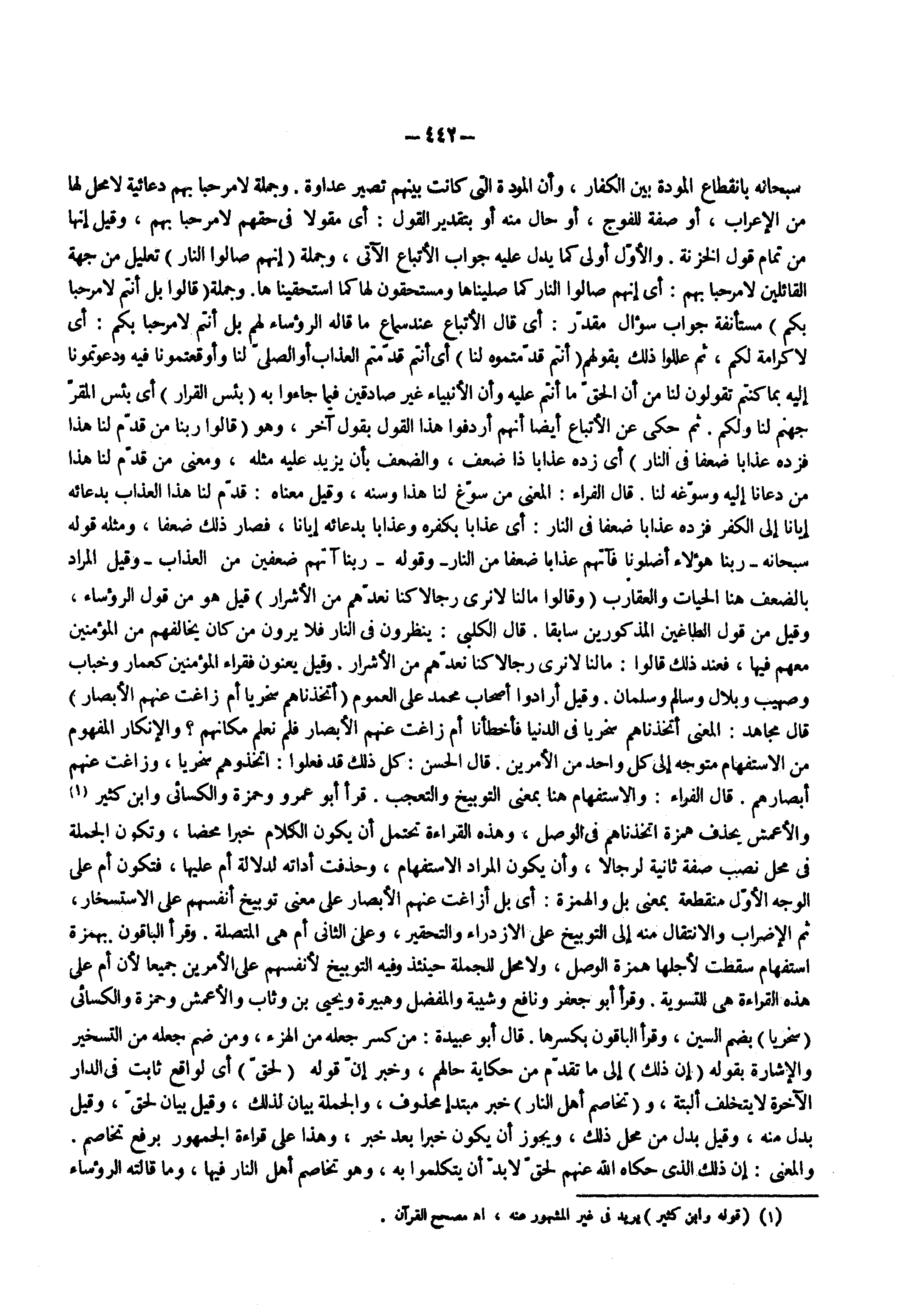 ) أتخذناهم سخريا أم زاغت عنهم الأبصار ( قال مجاهد المعنى أتخذناهم سخريا فى الدنيا فأخطأنا أم زاغت عنهم الأبصار فلم نعلم مكانهم والإنكار المفهوم من الاستفهام متوجه إلى كل واحد من الأمرين قال الحسن كل ذلك قد فعلوا اتخذوهم سخريا وزاغت عنهم أبصارهم قال الفراء والاستفهام هنا بمعنى التوبيخ والتعجب قرأ أبو عمرو وحمزة والكسائى وابن كثير والأعمش بحذف همزة اتخذناهم فى الوصل وهذه القراءة تحتمل أن يكون الكلام خبرا محضا وتكون الجملة فى محل نصب صفة ثانية لرجالا وأن يكون المراد الاستفهام وحذفت أداته لدلالة أم عليها فتكون أم على الوجه الأول منقطعة بمعنى بل والهمزة أى بل أزاغت عنهم الأبصار على معنى توبيخ أنفسهم على الاستسخار ثم الإضراب والانتقال منه إلى التوبيخ على الازدراء والتحقير وعلى الثانى أم هى المتصلة وقرأ الباقون بهمزة استفهام سقطت لأجلها همزة الوصل ولا محل للجملة حينئذ وفيه التوبيخ لأنفسهم على الأمرين جميعا لأن أم على هذه القراءة هى للتسوية وقرأ أبو جعفر ونافع وشيبة والمفضل وهبيرة ويحيى بن وثاب والأعمش وحمزة والكسائى سخريا بضم السين وقرأ الباقون بكسرها قال أبو عبيدة من كسر جعله من الهزء ومن ضم جعله من التسخير