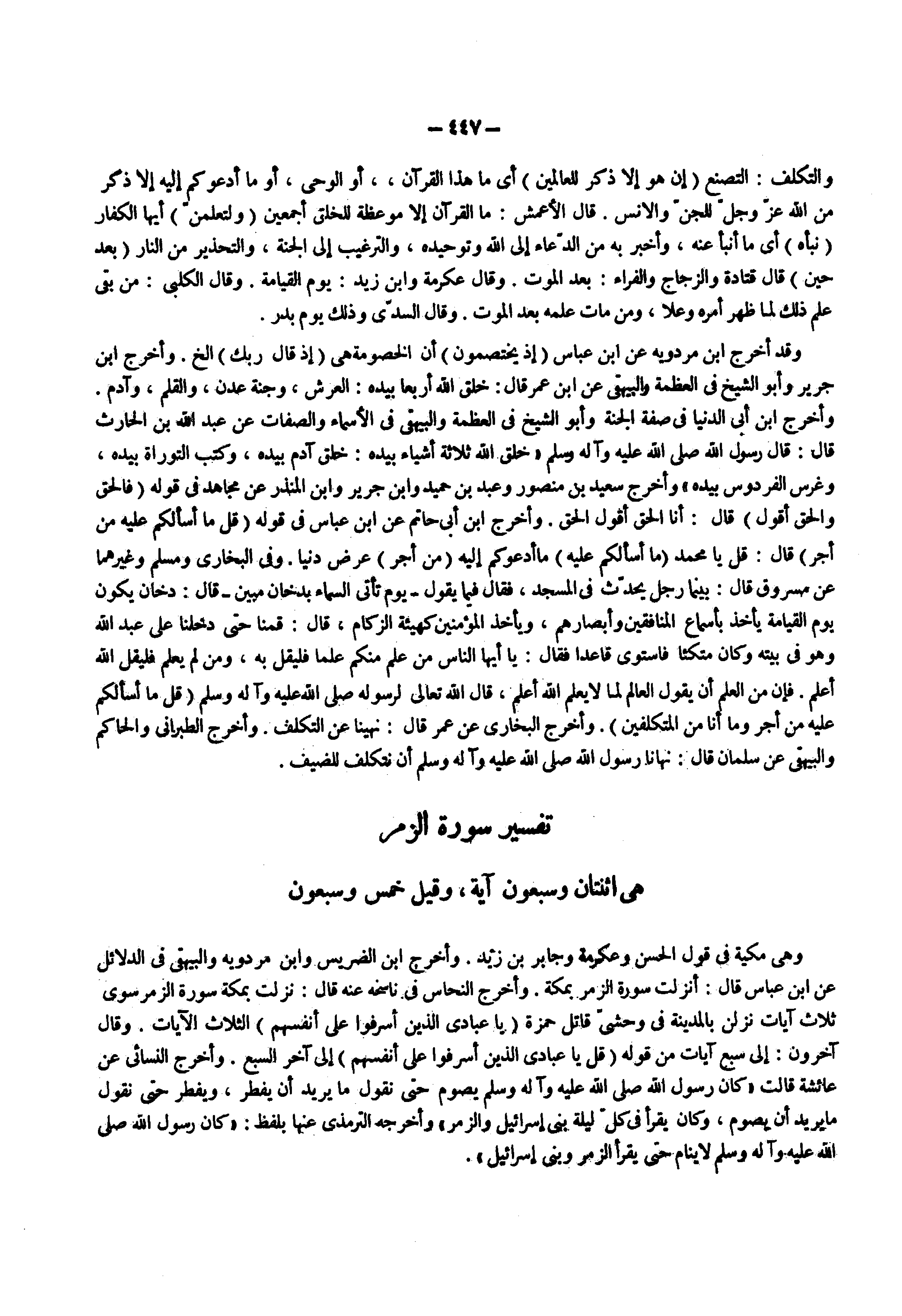 وقد أخرج ابن مردويه عن ابن عباس ) إذ يختصمون ( أن الخصومة هى ) إذ قال ربك ( الخ وأخرج ابن جرير وأبو الشيخ فى العظمة والبيهقى عن ابن عمر قال خلق الله أربعا بيده العرش وجنة عدن والقلم وآدم وأخرج ابن أبى الدنيا فى صفة الجنة وأبو الشيخ فى العظمة والبيهقي فى الأسماء والصفات عن عبد الله بن الحارث قال قال رسول الله ( صلى الله عليه وسلم ) خلق الله ثلاثة أشياء بيده خلق آدم بيده وكتب التوراة بيده وغرس الفردوس بيده وأخرج سعيد بن منصور وعبد بن حميد وابن جرير وابن المنذر عن مجاهد فى قوله ) فالحق والحق أقول ( قال أنا الحق أقول الحق وأخرج ابن أبى حاتم عن ابن عباس فى قوله ) قل ما أسألكم عليه من أجر ( قال قل يا محمد ) ما أسألكم عليه ( ما أدعوكم إليه ) من أجر ( عرض دنيا وفى البخارى ومسلم وغيرهما عن مسروق قال بينما رجل يحدث فى المسجد فقال فيما يقول يوم تأتى السماء بدخان مبين قال دخان يكون يوم القيامة يأخذ بأسماع المنافقين وأبصارهم ويأخذ المؤمنين كهيئة الزكام قال قمنا حتى دخلنا على عبد الله وهو فى بيته وكان متكئا فاستوى قاعدا فقال يا أيها الناس من علم منكم علما فليقل به ومن لم يعلم فليقل الله أعلم فإن من العلم أن يقول العالم لما لا يعلم الله أعلم قال الله تعالى لرسوله ( صلى الله عليه وسلم ) ) قل ما أسألكم عليه من أجر وما أنا من المتكلفين ( وأخرج البخارى عن عمر قال نهينا عن التكلف وأخرج الطبرانى والحاكم والبيهقى عن سلمان قال نهانا رسول الله ( صلى الله عليه وسلم ) أن نتكلف للضيف