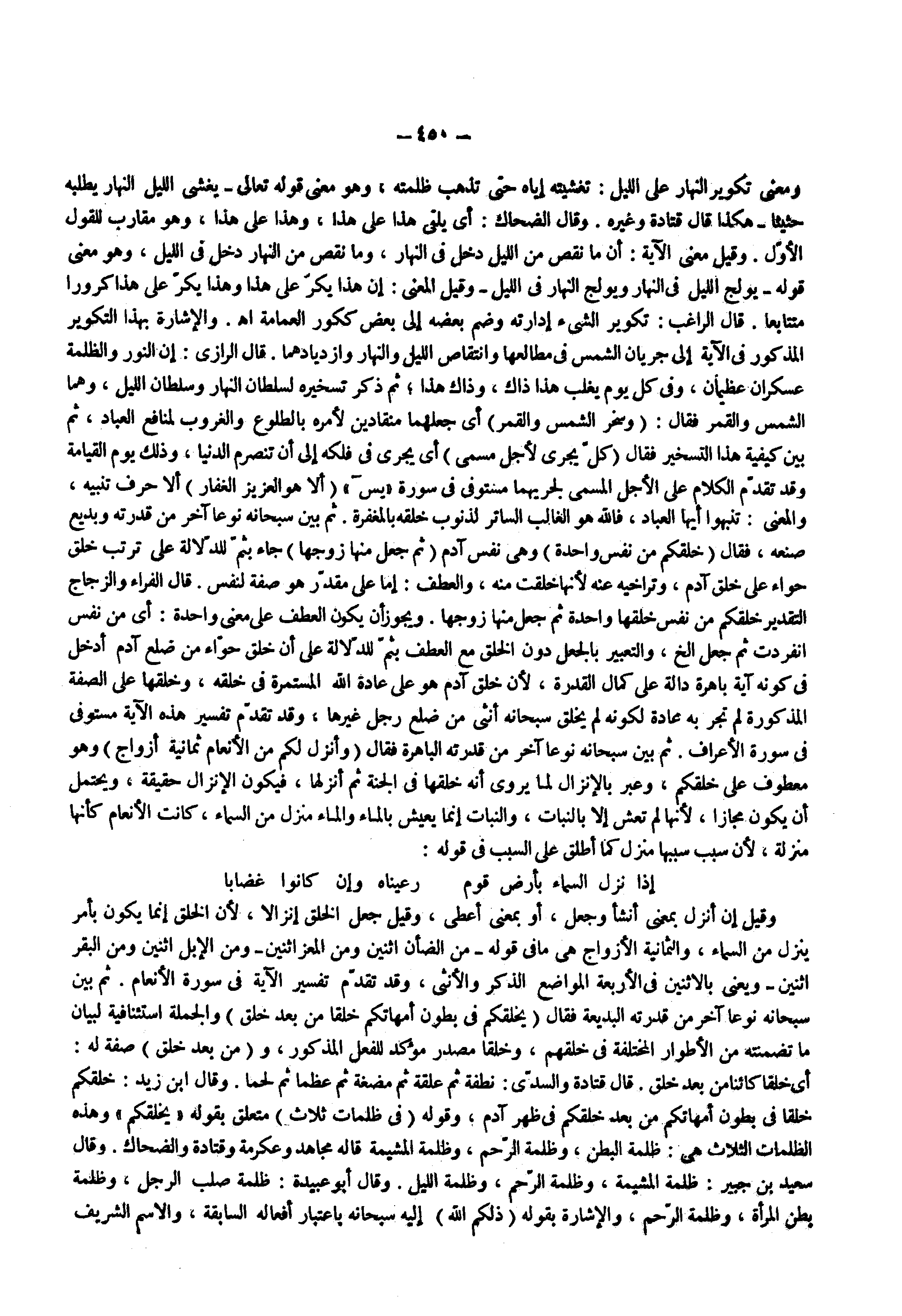 ومعنى تكوير النهار على الليل تغشيته إياه حتى تذهب ظلمته وهو معنى قوله تعالى ) يغشي الليل النهار يطلبه حثيثا ( هكذا قال قتادة وغيره وقال الضحاك أى يلقى هذا على هذا وهذا على هذا وهو مقارب للقول الأول وقيل معنى الآية أن ما نقص من الليل دخل فى النهار وما نقص من النهار دخل فى الليل وهو معنى قوله ) يولج الليل في النهار ويولج النهار في الليل ( وقيل المعنى إن هذا يكر على هذا وهذا يكر على هذا كرورا متتابعا قال الراغب تكوير الشىء إدارته وضم بعضه إلى بعض ككور العمامة والإشارة بهذا التكوير المذكور فى الآية إلى جريان الشمس فى مطالعها وانتقاص الليل والنهار وازديادهما قال الرازى إن النور والظلمة عسكران عظيمان وفى كل يوم يغلب هذا ذاك وذاك هذا ثم ذكر تسخيره لسلطان النهار وسلطان الليل وهما الشمس والقمر فقال ) وسخر الشمس والقمر ( أي جعلهما منقادين لأمره بالطلوع والغروب لمنافع العباد ثم بين كيفية هذا التسخير فقال ) كل يجري لأجل مسمى ( أى يجرى فى فلكه إلى أن تنصرم الدنيا وذلك يوم القيامة وقد تقدم الكلام على الأجل المسمى لجريهما مستوفى فى سورة يس ) ألا هو العزيز الغفار ( ألا حرف تنبيه والمعنى تنبهوا أيها العباد فالله هو الغالب الساتر لذنوب خلقه بالمغفرة