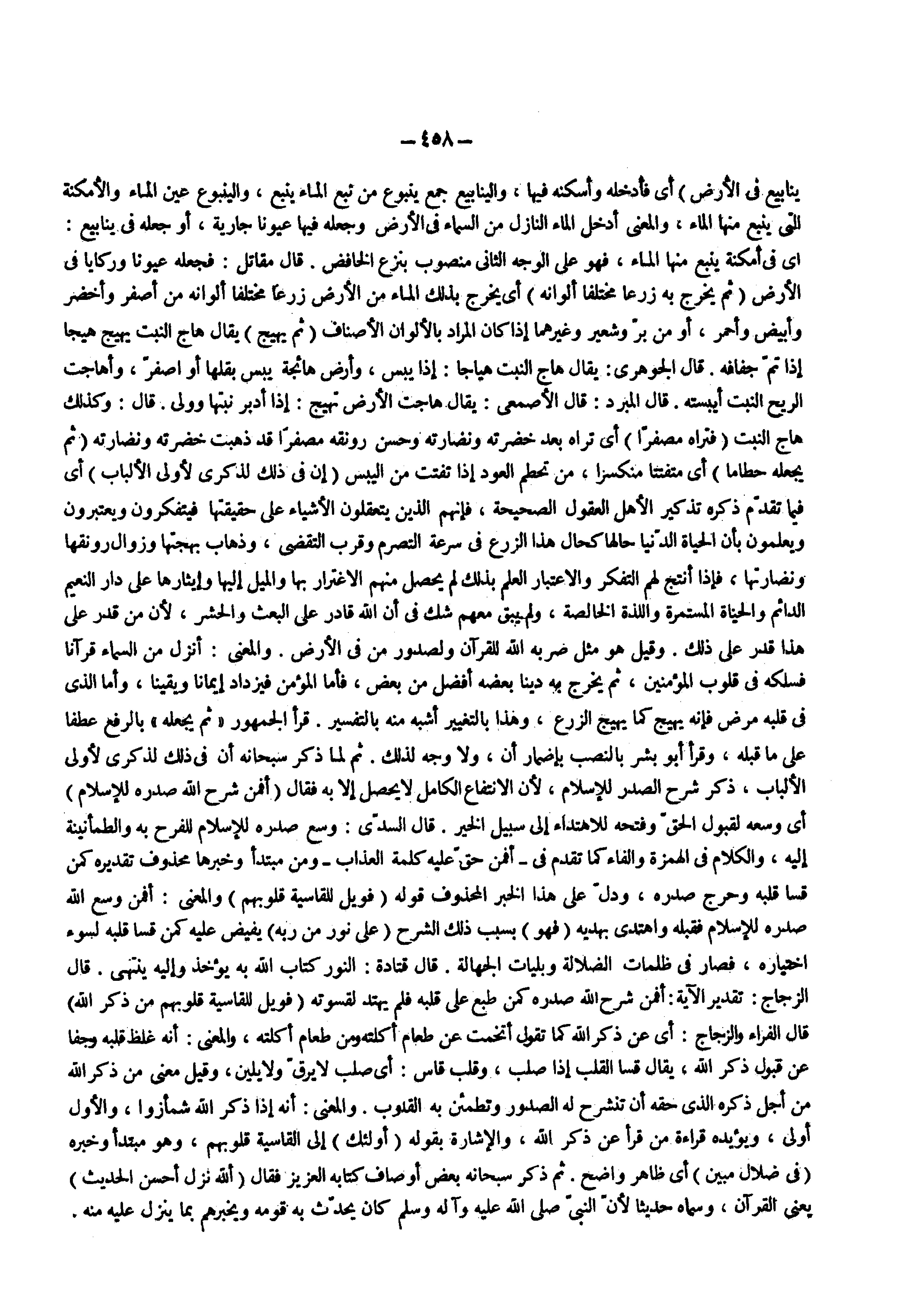 أى فأدخله وأسكنه فيها والينابيع جمع ينبوع من نبع الماء ينبع والينبوع عين الماء والأمكنة التى ينبع منها الماء والمعنى أدخل الماء النازل من السماء فى الأرض وجعله فيها عيونا جارية أو جعله فى ينابيع أى فى أمكنة ينبع منها الماء فهو على الوجه الثانى منصوب بنزع الخافض قال مقاتل فجعله عيونا وركايا فى الأرض ) ثم يخرج به زرعا مختلفا ألوانه ( أى يخرج بذلك الماء من الأرض زرعا مختلفا ألوانه من أصفر وأخضر وأبيض وأحمر أو من بر وشعير وغيرهما إذا كان المراد بالألوان الأصناف ) ثم يهيج ( يقال هاج النبت يهيج هيجا إذا تم جفافه قال الجوهرى يقال هاج النبت هياجا إذا يبس وأرض يبس بقلها أو اصفر وأهاجت الريح النبت أيبسته قال المبرد قال الأصمعي يقال هاجت الأرض تهيج إذا أدبر نبتها وولي قال وكذلك هاج النبت ) فتراه مصفرا ( أى تراه بعد خضرته ونضارته وحسن رونقه مصفرا قد ذهبت خضرته ونضارته ) ثم يجعله حطاما ( أى متفتتا منكسرا من تحطم العود إذا تفتت من اليبس ) إن في ذلك لذكرى لأولي الألباب ( أى فيما تقدم ذكره تذكير الأهل العقول الصحيحة فإنهم الذين يتعقلون الأشياء على حقيقتها فيتفكرون ويعتبرون ويعلمون بأن الحياة الدنيا حالها كحال هذا الزرع فى سرعة التصرم وقرب التقضى وذهاب بهجتها وزوال رونقها ونضارتها فإذا أنتج لهم التفكر والاعتبار العلم بذلك لم يحصل منهم الاغترار بها والميل إليها وإيثارها على دار النعيم الدائم والحياة المستمرة واللذة الخالصة ولم يبق معهم شك فى أن الله قادر على البعث والحشر لأن من قدر على هذا قدر على ذلك وقيل هو مثل ضربه الله للقرآن ولصدور من فى الأرض والمعنى أنزل من السماء قرآنا فسلكه فى قلوب المؤمنين ثم يخرج به دينا بعضه أفضل من بعض فأما المؤمن فيزداد أيمانا ويقينا وأما الذى فى قلبه مرض فإنه يهيج كما يهيج الزرع وهذا بالتغيير أشبه منه بالتفسير قرأ الجمهور ثم يجعله بالرفع عطفا على ما قبله وقرأ أبو بشر بالنصب بإضمار أن ولا وجه لذلك