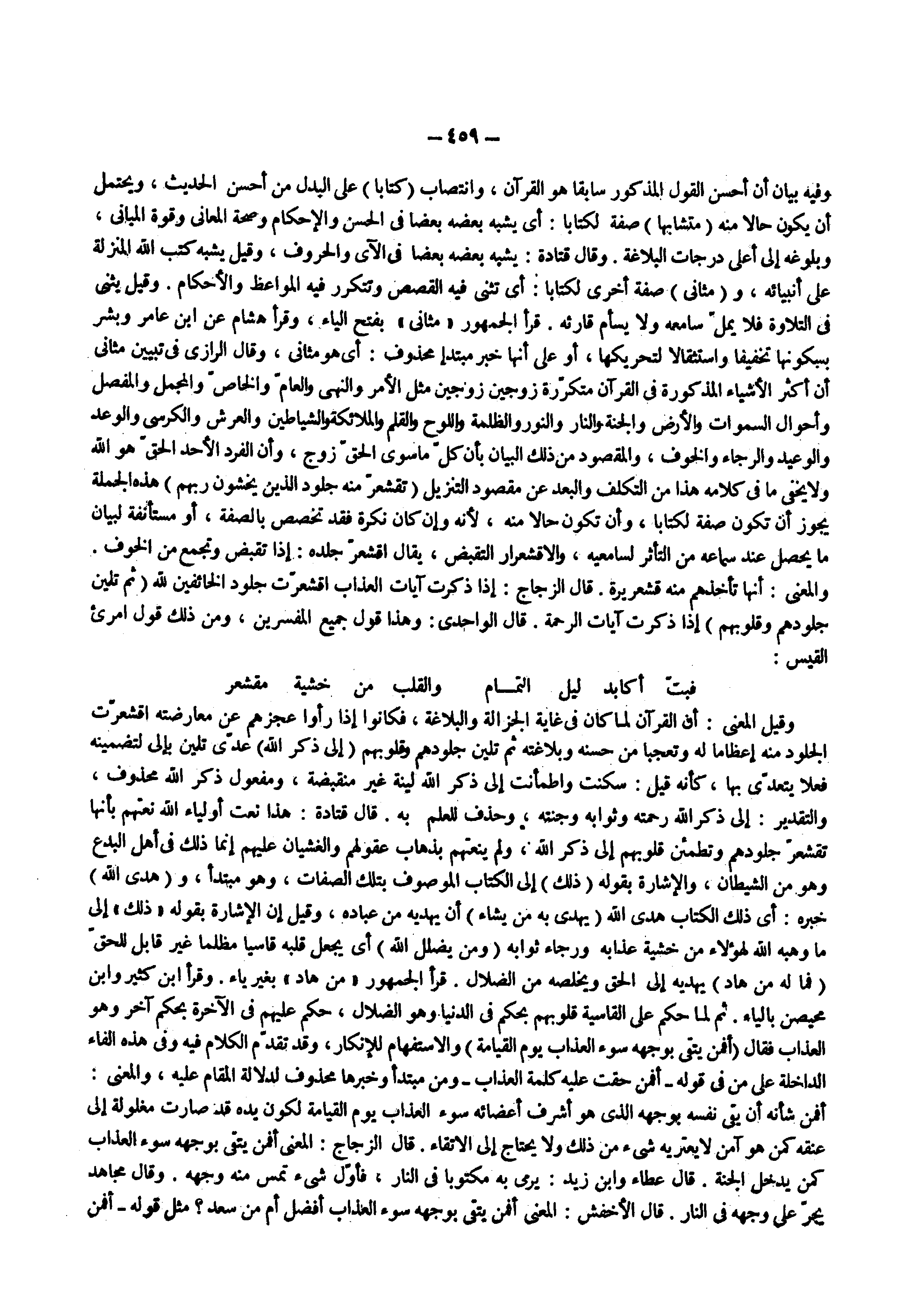 وفيه بيان أن أحسن القول المذكور سابقا هو القرآن وانتصاب كتابا على البدل من أحسن الحديث ويحتمل أن يكون حالا منه متشابها صفة لكتابا أى يشبه بعضه بعضا فى الحسن والإحكام وصحة المعانى وقوة المبانى وبلوغه إلى أعلى درجات البلاغة وقال قتادة يشبه بعضه بعضا فى الآى والحروف وقيل يشبه كتب الله المنزلة على أنبيائه و مثانى صفة أخرى لكتابا أى تثنى فيه القصص وتتكرر فيه المواعظ والأحكام وقيل يثنى فى التلاوة فلا يمل سامعه ولا يسأم قارئه قرأ الجمهور مثانى بفتح الياء وقرأ هشام عن ابن عامر وبشر بسكونها تخفيفا واستثقالا لتحريكها أو على أنها خبر مبتدأ محذوف أى هو مثانى وقال الرازى فى تبيين مثانى أن أكثر الأشياء المذكورة فى القرآن متكررة زوجين زوجين مثل الأمر والنهى والعام والخاص والمجمل والمفصل وأحوال السموات والأرض والجنة والنار والنور والظلمة واللوح والقلم والملائكة والشياطين والعرش والكرسى والوعد والوعيد والرجاء والخوف والمقصود من ذلك البيان بأن كل ما سوى الحق زوج وأن الفرد الأحد الحق هو الله ولا يخفى ما فى كلامه هذا من التكلف والبعد عن مقصود التنزيل ) تقشعر منه جلود الذين يخشون ربهم ( هذه الجملة يجوز أن تكون صفة لكتابا وأن تكون حالا منه لأنه وإن كان نكرة فقد تخصص بالصفة أو مستأنفة لبيان ما يحصل عند سماعه من التأثر لسامعيه والاقشعرار التقبض يقال اقشعر جلده إذا تقبض وتجمع من الخوف والمعنى أنها تأخذهم منه قشعريرة قال الزجاج إذا ذكرت آيات العذاب اقشعرت جلود الخائفين لله ) ثم تلين جلودهم وقلوبهم ( إذا ذكرت آيات الرحمة قال الواحدى وهذا قول جميع المفسرين ومن ذلك قول امرىء القيس فبت أكابد ليل التمام