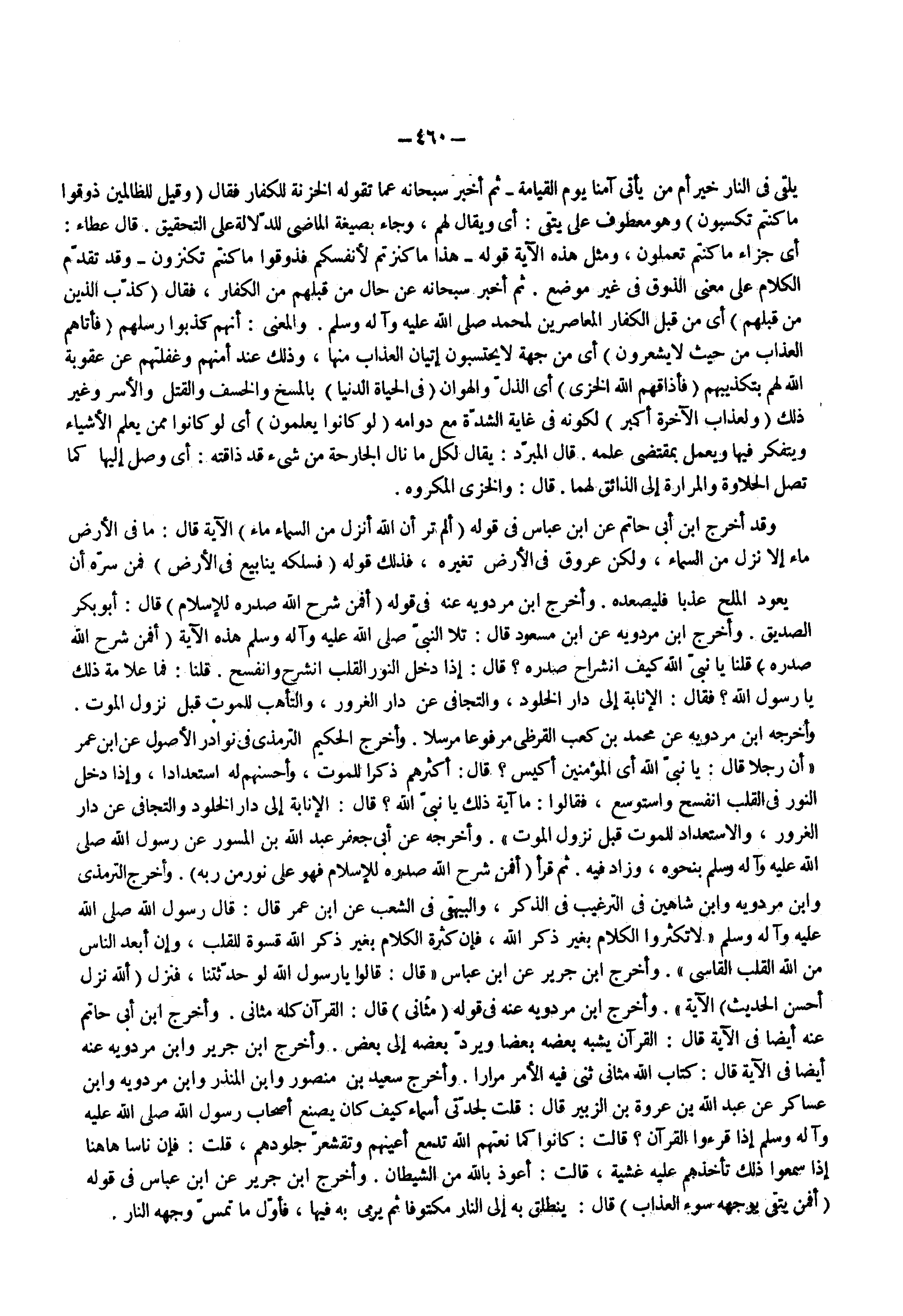 وقد أخرج ابن أبى حاتم عن ابن عباس فى قوله ) ألم تر أن الله أنزل من السماء ماء ( الآية قال ما فى الأرض ماء إلا نزل من السماء ولكن عروق فى الأرض تغيره فذلك قوله ) فسلكه ينابيع في الأرض ( فمن سره أن يعود الملح عذبا فليصعده وأخرج ابن مردويه عنه فى قوله ) أفمن شرح الله صدره للإسلام ( قال أبو بكر الصديق وأخرج ابن مردويه عن ابن مسعود قال تلا النبى ( صلى الله عليه وسلم ) هذه الآية ) أفمن شرح الله صدره ( قلنا يا نبى الله كيف انشراح صدره قال إذا دخل النور القلب انشرح وانفسح قلنا فما علامة ذلك يا رسول الله فقال الإنابة إلى دار الخلود والتجافى عن دار الغرور والتأهب للموت قبل نزول الموت وأخرجه ابن مردويه عن محمد بن كعب القرظى مرفوعا مرسلا وأخرج الحكيم الترمذى فى نوادر الأصول عن ابن عمر أن رجلا قال يا نبى الله أى المؤمنين أكيس قال أكثرهم ذكرا للموت وأحسنهم له استعدادا وإذا دخل النور فى القلب انفسح واستوسع فقالوا ما آية ذلك يا نبى الله قال الإنابة إلى دار الخلود والتجافى عن دار الغرور والاستعداد للموت قبل نزول الموت وأخرجه عن أبى جعفر عبد الله بن المسور عن رسول الله ( صلى الله عليه وسلم ) بنحوه وزاد فيه ثم قرأ ) أفمن شرح الله صدره للإسلام فهو على نور من ربه ( وأخرج الترمذى وابن مردويه وابن شاهين فى الترغيب فى الذكر والبيهقى فى الشعب عن ابن عمر قال قال رسول الله ( صلى الله عليه وسلم ) لا تكثروا الكلام بغير ذكر الله فإن كثرة الكلام بغير ذكر الله قسوة للقلب وإن أبعد الناس من الله القلب القاسى وأخرج ابن جرير عن ابن عباس قال قالوا يا رسول الله لو حدثتنا فنزل ) الله نزل أحسن الحديث ( الآية وأخرج ابن مردويه عنه فى قوله مثانى قال القرآن كله مثانى وأخرج ابن أبى حاتم عنه أيضا فى الآية قال القران يشبه بعضه بعضا ويرد بعضه إلى بعض وأخرج ابن جرير وابن مردويه عنه أيضا في الآية قال كتاب الله مثاني ثنى فيه الأمر مرارا وأخرج سعيد بن منصور وابن المنذر وابن مردويه وابن عساكر عن عبد الله بن عروة بن الزبير قال قلت لجدتى أسماء كيف كان يصنع أصحاب رسول الله ( صلى الله عليه وسلم ) إذا قرءوا القرآن قال كانوا كما نعتهم الله تدمع أعينهم وتقشعر جلودهم قلت فإن ناسا ها هنا إذا سمعوا ذلك تأخذهم عليه غشية قالت أعوذ بالله من الشيطان وأخرج ابن جرير عن ابن عباس فى قوله ) أفمن يتقي بوجهه سوء العذاب ( قال ينطلق به إلى النار مكتوفا ثم يرمى به فيها فأول ما تمس وجهه النار