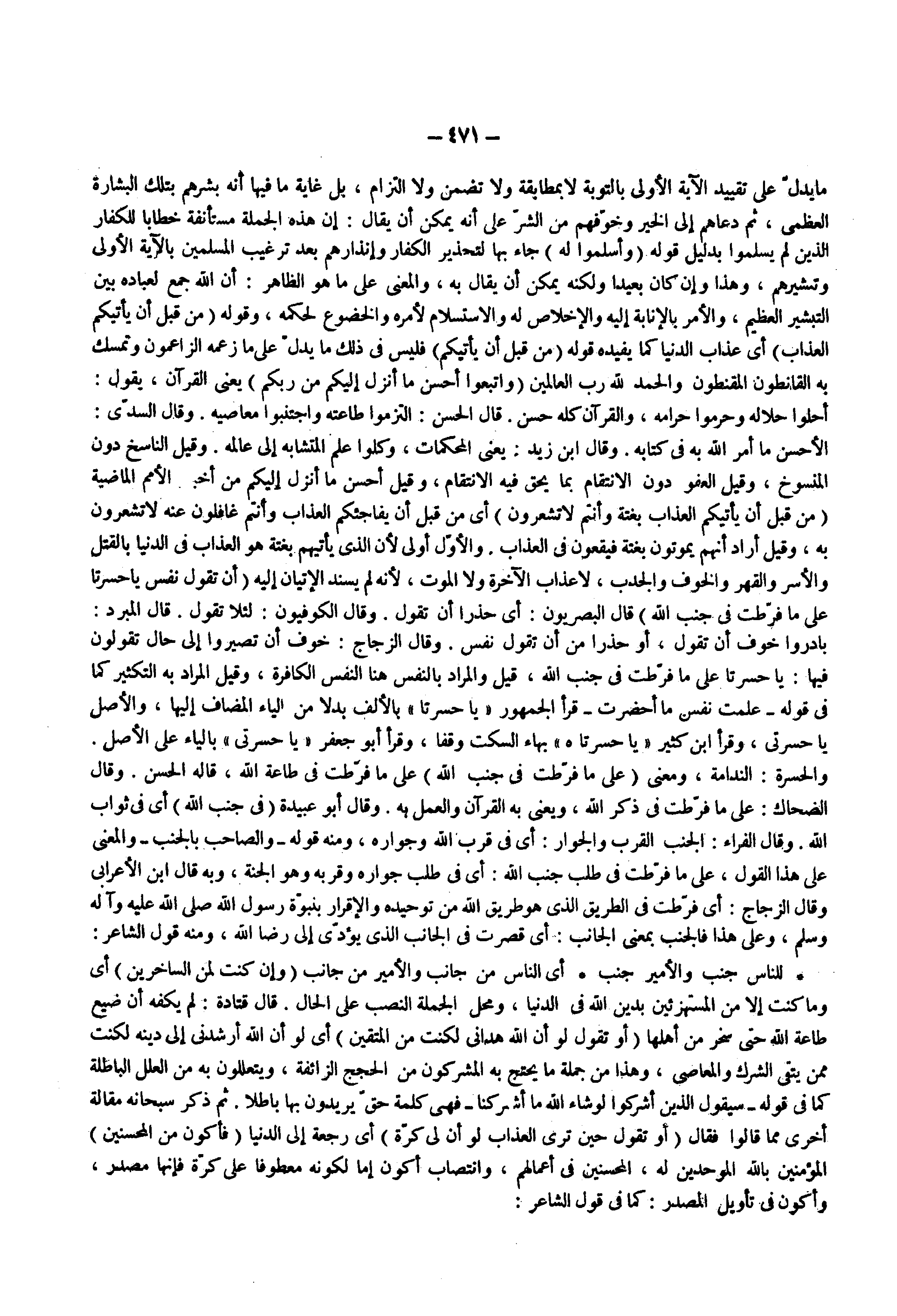 ) أن تقول نفس يا حسرتى على ما فرطت في جنب الله ( قال البصريون أى حذرا أن تقول وقال الكوفيون لئلا تقول قال المبرد بادروا خوف أن تقول أو حذرا من أن تقول نفس وقال الزجاج خوف أن تصيروا إلى حال تقولون فيها يا حسرتا على ما فرطت فى جنب الله قيل والمراد بالنفس هنا النفس الكافرة وقيل المراد به التكثير كما فى قوله ) علمت نفس ما أحضرت ( قرأ الجمهور يا حسرتا بالألف بدلا من الياء المضاف إليها والأصل يا حسرتى وقرأ ابن كثير يا حسرتاه بهاء السكت وقفا وقرأ أبو جعفر يا حسرتى بالياء على الأصل والحسرة الندامة ومعنى ) على ما فرطت في جنب الله ( على ما فرطت فى طاعة الله قال الحسن وقال الضحاك على ما فرطت فى ذكر الله ويعنى به القرآن والعمل به وقال أبو عبيدة ) في جنب الله ( أى فى ثواب الله وقال الفراء الجنب القرب والجوار أى فى قرب الله وجواره ومنه قوله ) والصاحب بالجنب ( والمعنى على هذا القول عى ما فرطت فى طلب جنب الله أى فى طلب جواره وقربه وهو الجنة وبه قال ابن الأعرابى وقال الزجاج أى فرطت فى الطريق الذى هو طريق الله من توحيده والإقرار بنبوة رسول الله ( صلى الله عليه وسلم ) وعلى هذا فالجنب بمعنى الجانب أي قصرت فى الجانب الذى يؤدى إلى رضا الله ومنه قول الشاعر للناس جنب والأمير جنب