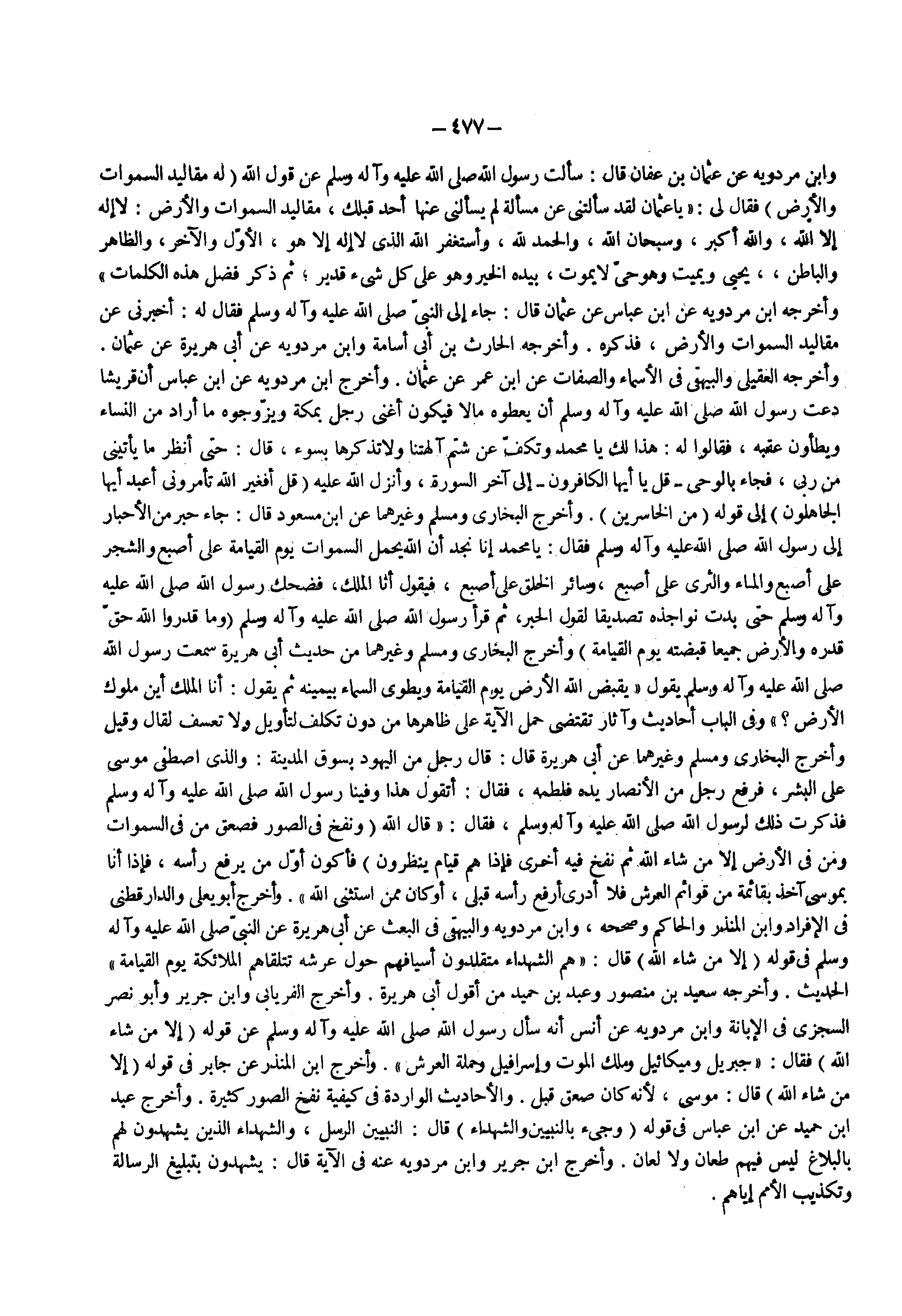 وابن مردويه عن عثمان بن عفان قال سألت رسول الله ( صلى الله عليه وسلم ) عن قول الله ) له مقاليد السماوات والأرض ( فقال لى يا عثمان لقد سألتنى عن مسألة لم يسألنى عنها أحد قبلك مقاليد السموات والأرض لا إله إلا الله والله أكبر وسبحان الله والحمد لله وأستغفر الله الذى لا إله إلا هو الأول والآخر والظاهر والباطن يحيى ويميت وهو حى لا يموت بيده الخير وهو على كل شىء قدير ثم ذكر فضل هذه الكلمات وأخرجه ابن مردويه عن ابن عباس عن عثمان قال جاء إلى النبى ( صلى الله عليه وسلم ) فقال له أخبرنى عن مقاليد السموات والأرض فذكره وأخرجه الحارث بن أبى أسامه وابن مردويه عن أبى هريرة عن عثمان وأخرجه العقيلى والبيهقى فى الأسماء والصفات عن ابن عمر عن عثمان وأخرج ابن مردويه عن ابن عباس أن قريشا دعت رسول الله ( صلى الله عليه وسلم ) أن يعطوه مالا فيكون أغنى رجل بمكة ويزوجوه ما أراد من النساء ويطأون عقبه فقالوا له هذا لك يا محمد وتكف عن شتم آلهتنا ولا تذكرها بسوء قال حتى أنظر ما يأتينى من ربى فجاء بالوحى ) قل يا أيها الكافرون ( إلى آخر السورة وأنزل الله عليه ) قل أفغير الله تأمروني أعبد أيها الجاهلون ( إلى قوله ) من الخاسرين ( وأخرج البخارى ومسلم وغيرهما عن ابن مسعود قال جاء حبر من الأحبار إلى رسول الله ( صلى الله عليه وسلم ) فقال يا محمد إنا نجد أن الله يحمل السموات يوم القيامة على أصبع والشجر على أصبع والماء والثرى على أصبع وسائر الخلق عى أصبع فيقول أنا الملك فضحك رسول الله ( صلى الله عليه وسلم ) حتى بدت نواجذه تصديقا لقول الحبر ثم قرأ رسول الله ( صلى الله عليه وسلم ) ) وما قدروا الله حق قدره والأرض جميعا قبضته يوم القيامة ( وأخرج البخارى ومسلم وغيرهما من حديث أبى هريرة سمعت رسول الله ( صلى الله عليه وسلم ) يقول يقبض الله الأرض يوم القيامة ويطوى السماء بيمينه ثم يقول أنا الملك أين ملوك الأرض وفى الباب أحاديث وآثار تقتضى حمل الاية على ظاهرها من دون تكلف لتأويل ولا تعسف لقال وقيل وأخرج البخارى ومسلم وغيرهما عن أبى هريرة قال قال رجل من اليهود بسوق المدينة والذى اصطفى موسى على البشر فرفع رجل من الأنصار يده فلطمه فقال أتقول هذا وفينا رسول الله ( صلى الله عليه وسلم ) فذكرت ذلك لرسول الله ( صلى الله عليه وسلم ) فقال قال الله ) ونفخ في الصور فصعق من في السماوات ومن في الأرض إلا من شاء الله ثم نفخ فيه أخرى فإذا هم قيام ينظرون ( فأكون أول من يرفع رأسه فإذا أنا بموسى آخذ بقائمة من قوائم العرش فلا أدرى أرفع رأسه قبلى أو كان ممن استثنى الله وأخرج أبو يعلى والدارقطنى فى الإفراد وابن المنذر والحاكم وصححه وابن مردويه والبيهقى فى البعث عن أبى هريرة عن النبى ( صلى الله عليه وسلم ) فى قوله ) إلا من شاء الله ( قال هم الشهداء متقلدون أسيافهم حول عشره تتلقاهم الملائكة يوم القيامة الحديث وأخرجه سعيد بن منصور وعبد بن حميد من أقوال أبى هريرة وأخرج الفريابى وابن جرير وأبو نصر السجزى فى الإبانة وابن مردويه عن أنس أنه سأل رسول الله ( صلى الله عليه وسلم ) عن قوله ) إلا من شاء الله ( فقال جبريل وميكائيل وملك الموت وإسرافيل وحملة العرش وأخرج ابن المنذر عن جابر فى قوله ) إلا من شاء الله ( قال موسى لأنه كان صعق قبل والأحاديث الواردة فى كيفية نفخ الصور كثيرة وأخرج عبد ابن حميد عن ابن عباس فى قوله ) وجيء بالنبيين والشهداء ( قال النبيين الرسل والشهداء الذين يشهدون لهم بالبلاغ ليس فيهم طعان ولا لعان وأخرج ابن جرير وابن مردويه عنه فى الآية قال يشهدون بتبليغ الرسالة وتكذيب الأمم إياهم