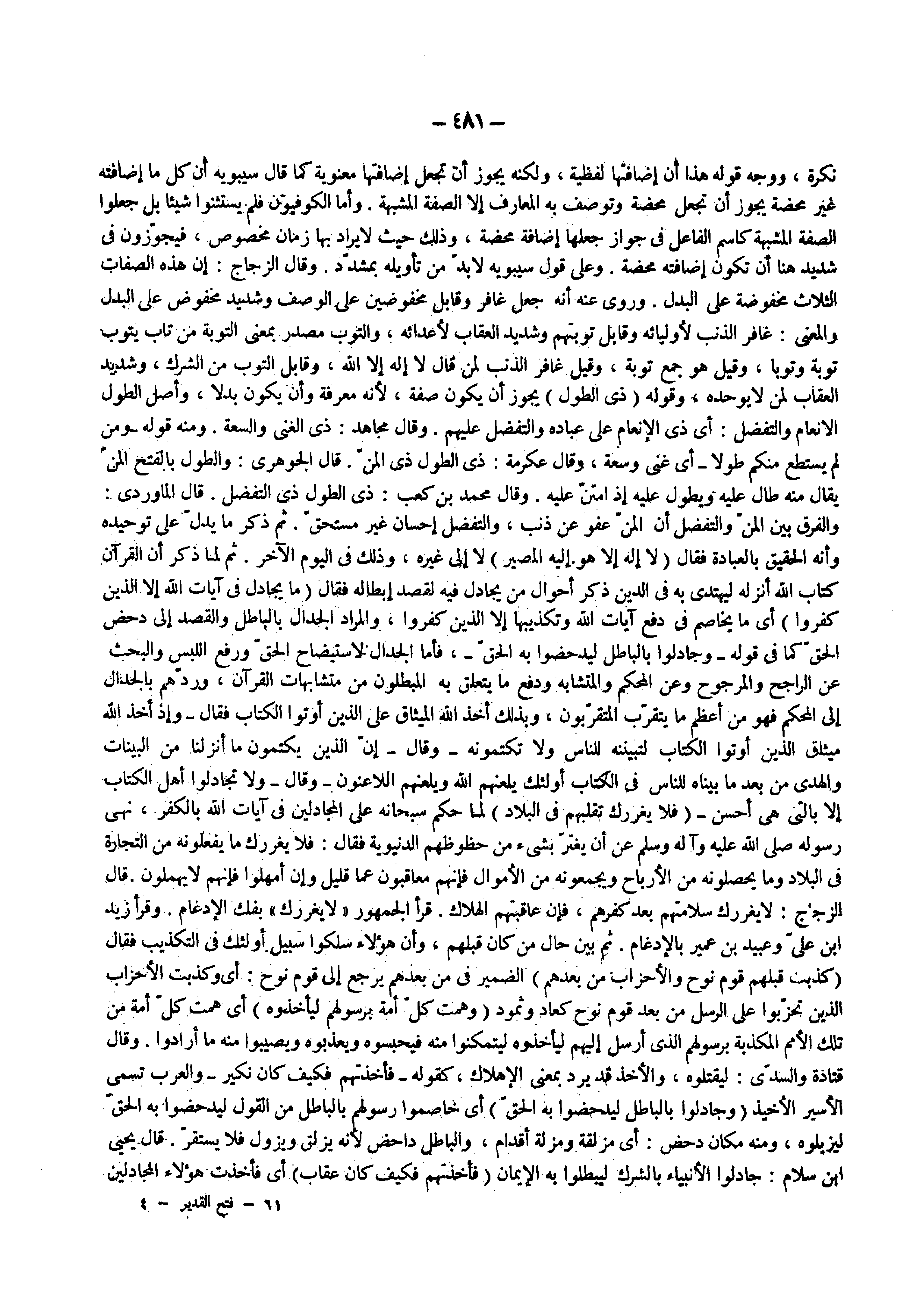 نكرة ووجه قوله هذا أن إضافتها لفظية ولكنه يجوز أن تجعل إضافتها معنوية كما قال سيبويه أن كل ما إضافته غير محضة يجوز أن تجعل محضة وتوصف به المعارف إلا الصفة المشبهة وأما الكوفيون فلم يستثنوا شيئا بل جعلوا الصفة المشبهة كاسم الفاعل فى جواز جعلها إضافة محضة وذلك حيث لا يراد بها زمان مخصوص فيجوزون فى شديد هنا أن تكون إضافته محضة وعلى قول سيبويه لا بد من تأويله بمشدد وقال الزجاج إن هذه الصفات الثلاث مخفوضة على البدل وروى عنه أنه جعل غافر وقابل مخفوضين على الوصف وشديد مخفوض على البدل والمعنى غافر الذنب لأوليائه وقابل توبتهم وشديد العقاب لأعدائه والتوب مصدر بمعنى التوبة من تاب يتوب توبة وتوبا وقيل هو جمع توبة وقيل غافر الذنب لمن قال لا إله إلا الله وقابل التوب من الشرك وشديد العقاب لمن لا يوحده وقوله ) ذي الطول ( يجوز أن يكون صفة لأنه معرفة وأن يكون بدلا وأصل الطول الانعام والتفضل أى ذى الإنعام على عباده والتفضل عليهم وقال مجاهد ذى الغنى والسعة ومنه قوله ) ومن لم يستطع منكم طولا ( أى غنى وسعة وقال عكرمة ذى الطول ذى المن قال الجوهرى والطول بالفتح المن يقال منه طال عليه ويطول عليه إذا امتن عليه وقال محمد بن كعب ذى الطول ذى التفضل قال الماوردى والفرق بين المن والتفضل أن المن عفو عن ذنب والتفضل إحسان غير مستحق ثم ذكر ما يدل على توحيده وأنه الحقيق بالعبادة فقال ) لا إله إلا هو إليه المصير ( لا إلى غيره وذلك فى اليوم الآخر