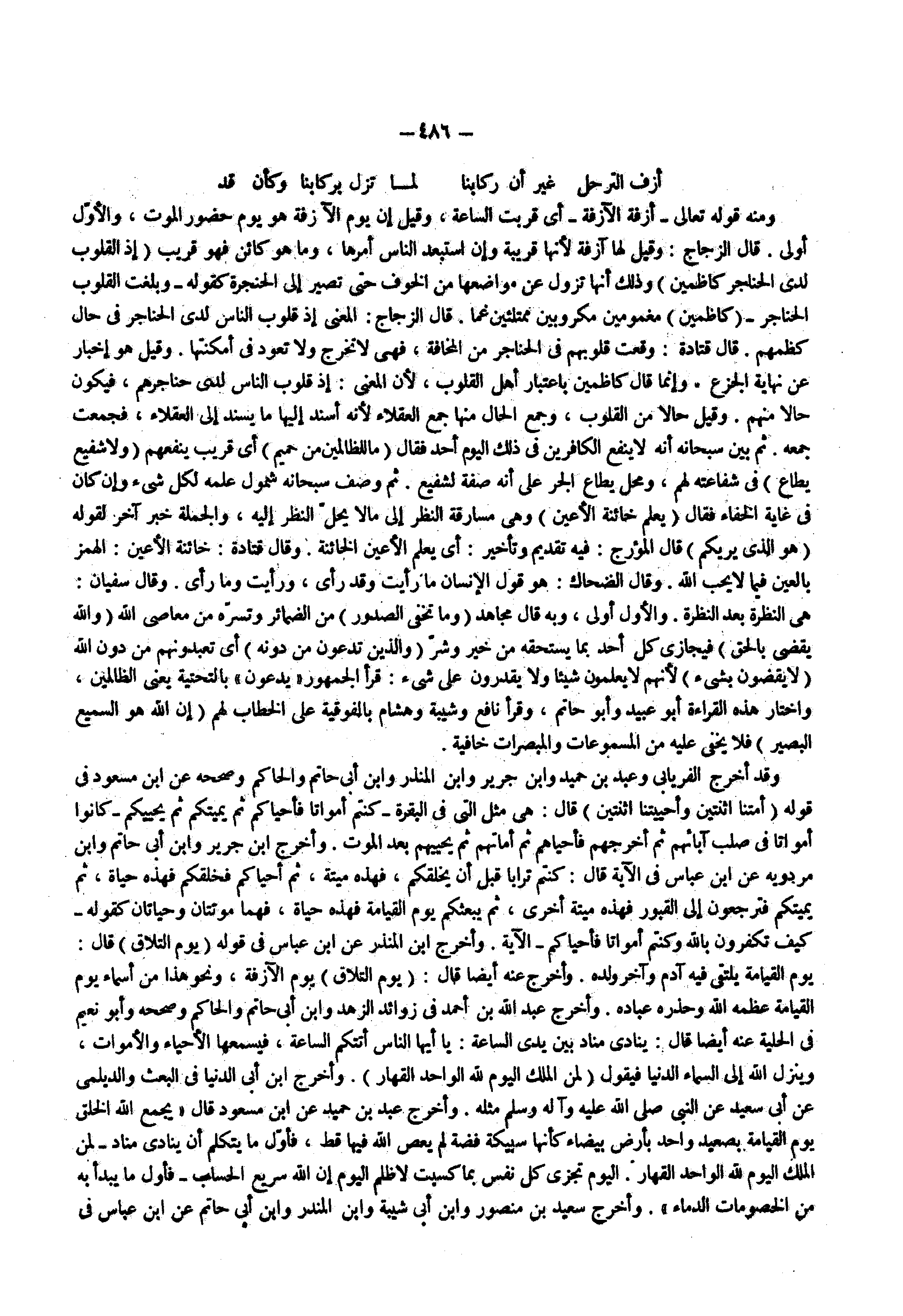 وقد أخرج الفريابى وعبد بن حميد وابن جرير وابن المنذر وابن أبى حاتم والحاكم وصححه عن ابن مسعود فى قوله ) أمتنا اثنتين وأحييتنا اثنتين ( قال هى مثل التى في البقرة ) وكنتم أمواتا فأحياكم ثم يميتكم ثم يحييكم ( كانوا أمواتا فى صلب آبائهم ثم أخرجهم فأحياهم ثم أماتهم ثم يحييهم بعد الموت وأخرج ابن جرير وابن أبى حاتم وابن مردويه عن ابن عباس فى الآية قال كنتم ترابا قبل أن يخلقكم فهذه ميتة ثم أحياكم فخلقكم فهذه حياة ثم يميتكم فترجعون إلى القبور فهذه ميتة أخرى ثم يبعثكم يوم القيامة فهذه حياة فهما موتتان وحياتان كقوله ) كيف تكفرون بالله وكنتم أمواتا فأحياكم ( الآية وأخرج ابن المنذر عن ابن عباس فى قوله ) يوم التلاق ( قال يوم القيامة يلتقى فيه آدم وآخر ولده وأخرج عنه أيضا قال ) يوم التلاق ( يوم الأزفة ونحو هذا من أسماء يوم القيامة عظمه الله وحذره عباده وأخرج عبد الله بن أحمد فى زوائد الزهد وابن أبى حاتم والحاكم وصححه وأبو نعيم فى الحلية عنه أيضا قال ينادى مناد بين يدى الساعة يا أيها الناس أتتكم الساعة فيسمعها الأحياء والأموات وينزل الله إلى السماء الدنيا فيقول ) لمن الملك اليوم لله الواحد القهار ( وأخرج ابن أبى الدنيا فى البعث والديلمى عن أبى سعيد عن النبى ( صلى الله عليه وسلم ) مثله وأخرج عبد بن حميد عن ابن مسعود قال يجمع الله الخلق يوم القيامة بصعيد واحد بأرض بيضاء كأنها سبيكة فضة لم يعص الله فيها قط فأول ما يتكلم أن ينادى مناد ) لمن الملك اليوم لله الواحد القهار اليوم تجزى كل نفس بما كسبت لا ظلم اليوم إن الله سريع الحساب ( فأول ما يبدأ به من الخصومات الدماء وأخرج سعيد بن منصور وابن أبى شيبة وابن المنذر وابن أبى حاتم عن ابن عباس فى