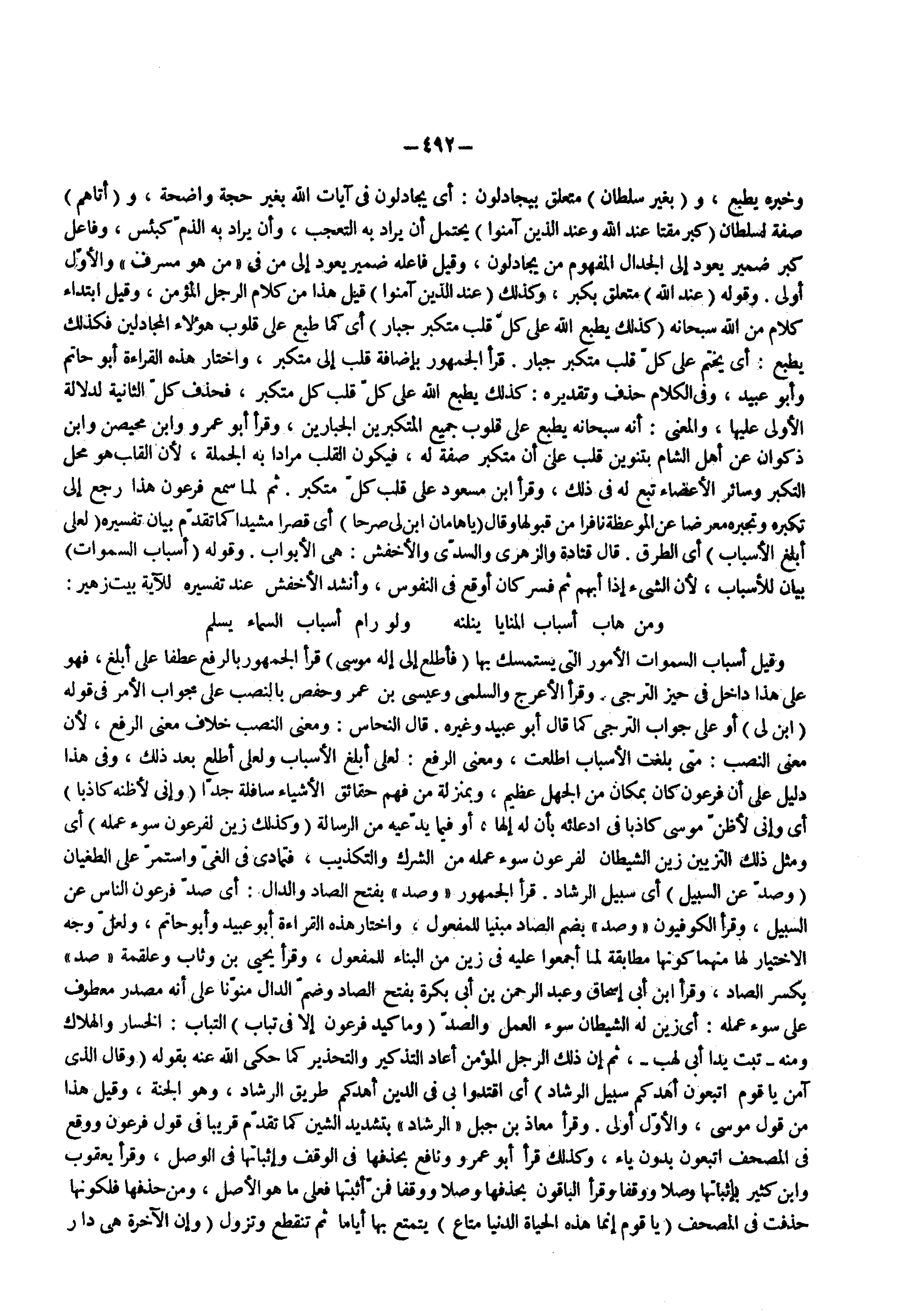 وقيل أسباب السموات الأمور التى يستمسك بها ) فأطلع إلى إله موسى ( قرأ الجمهور بالرفع عطفا على أبلغ فهو على هذا داخل فى حيز الترجى وقرأ الأعرج والسلمى وعيسى بن عمر وحفص بالنصب على جواب الأمر فى قوله ) ابن لي ( أو على جواب الترجى كما قال أبو عبيد وغيره قال النحاس ومعنى النصب خلاف معنى الرفع لأن معنى النصب متى بلغت الأسباب اطلعت ومعنى الرفع لعلى أبلغ الأسباب ولعلى أطلع بعد ذلك وفى هذا دليل أن فرعون كان بمكان من الجهل عظيم وبمنزلة من فهم حقائق الأشياء سافلة جدا ) وإني لأظنه كاذبا ( أى وإنى لأظن موسى كاذبا فى ادعائه بأن له إلها أو فيما يدعيه من الرسالة ) وكذلك زين لفرعون سوء عمله ( أى ومثل ذلك التزيين زين الشيطان لفرعون سوء عمله من الشرك والتكذيب فتمادى فى الغى واستمر على الطغيان ) وصد عن السبيل ( أى سبيل الرشاد قرأ الجمهور وصد بفتح الصاد والدال أى صد فرعون الناس عن السبيل وقرأ الكوفيون وصد بضم الصاد مبنيا للمفعول واختار هذه القراءة أبو عبيد وأبو حاتم ولعل وجه الاختيار لها منهما كونها مطابقة لما أجمعوا عليه فى زين من البناء للمفعول وقرأ يحيى بن وثاب وعلقمة صد بكسر الصاد وقرأ ابن أبى إسحاق وعبد الرحمن بن أبى بكرة بفتح الصاد وضم الدال منونا على أنه مصدر معطوف على سوء عمله أى زين له الشيطان سوء العمل والصد ) وما كيد فرعون إلا في تباب ( التباب الخسار والهلاك ومنه ) تبت يدا أبي لهب )