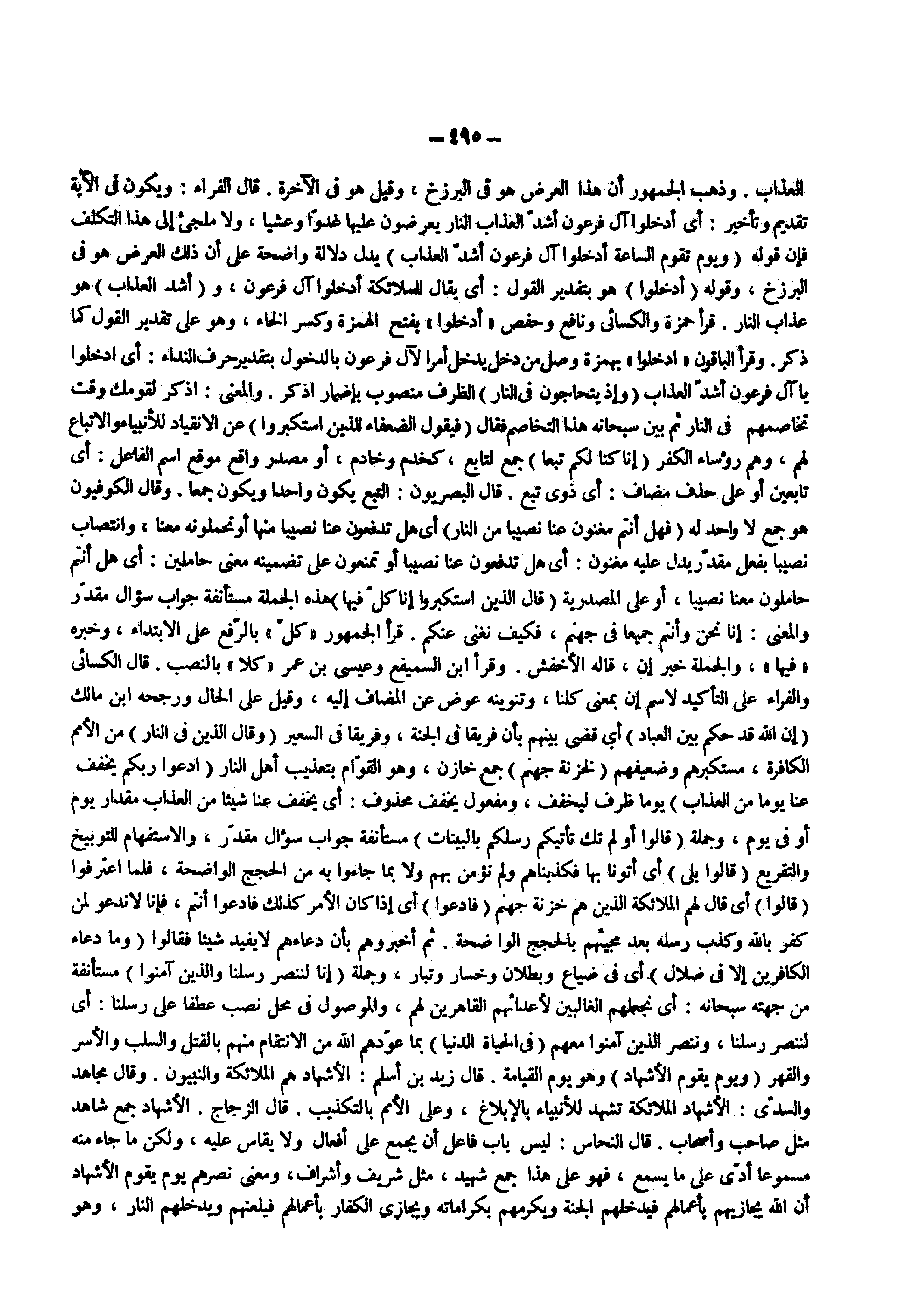 العذاب وذهب الجمهور أن هذا العرض هو فى البرزخ وقيل هو فى الآخرة قال الفراء ويكون فى الآية تقديم وتأخير أى أدخلوا آل فرعون أشد العذاب النار يعرضون عليها غدوا وعشيا ولا ملجىء إلى هذا التكلف فإن قوله ) ويوم تقوم الساعة أدخلوا آل فرعون أشد العذاب ( يدل دلالة واضحة على أن ذلك العرض هو فى البرزخ وقوله ) ادخلوا ( هو بتقدير القول أى يقال للملائكة أدخلوا آل فرعون و ) أشد العذاب ( هو عذاب النار قرأ حمزة والكسائى ونافع وحفص ) ادخلوا ( بفتح الهمزة وكسر الخاء وهو على تقدير القول كما ذكر وقرأ الباقون ادخلوا بهمزة وصل من دخل يدخل أمرا لآل فرعون بالدخول بتقدير حرف النداء أى ادخلوا يا آل فرعون أشد العذاب