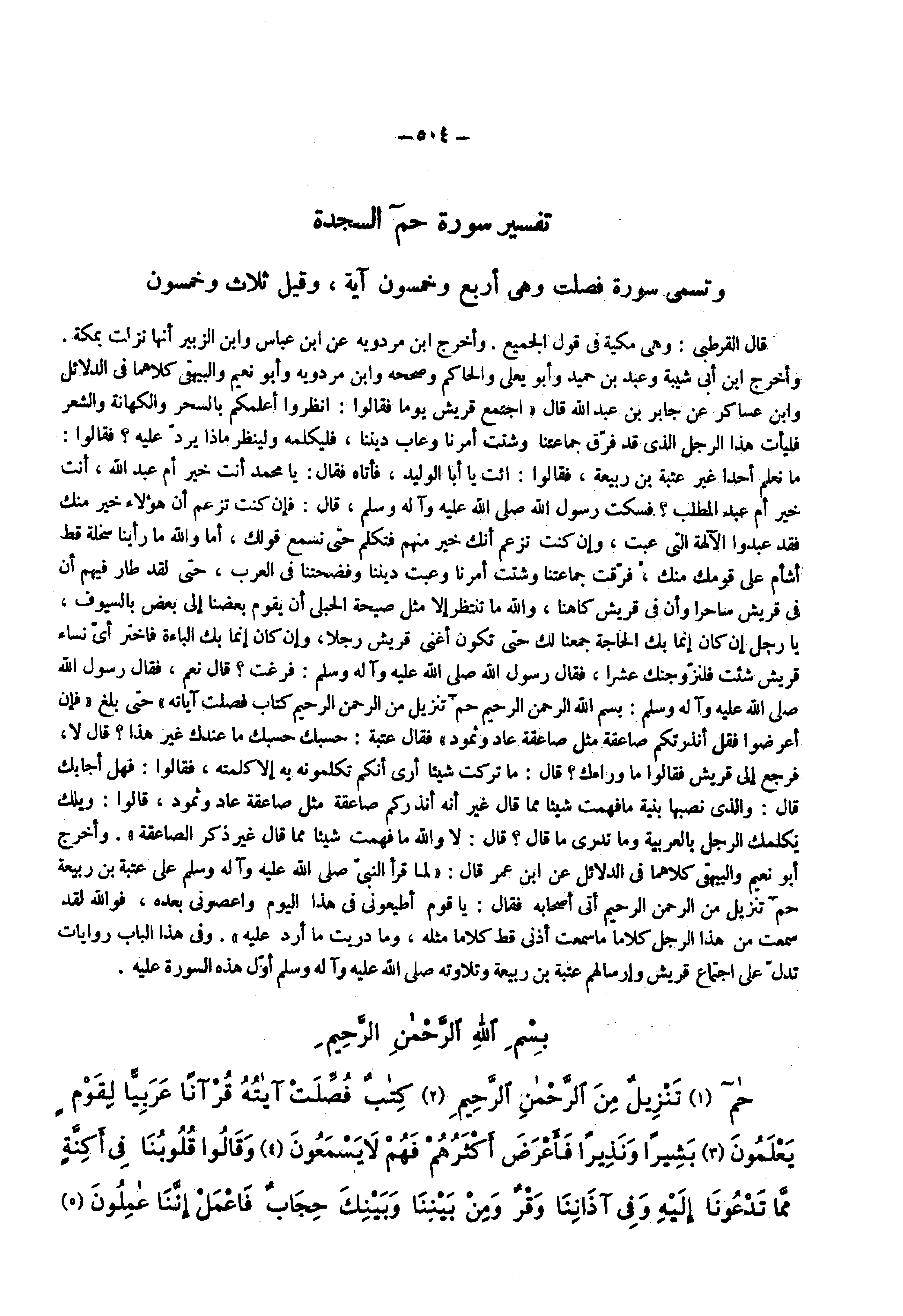 قال القرطبى وهى مكية فى قول الجميع وأخرج ابن مردويه عن ابن عباس وابن الزبير أنها نزلت بمكة وأخرج ابن أبى شيبة وعبد بن حميد وأبو يعلى والحاكم وصححه وابن مردويه وأبو نعيم والبيهقى كلاهما فى الدلائل وابن عساكر عن جابر بن عبد الله قال اجتمع قريش يوما فقالوا انظروا أعلمكم بالسحر والكهانة والشعر فليأت هذا الرجل الذى قد فرق جماعتنا وشتت أمرنا وعاب ديننا فليكلمه ولينظر ماذا يرد عليه فقالوا ما نعلم أحدا غير عتبة بن ربيعة فقالوا ائت يا أبا الوليد فأتاه فقال يا محمد أنت خير أم عبد الله أنت خير أم عبد المطلب فسكت رسول الله ( صلى الله عليه وسلم ) قال فإن كنت تزعم أن هؤلاء خير منك فقد عبدوا الآلهة التى عبت وإن كنت تزعم أنك خير منهم فتكلم حتى نسمع قولك أما والله ما رأينا سخلة قط أشأم على قومك منك فرقت جماعتنا وشتت أمرنا وعبت ديننا وفضحتنا فى العرب حتى لقد طار فيهم أن فى قريش ساحرا وأن فى قريش كاهنا والله ما تنتظر إلا مثل صيحة الحبلى أن يقوم بعضنا إلى بعض بالسيوف يا رجل إن كان إنما بك الحاجة جمعنا لك حتى تكون أغنى قريش رجلا وإن كان إنما بك الباءة فاختر أى نساء قريش شئت فلنزوجنك عشرا فقال رسول الله ( صلى الله عليه وسلم ) فرغت قال نعم فقال رسول الله ( صلى الله عليه وسلم ) بسم الله الرحمن الرحيم ) حم تنزيل من الرحمن الرحيم كتاب فصلت آياته ( حتى بلغ ) فإن أعرضوا فقل أنذرتكم صاعقة مثل صاعقة عاد وثمود ( فقال عتبة حسبك حسبك ما عندك غير هذا قال لا فرجع إلى قريش فقالوا ما وراءك قال ما تركت شيئا أرى أنكم تكلمونه به إلا كلمته فقالوا فهل أجابك قال والذى نصبها بنية ما فهمت شيئا مما قال غير أنه أنذركم صاعقة مثل صاعقة عاد وثمود قالوا ويلك يكلمك الرجل بالعربية وما تدرى ما قال قال لا والله ما فهمت شيئا مما قال غير ذكر الصاعقة وأخرج أبو نعيم والبيهقى كلاهما فى الدلائل عن ابن عمر قال لما قرأ النبى ( صلى الله عليه وسلم ) على عتبة بن ربيعة حم تمزيل من الرحمن الرحيم أتى أصحابه فقال يا قوم أطيعونى فى هذا اليوم واعصونى بعده فوالله لقد سمعت من هذا الرجل كلاما ما سمعت أذنى قط كلاما مثله وما دريت ما أرد عليه وفى هذا الباب روايات تدل على اجتماع قريش وإرسالهم عتبة بن ربيعة وتلاوته ( صلى الله عليه وسلم ) أول هذه السورة عليه