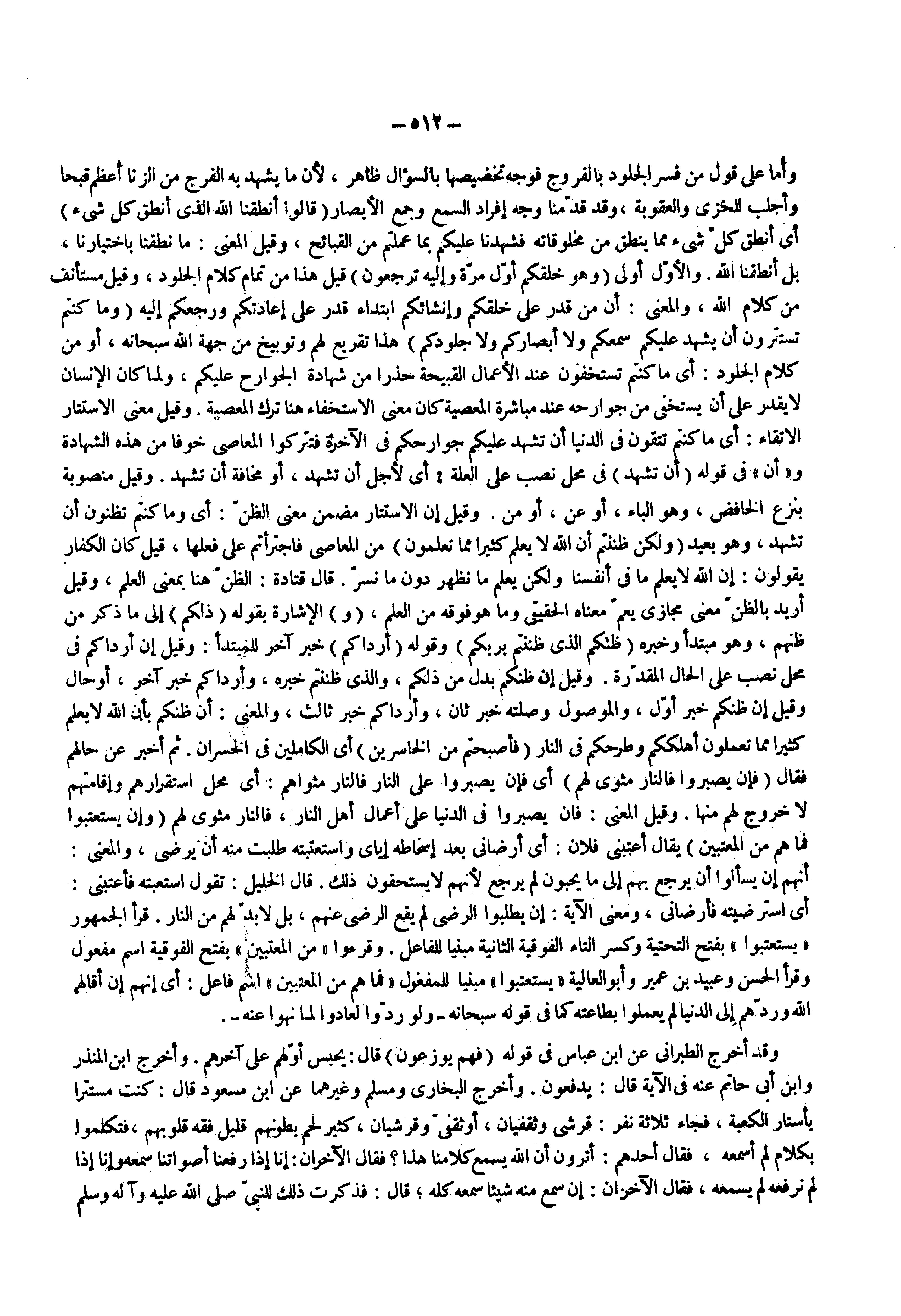 وقد أخرج الطبرانى عن ابن عباس فى قوله ) فهم يوزعون ( قال يحبس أولهم على آخرهم وأخرج ابن المنذر وابن أبى حاتم عنه فى الاية قال يدفعون وأخرج البخارى ومسلم وغيرهما عن ابن مسعود قال كنت مستترا بأستار الكعبة فجاء ثلاثة نفر قرشى وثقفيان أو ثقفى وقرشيان كثير لحم بطونهم قليل فقه قلوبهم فتكلموا بكلام لم أسمعه فقال أحدهم أترون أن الله يسمع كلامنا هذا فقال الآخران إنا إذا رفعنا أصواتنا سمعه وإنا إذا لم نرفعه لم يسمعه فقال الآخران إن سمع منه شيئا سمعه كله قال فذكرت ذلك للنبى ( صلى الله عليه وسلم )
