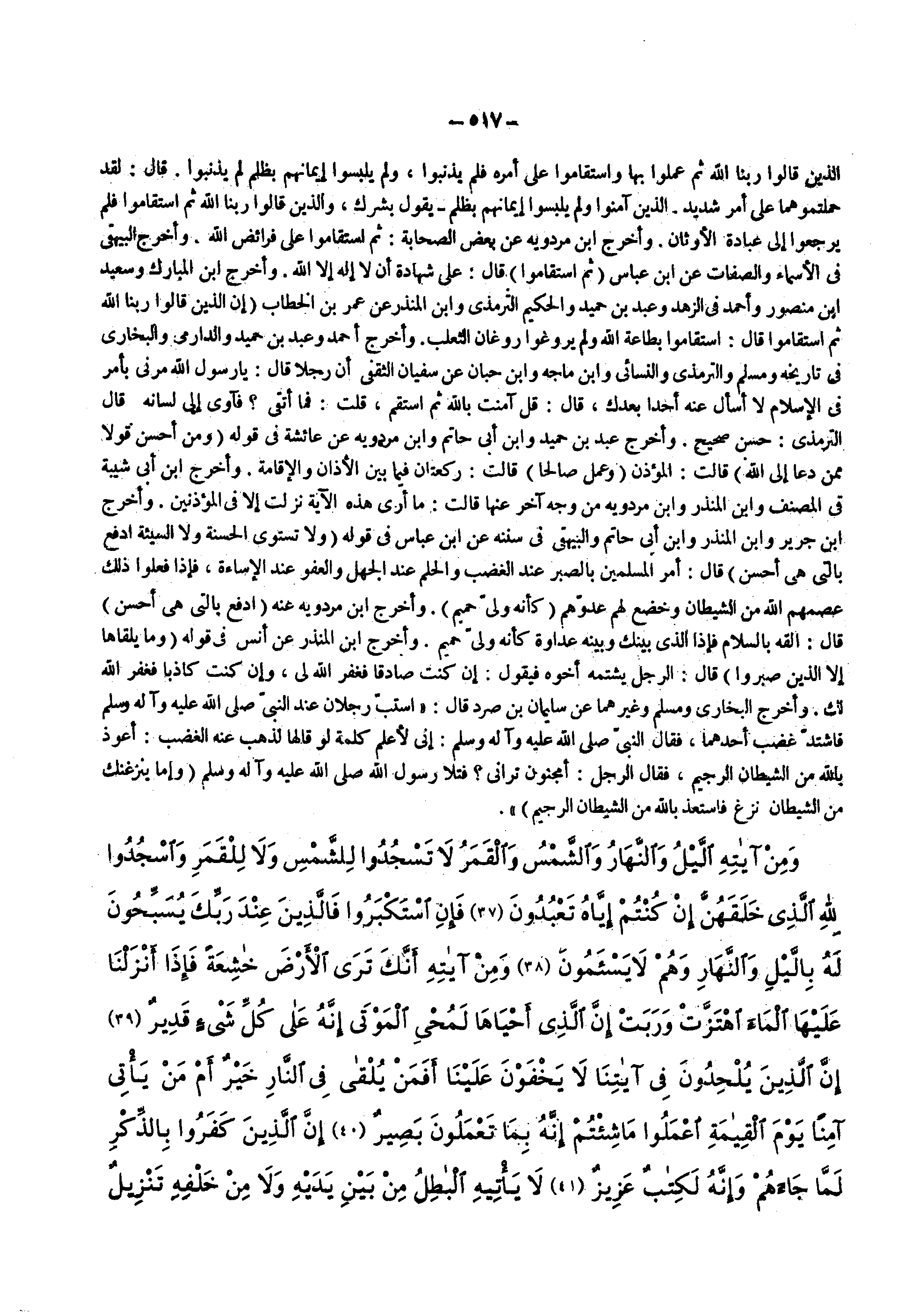 الذين قالوا ربنا الله ثم عملوا بها واستقاموا على أمره فلم يذنبوا ولم يلبسوا إيمانهم بظلم لم يذنبوا قال لقد حملتموهما على أمر شديد ) الذين آمنوا ولم يلبسوا إيمانهم بظلم ( يقول بشرك والذين قالوا ربنا الله ثم استقاموا فلم يرجعوا إلى عبادة الأوثان وأخرج ابن مردويه عن بعض الصحابة ثم استقاموا على فرائض الله وأخرج البيهقى فى الأسماء والصفات عن ابن عباس ) ثم استقاموا ( قال على شهادة أن لا إله إلا الله وأخرج ابن المبارك وسعيد ابن منصور وأحمد فى الزهد وعبد بن حميد والحكيم الترمذى وابن المنذر عن عمر بن الخطاب ) إن الذين قالوا ربنا الله ثم استقاموا ( قال استقاموا بطاعة الله ولم يروغوا روغان الثعلب وأخرج أحمد وعبد بن حميد والدارمى والبخارى فى تاريخه ومسلم والترمذى والنسائى وابن ماجه وابن حبان عن سفيان الثقفى أن رجلا قال يا رسول الله مرنى بأمر فى الإسلام لا أسأل عنه أحدا بعدك قال قل آمنت بالله ثم استقم قلت فما أتقى فآوى إلى لسانه قال الترمذي حسن صحيح وأخرج عبد بن حميد وابن أبى حاتم وابن مردويه عن عائشة فى قوله ) ومن أحسن قولا ممن دعا إلى الله ( قالت المؤذن ) وعمل صالحا ( قالت ركعتان فيما بين الأذان والإقامة وأخرج ابن أبى شيبة فى المصنف وابن المنذر وابن مردويه من وجه آخر عنها قالت ما أرى هذه الآية نزلت إلا فى المؤذنين وأخرج ابن جرير وابن المنذر وابن أبى حاتم والبيهقى فى سننه عن ابن عباس فى قوله ) ولا تستوي الحسنة ولا السيئة ادفع بالتي هي أحسن ( قال أمر المسلمين بالصبر عند الغضب والحلم عند الجهل والعفو عند الإساءة فإذا فعلوا ذلك عصمهم الله من الشيطان وخضع لهم عدوهم ) كأنه ولي حميم ( وأخرج ابن مردويه عنه ) ادفع بالتي هي أحسن ( قال القه بالسلام فإذا الذى بينك وبينه عداوة كأنه ولى حميم وأخرج ابن المنذر عن أنس فى قوله ) وما يلقاها إلا الذين صبروا ( قال الرجل يشتمه أخوه فيقول إن كنت صادقا فغفر الله لى وإن كنت كاذبا فغفر الله لك وأخرج البخارى ومسلم وغيرهما عن سليمان بن صرد قال استب رجلان عند النبى ( صلى الله عليه وسلم ) فاشتد غضب أحدهما فقال النبى ( صلى الله عليه وسلم ) إنى لأعلم كلمة لو قالها لذهب عنه الغضب أعوذ بالله من الشيطان الرجيم فقال الرجل أمجنون ترانى فتلا رسول الله ( صلى الله عليه وسلم ) ) وإما ينزغنك من الشيطان نزغ فاستعذ بالله إنه هو السميع العليم )