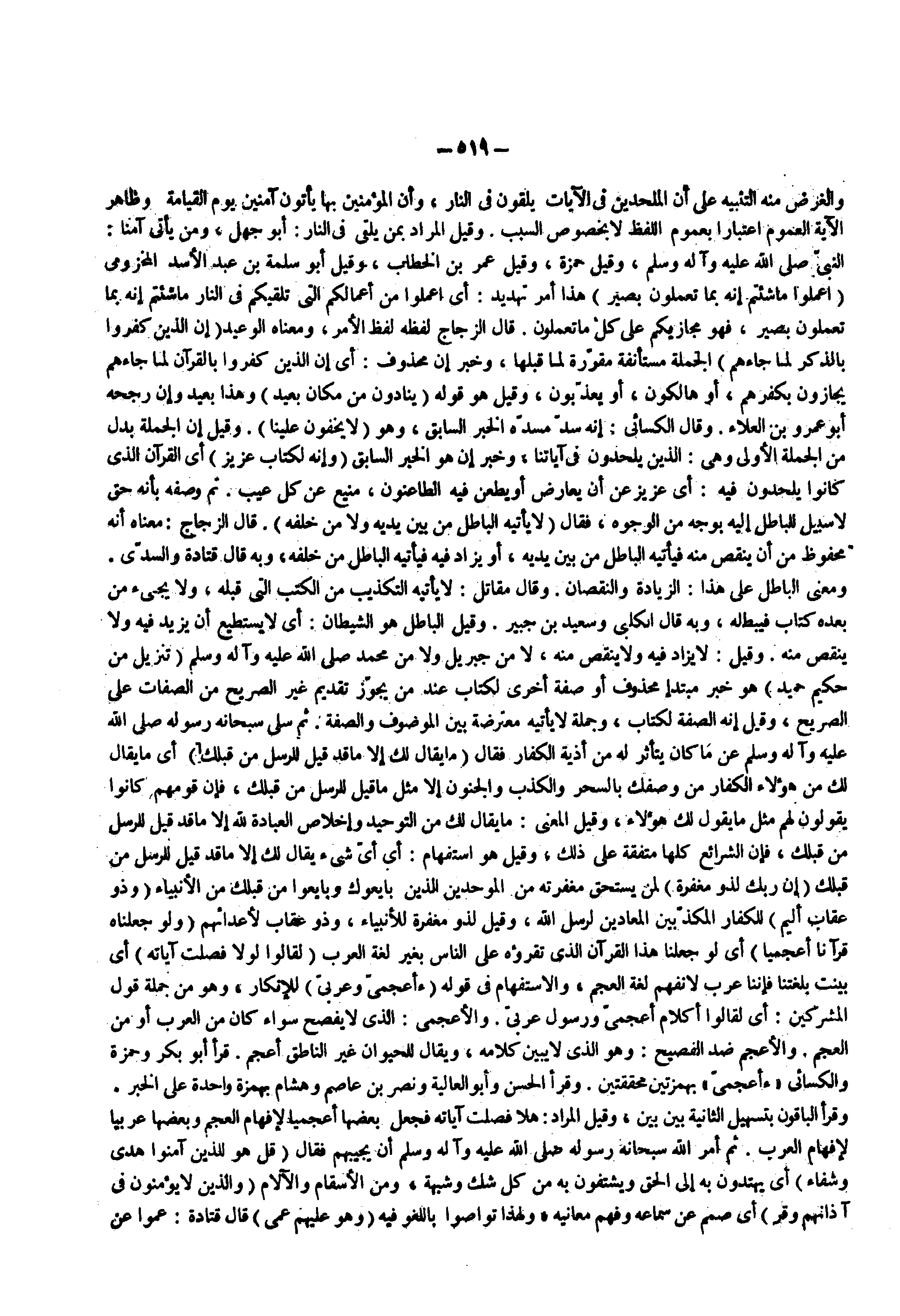 ) إن الذين كفروا بالذكر لما جاءهم ( الجملة مستأنفة مقررة لما قبلها وخبر إن محذوف أى إن الذين كفروا بالقرآن ما جاءهم يجازون بكفرهم أو هالكون أو يعذبون وقيل هو قوله ) ينادون من مكان بعيد ( وهذا بعيد وإن رجحه أبو عمرو بن العلاء وقال الكسائى إنه سد مسده الخبر السابق وهو ) لا يخفون علينا ( وقيل إن الجملة بدل من الجملة الأولى وهى الذين يلحدون فى آياتنا وخبر إن هو الخبر السابق ) وإنه لكتاب عزيز ( أى القرآن الذى كانوا يلحدون فيه أى عزيز عن أن يعارض أو يطعن فيه الطاعنون منيع عن كل عيب