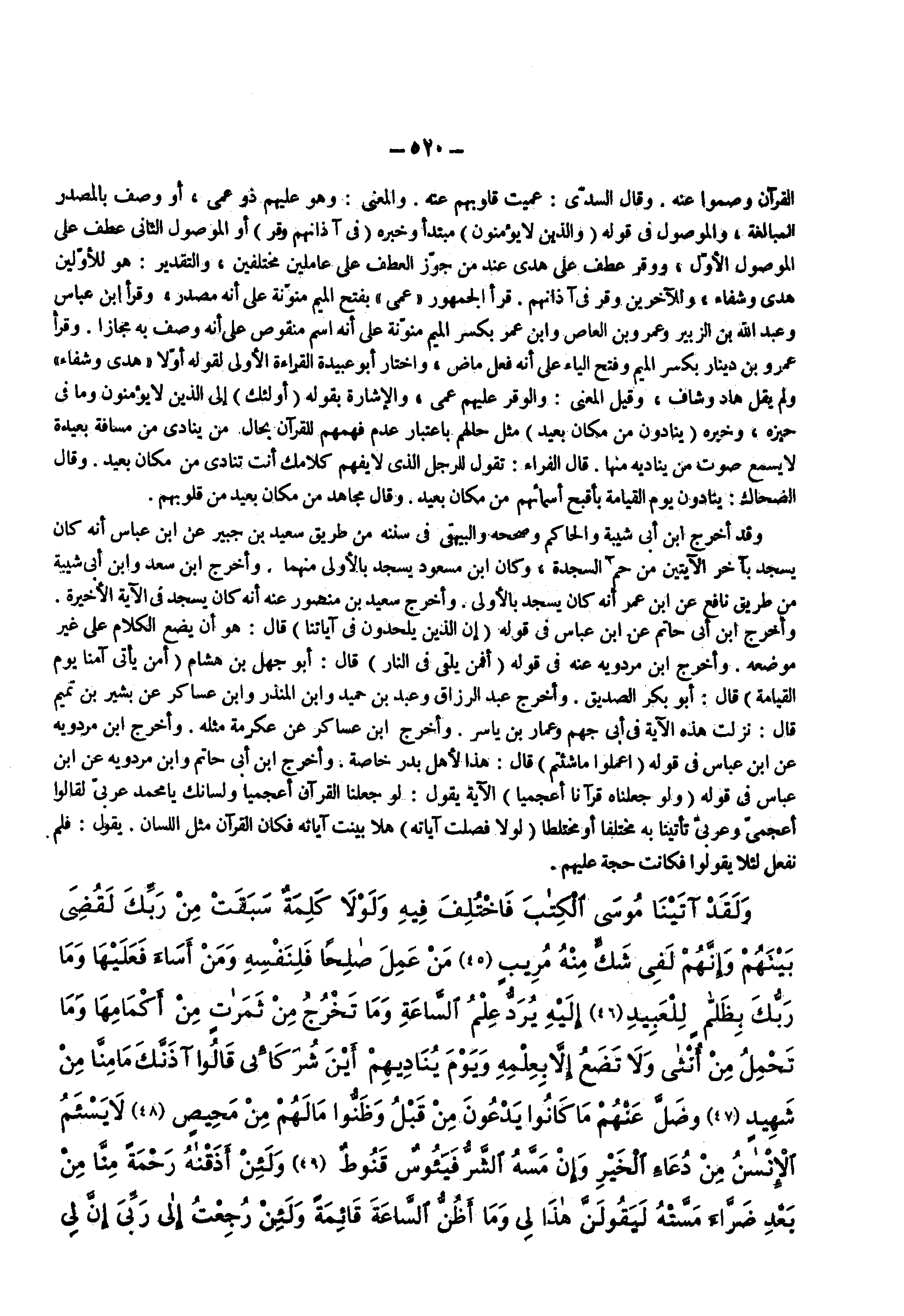 وقد أخرج ابن أبى شيبة والحاكم وصححه والبيهقى فى سننه من طريق سعيد بن جبير عن ابن عباس أنه كان يسجد بآخر الآيتين من حم السجدة وكان ابن مسعود يسجد بالأولى منهما وأخرج ابن سعد وابن أبى شيبة من طريق نافع عن ابن عمر أنه كان يسجد بالأولى وأخرج سعيد بن منصور عنه أنه كان يسجد فى الآية الأخيرة وأخرج ابن أبى حاتم عن ابن عباس فى قوله ) إن الذين يلحدون في آياتنا ( قال هو أن يضع الكلام على غير موضعه وأخرج ابن مردويه عنه فى قوله ) أفمن يلقى في النار ( قال أبو جهل بن هشام ) أم من يأتي آمنا يوم القيامة ( قال أبو بكر الصديق وأخرج عبد الرزاق وعبد بن حميد وابن المنذر وابن عساكر عن بشير بن تميم قال نزلت هذه الاية فى أبى جهم وعمار بن ياسر وأخرج ابن عساكر عن عكرمة مثله وأخرج ابن مردويه عن ابن عباس فى قوله ) اعملوا ما شئتم ( قال هذا لأهل بدر خاصة وأخرج ابن أبى حاتم وابن مردويه عن ابن عباس فى قوله ) ولو جعلناه قرآنا أعجميا ( الآية يقول لو جعلنا القرآن أعجميا ولسانك يا محمد عربى لقالوا أعجمى وعربى تأتينا به مختلفا أو مختلطا ) لولا فصلت آياته ( هلا بينت آياته فكان القرآن مثل اللسان يقول فلم نفعل لئلا يقولوا فكانت حجة عليهم سورة السجدة ( 45 54 )