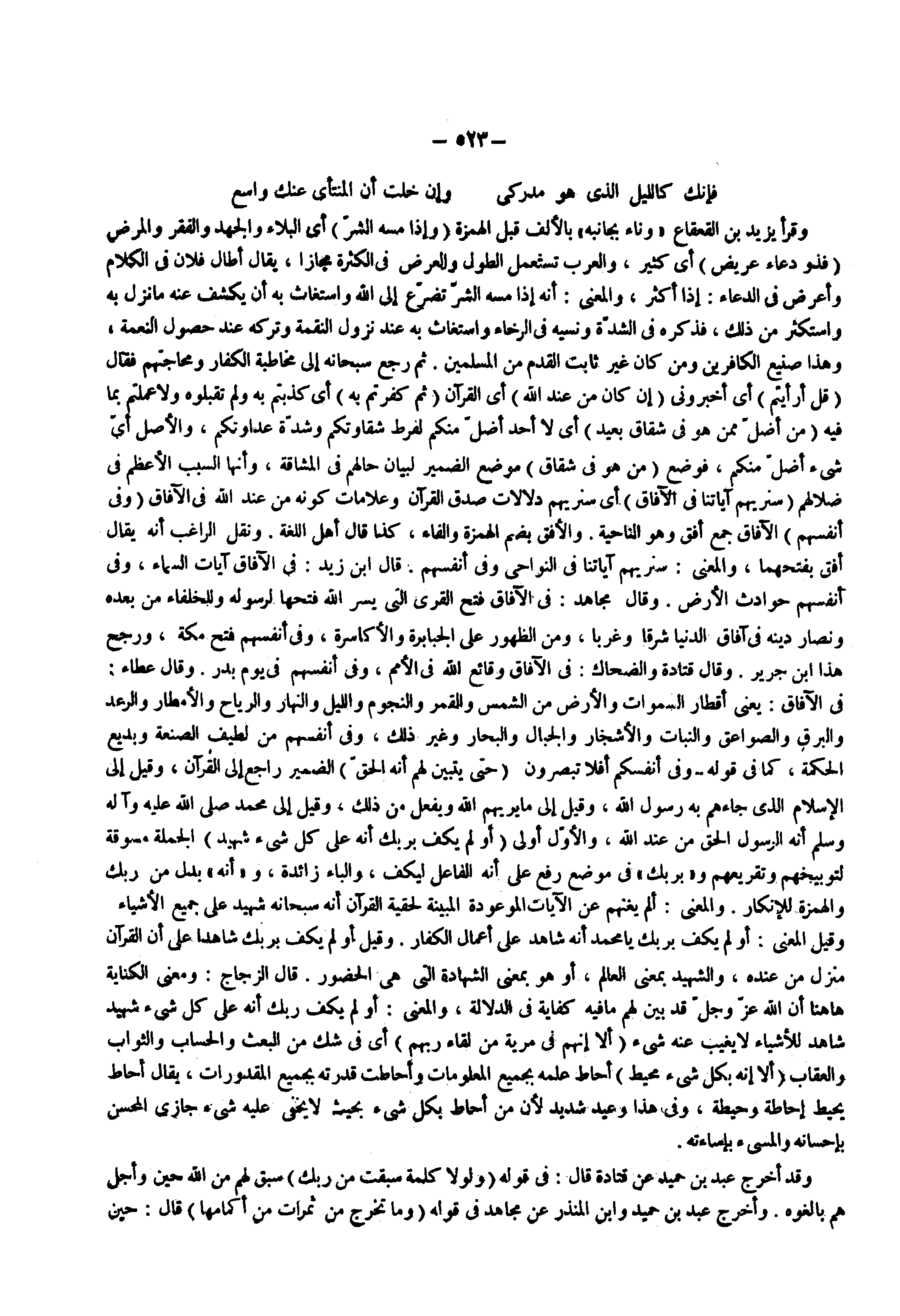 ) سنريهم آياتنا في الآفاق ( أى سنريهم دلالات صدق القرآن وعلامات كونه من عند الله فى الآفاق ) وفي أنفسهم ( الآفاق جمع أفق وهو الناحية والأفق بضم الهمزة والفاء كذا قال أهل اللغة ونقل الراغب أنه يقال أفق بفتحهما والمعنى سنريهم آياتنا فى النواحى وفى أنفسهم قال ابن زيد فى الآفاق آيات السماء وفى أنفسهم حوادث الأرض وقال مجاهد فى الآفاق فتح القرى التى يسر الله فتحها لرسوله وللخلفاء من بعده ونصار دينه فى آفاق الدنيا شرقا وغربا ومن الظهور على الجبابرة والأكاسرة وفى أنفسهم فتح مكة ورجح هذا ابن جرير وقال قتادة والضحاك فى الآفاق وقائع الله فى الأمم وفى أنفسهم فى يوم بدر وقال عطاء فى الآفاق يعنى أقطار السموات والأرض من الشمس والقمر والنجوم والليل والنهار والرياح والأمطار والرعد والبرق والصواعق والنبات والأشجار والجبال والبحار وغير ذلك وفى أنفسهم من لطيف الصنعة وبديع الحكمة كما فى قوله وفى أنفسكم أفلا تبصرون ) حتى يتبين لهم أنه الحق ( الضمير راجع إلى اقرآن وقيل إلى الإسلام الذى جاءهم به رسول الله وقيل إلى ما يريهم الله ويفعل من ذلك وقيل إلى محمد ( صلى الله عليه وسلم ) أنه الرسول الحق من عند الله والأول أولى ) أولم يكف بربك أنه على كل شيء شهيد ( الجملة مسوقة لتوبيخهم وتقريعهم ) بربك ( فى موضع رفع على أنه الفاعل ليكف والباء زائدة و أنه بدل من ربك والهمزة للإنكار والمعنى ألم يغنهم عن الآيات الموعودة المبينة لحقية القرآن أنه سبحانه شهيد على جميع الأشياء وقيل المعنى أولم يكف بربك يا محمد أنه شاهد على أعمال الكفار وقيل أولم يكف بربك شاهدا على أن القرآن منزل من عنده والشهيد بمعنى العالم أو هو بمعنى الشهادة التى هى الحضور قال الزجاج ومعنى الكناية ها هنا أن الله عز وجل قد بين لهم ما فيه كفاية فى الدلالة والمعنى أولم يكف ربك أنه على كل شىء شهيد شاهد للأشياء لا يغيب عنه شىء