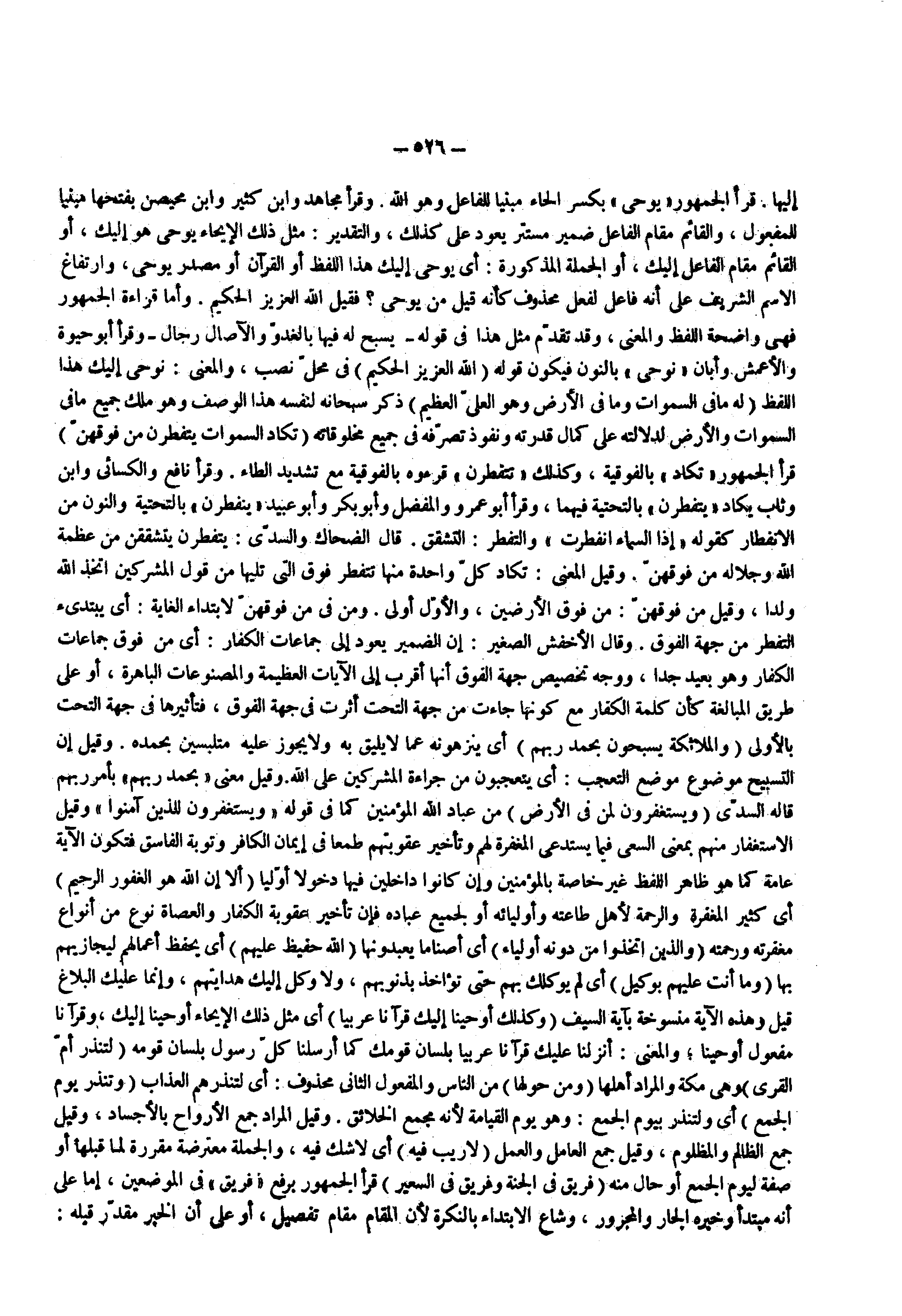 ) تكاد السماوات يتفطرن من فوقهن ( قرأ الجمهور ) تكاد ( بالفوقية وكذلك ) يتفطرن ( قرءوه بالفوقية مع تشديد الطاء وقرأ نافع والكسائى وابن وثاب يكاد ) يتفطرن ( بالتحتية فيهما وقرأ أبو عمرو والمفضل وأبو بكر وأبو عبيد ) يتفطرن ( بالتحتية والنون من الانفطار كقوله ) إذا السماء انفطرت ( والتفطر التشقق قال الضحاك والسدى يتفطرن يتشققن من عظمة الله وجلاله من فوقهن وقيل المعنى تكاد كل واحدة منها تتفطر فوق التى تليها من قول المشركين اتخذ الله ولدا وقيل من فوقهن من فوق الأرضين والأول أولى ومن فى ) من فوقهن ( لابتداء الغاية أى يبتدىء التفطر من جهة الفوق وقال الأخفش الصغير إن الضمير يعود إلى جماعات الكفار أى من فوق جماعات الكفار وهو بعيد جدا ووجه تخصيص جهة الفوق أنها أقرب إلى الآيات العظيمة والمصنوعات الباهرة أو على طريق المبالغة كأن كلمة الكفار مع كونها جاءت من جهة التحت أثرت فى جهة الفوق فتأثيرها فى جهة التحت بالأولى ) والملائكة يسبحون بحمد ربهم ( أى ينزهونه عما لا يليق به ولا يجوز عليه متلبسين بحمده وقيل إن التسبيح موضوع موضع التعجب أى يتعجبون من جراءة المشركين على الله وقيل معنى ) بحمد ربهم ( بأمر ربهم قاله السدى ) ويستغفرون لمن في الأرض ( من عباد الله المؤمنين كما فى قوله ) ويستغفرون للذين آمنوا ( وقيل الاستغفار منهم بمعنى السعى فيما يستدعى المغفرة لهم وتأخير عقوبتهم طمعا فى إيمان الكافر وتوبة الفاسق فتكون الآية عامة كما هو ظاهر اللفظ غير خاصة بالمؤمنين وإن كانوا داخلين فيها دخولا أوليا ) ألا إن الله هو الغفور الرحيم ( أى كثير المغفرة والرحمة لأهل طاعته وأوليائه أو لجميع عباده فإن تأخير عقوبة الكفار والعصاة نوع من أنواع مغفرته ورحمته