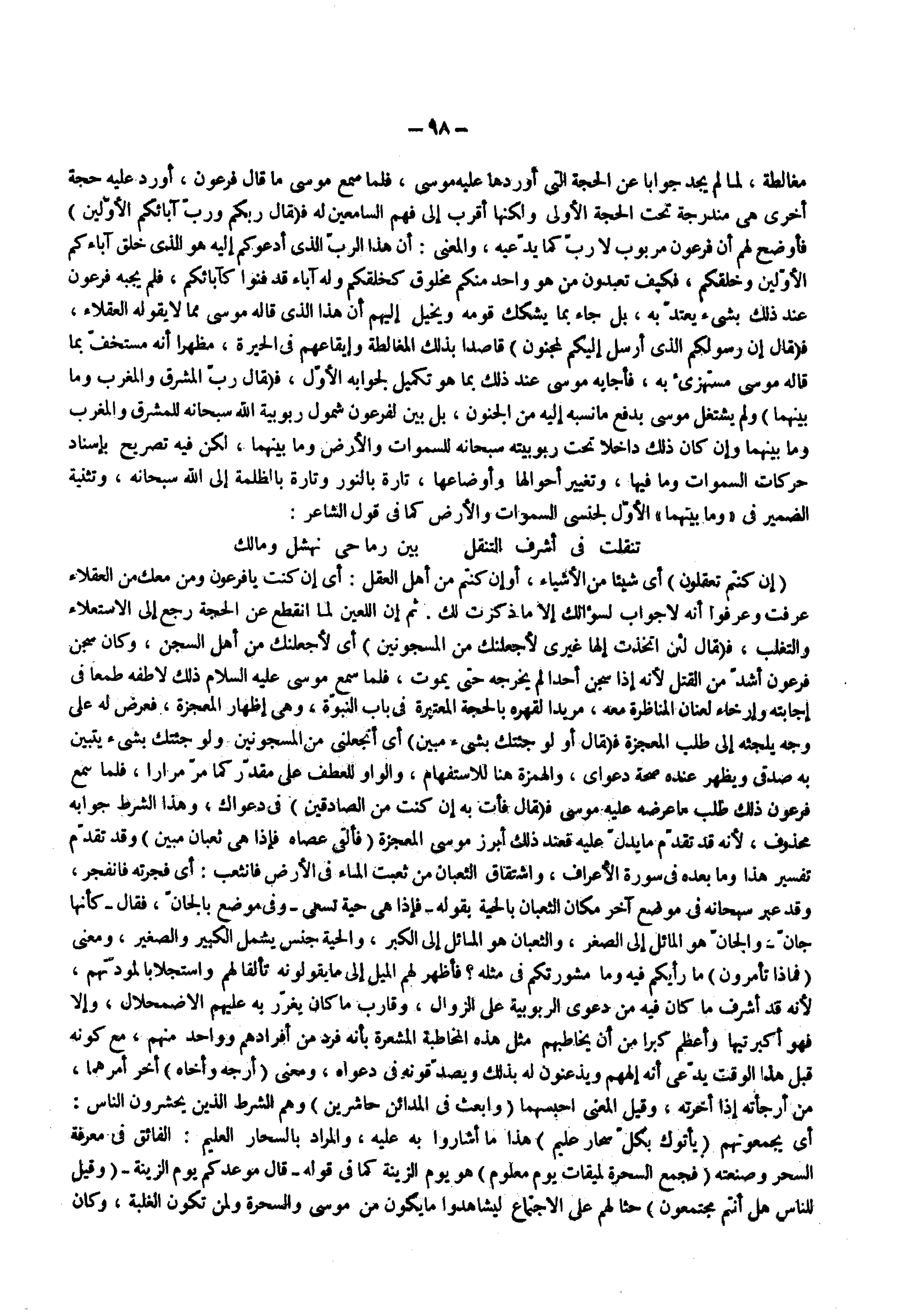 فأجابه موسى عند ذلك بما هو تكميل لجوابه الأول ف ) قال رب المشرق والمغرب وما بينهما ( ولم يشتغل موسى بدفع ما نسبه إليه من الجنون بل بين لفرعون شمول ربوبية الله سبحانه للمشرق والمغرب وما بينهما وإن كان ذلك داخلا تحت ربوبيته سبحانه للسموات والأرض وما بينهما لكن فيه تصريح بإسناد حركات السموات وما فيها وتغيير أحوالها وأوضاعها تارة بالنور وتارة بالظلمة إلى الله سبحانه وتثنية الضمير فى وما بينهما الأول لجنسى السموات والأرض كما في قول الشاعر تنقلت فى أشرف التنقل
