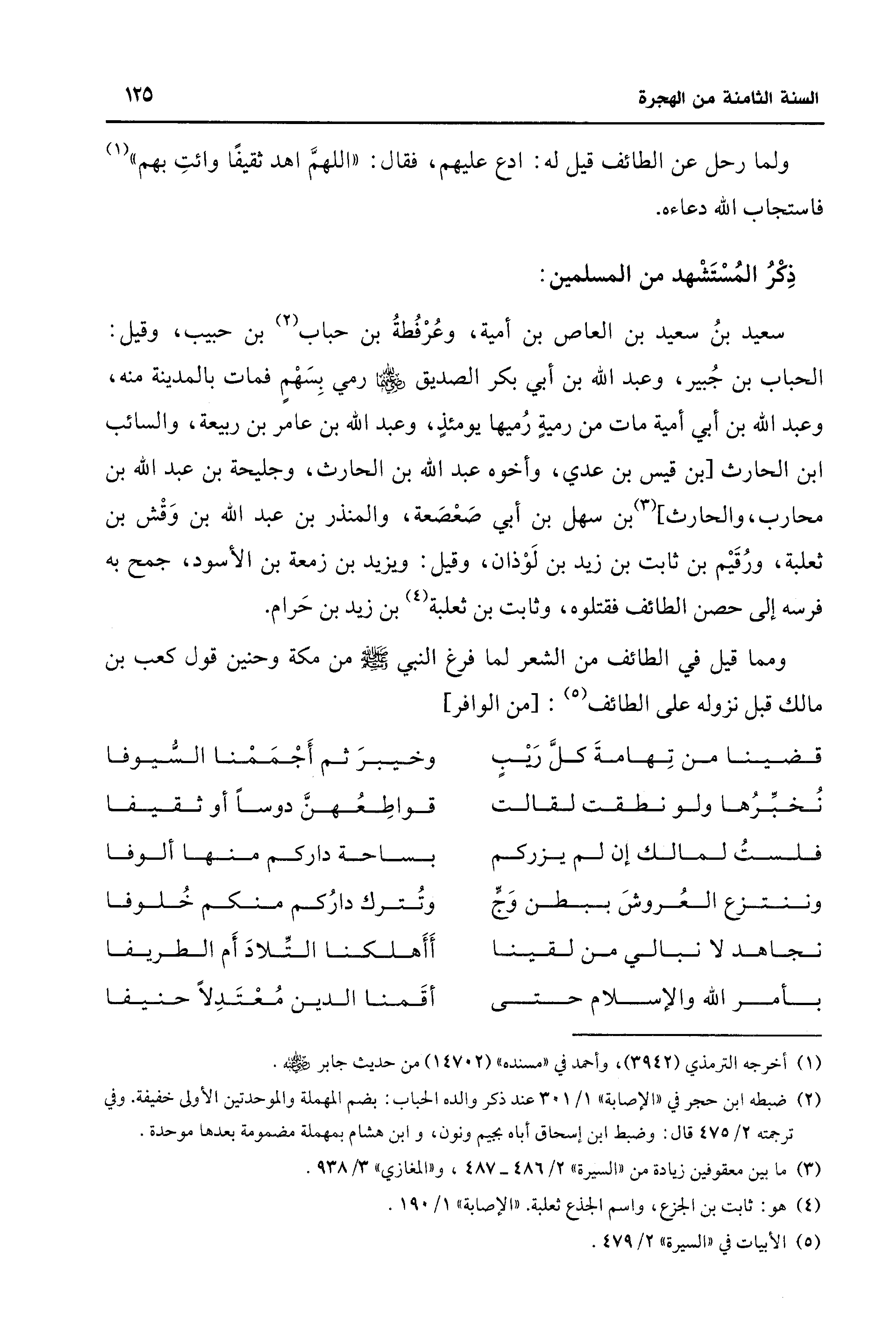 سعيد بنُ سعيد بن العاص بن أمية، وعُرْفُطةُ بن حباب (¬2) بن حبيب، وقيل: الحباب بن جُبير، وعبد الله بن أبي بكر الصديق - رضي الله عنهما - رمي بِسَهْمٍ فمات بالمدينة منه، وعبد الله بن أبي أمية مات من رميةٍ رُميها يومئذٍ، وعبد الله بن عامر بن ربيعة، والسائب ابن الحارث [بن قيس بن عدي، وأخوه عبد الله بن الحارث، وجليحة بن عبد الله بن محارب، والحارث] (¬3) بن سهل بن أبي صَعْصَعة، والمنذر بن عبد الله بن وَقْش بن ثعلبة، ورُقَيْم بن ثابت بن زيد بن لَوْذان، وقيل: ويزيد بن زمعة بن الأسود، جمح به فرسه إلى حصن الطائف فقتلوه، وثابت بن ثعلبة (¬4) بن زيد بن حَرام.