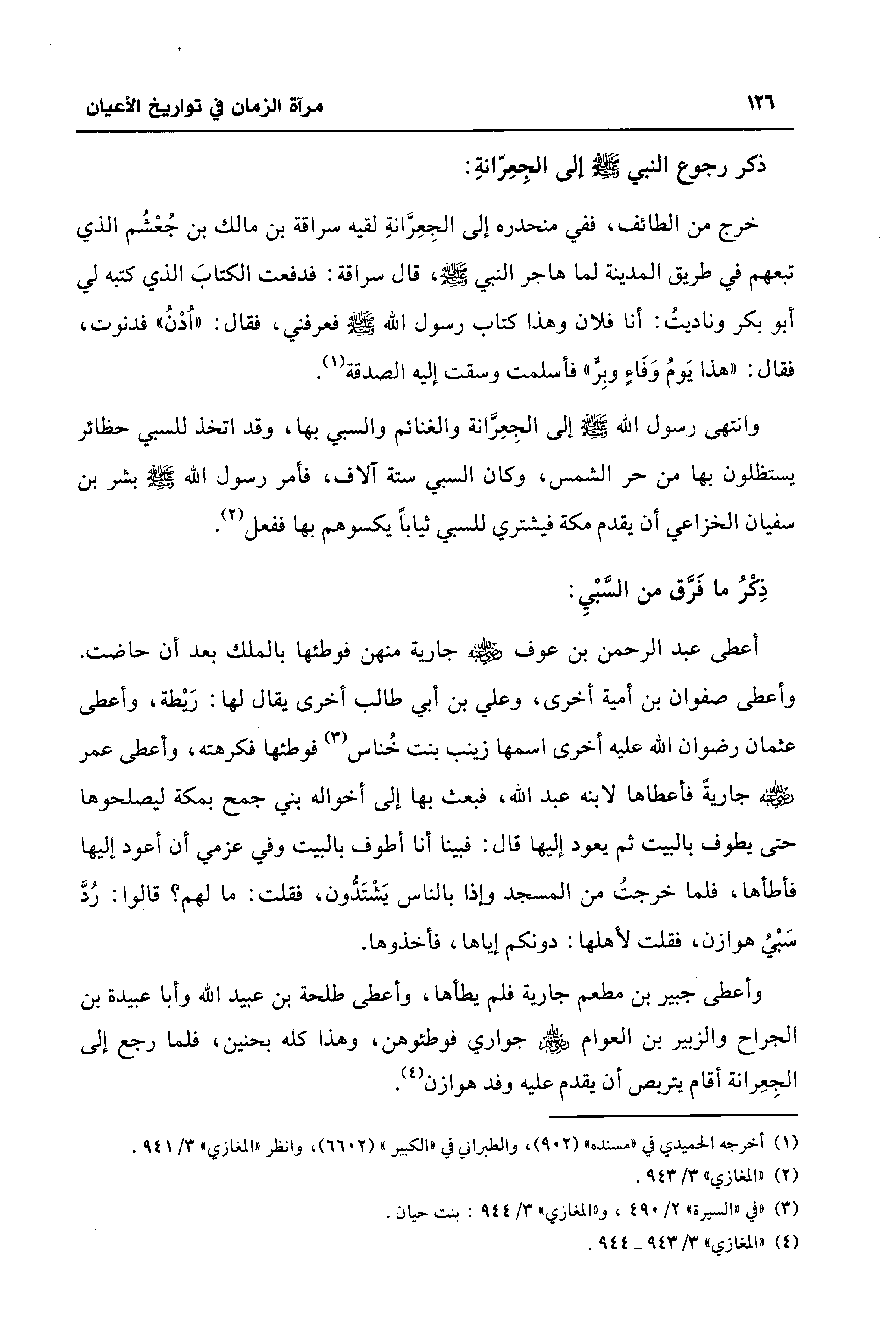 وأعطى جبير بن مطعم جارية فلم يطأها، وأعطى طلحة بن عبيد الله وأبا عبيدة بن الجراح والزبير بن العوام - رضي الله عنهم - جواري فوطئوهن، وهذا كله بحنين، فلما رجع إلى الجِعِرانة أقام يتربص أن يقدم عليه وفد هوازن (¬4).
