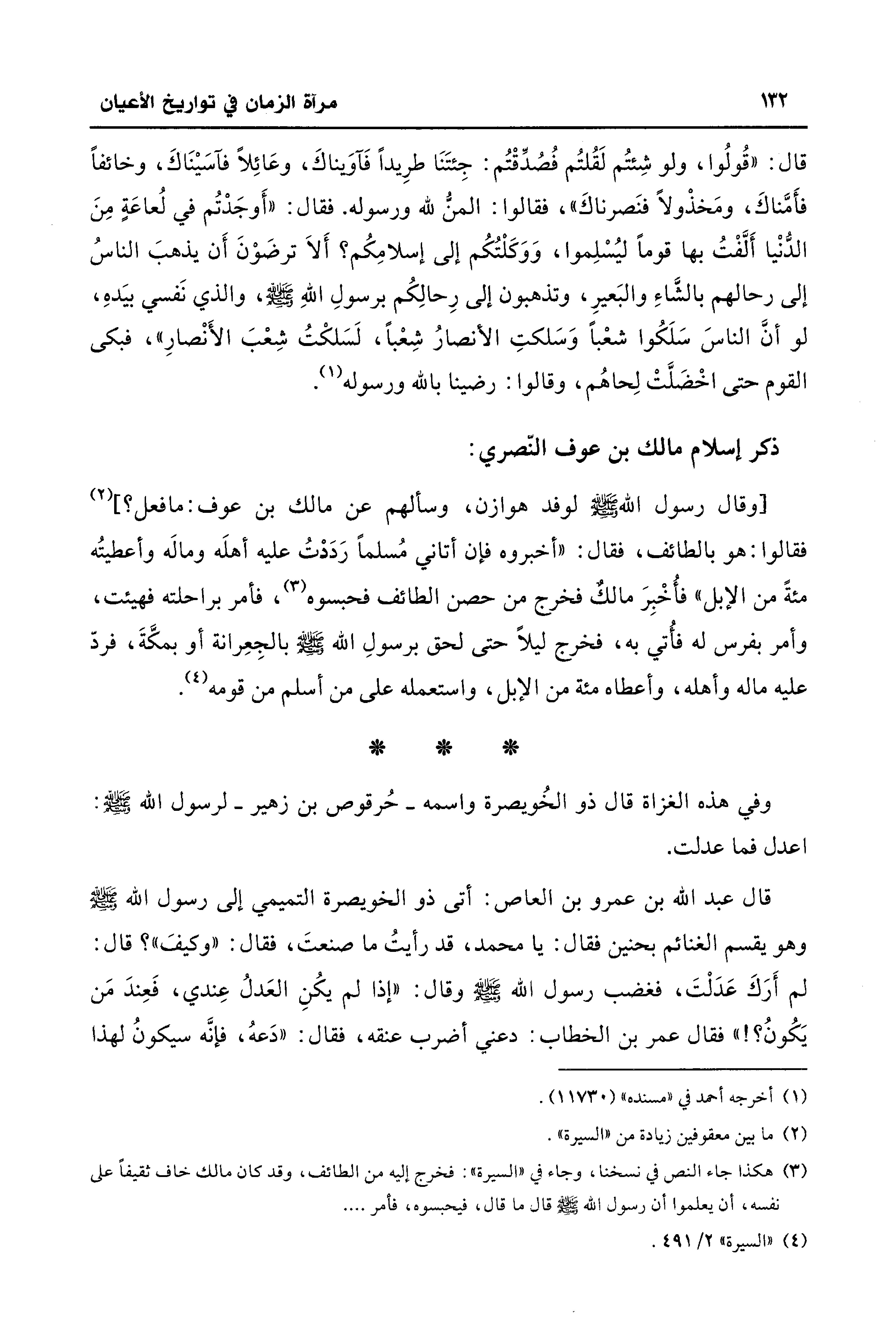 [وقال رسول الله - صلى الله عليه وسلم - لوفد هوازن، وسألهم عن مالك بن عوف: ما فعل؟ ] (¬2) فقالوا: هو بالطائف، فقال: "أخبروه فإن أتاني مُسلمًا رَدَدْتُ عليه أهلَه ومالَه وأعطيتُه مئةً من الإبل" فأُخْبِرَ مالكٌ فخرج من حصن الطائف فحبسوه (¬3)، فأمر براحلته فهيئت، وأمر بفرس له فأُتي به، فخرج ليلًا حتى لحق برسولِ الله - صلى الله عليه وسلم - بالجِعِرانة أو بمكَّةَ، فردّ عليه ماله وأهله، وأعطاه مئة من الإبل، واستعمله على من أسلم من قومه (¬4).