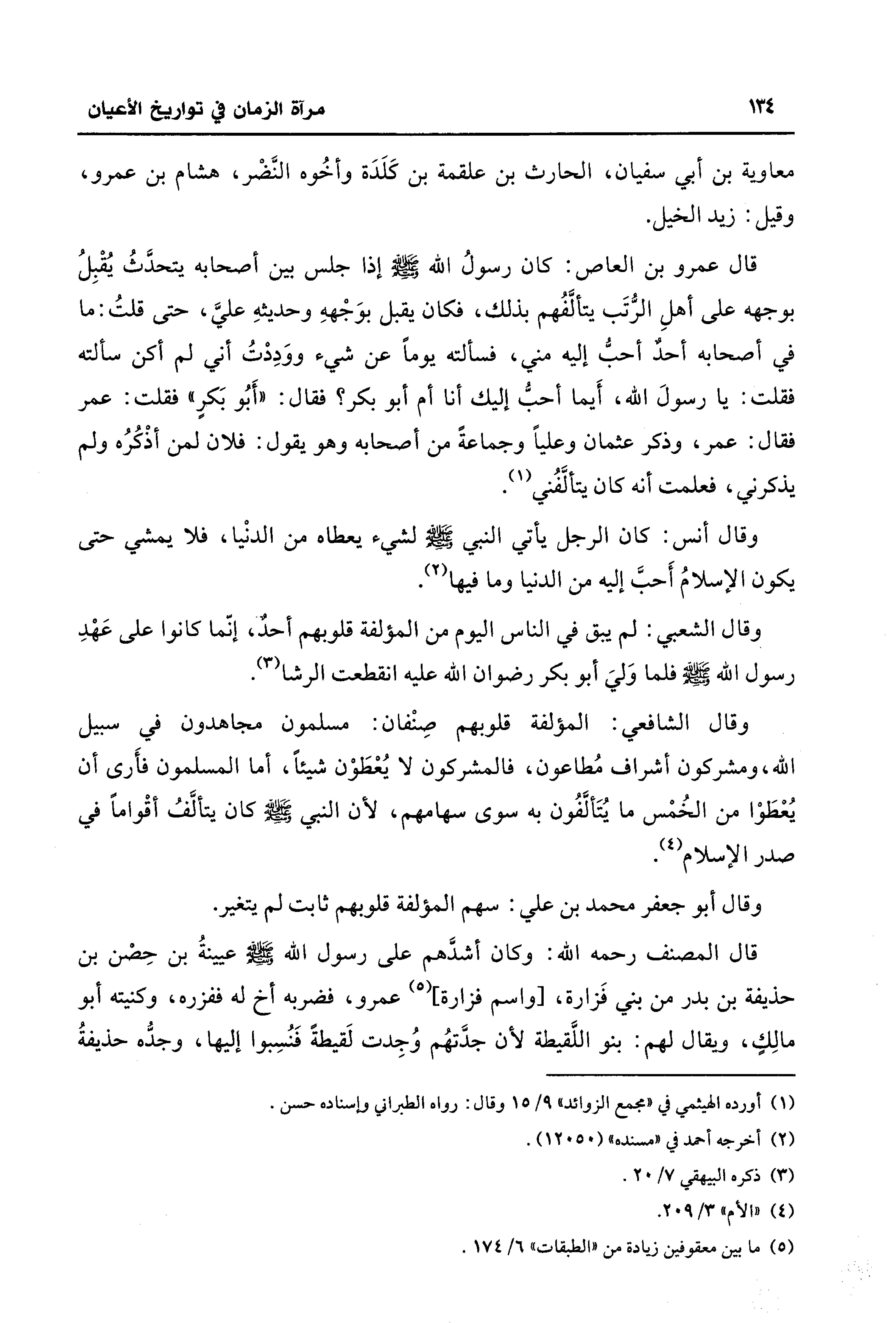 قال عمرو بن العاص: كان رسولُ الله - صلى الله عليه وسلم - إذا جلس بين أصحابه يتحدَّثُ يُقْبِلُ بوجهه على أهلِ الرُّتَب يتألَّفُهم بذلك، فكان يقبل بوَجْههِ وحديثهِ عليَّ، حتى قلتُ: ما في أصحابه أحدٌ أحبُّ إليه مني، فسألته يومًا عن شيء ووَدِدْتُ أني لم أكن سألته فقلت: يا رسولَ الله، أَيما أحبُّ إليك أنا أم أبو بكر؟ فقال: "أَبُو بَكرٍ" فقلت: عمر فقال: عمر، وذكر عثمان وعليًا وجماعةً من أصحابه وهو يقول: فلان لمن أذْكُرُه ولم يذكرني، فعلمت أنه كان يتألَّفُني (¬1).