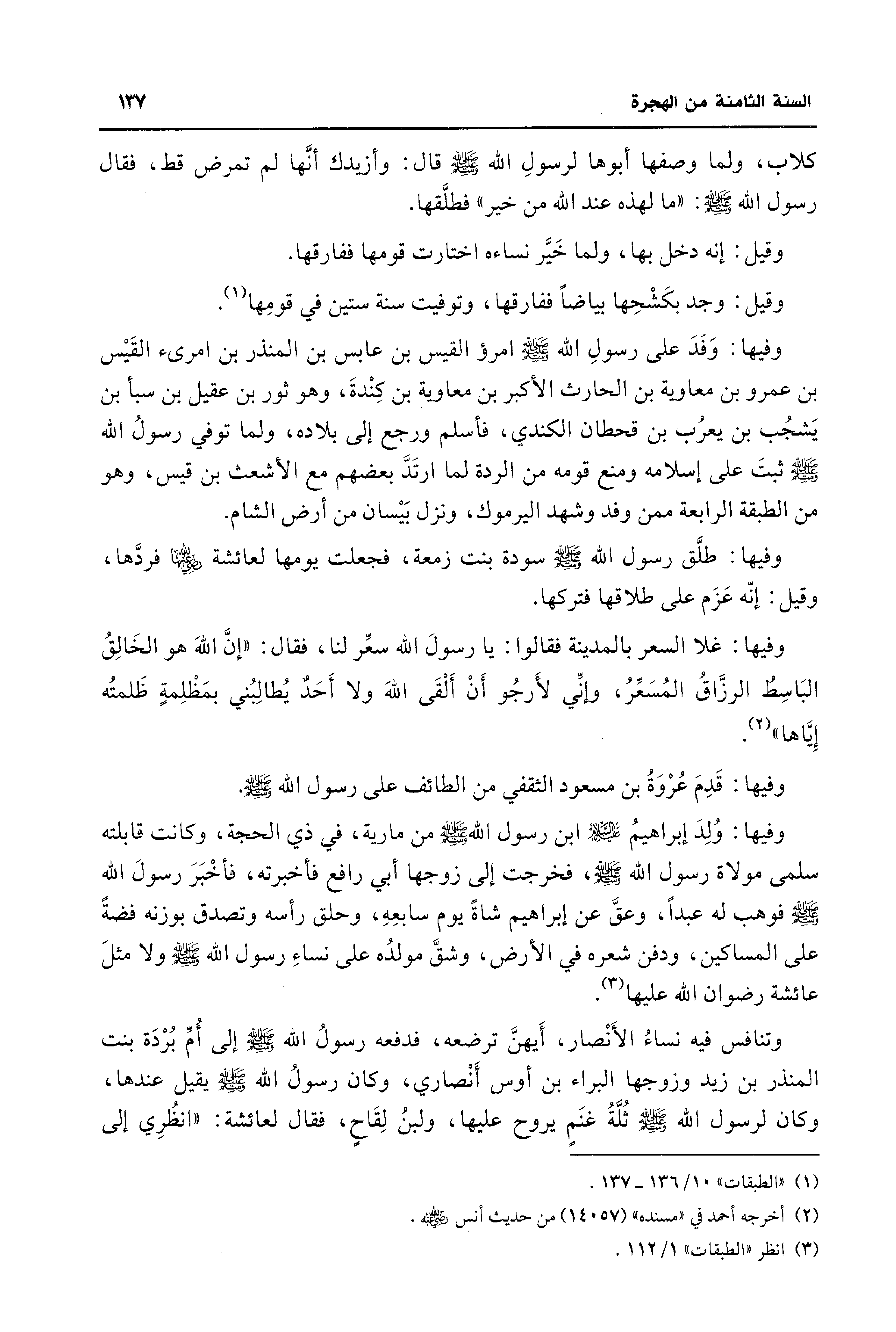 وفيها: وُلِدَ إبراهيمُ - عليه السلام - ابن رسول الله - صلى الله عليه وسلم - من مارية، في ذي الحجة، وكانت قابلته سلمى مولاة رسول الله - صلى الله عليه وسلم -، فخرجت إلى زوجها أبي رافع فأخبرته، فأخْبَرَ رسولَ الله - صلى الله عليه وسلم - فوهب له عبدًا، وعقَّ عن إبراهيم شاةً يوم سابعِهِ، وحلق رأسه وتصدق بوزنه فضةً على المساكين، ودفن شعره في الأرض، وشقَّ مولدُه على نساءِ رسول الله - صلى الله عليه وسلم - ولا مثلَ عائشة رضوان الله عليها (¬3).