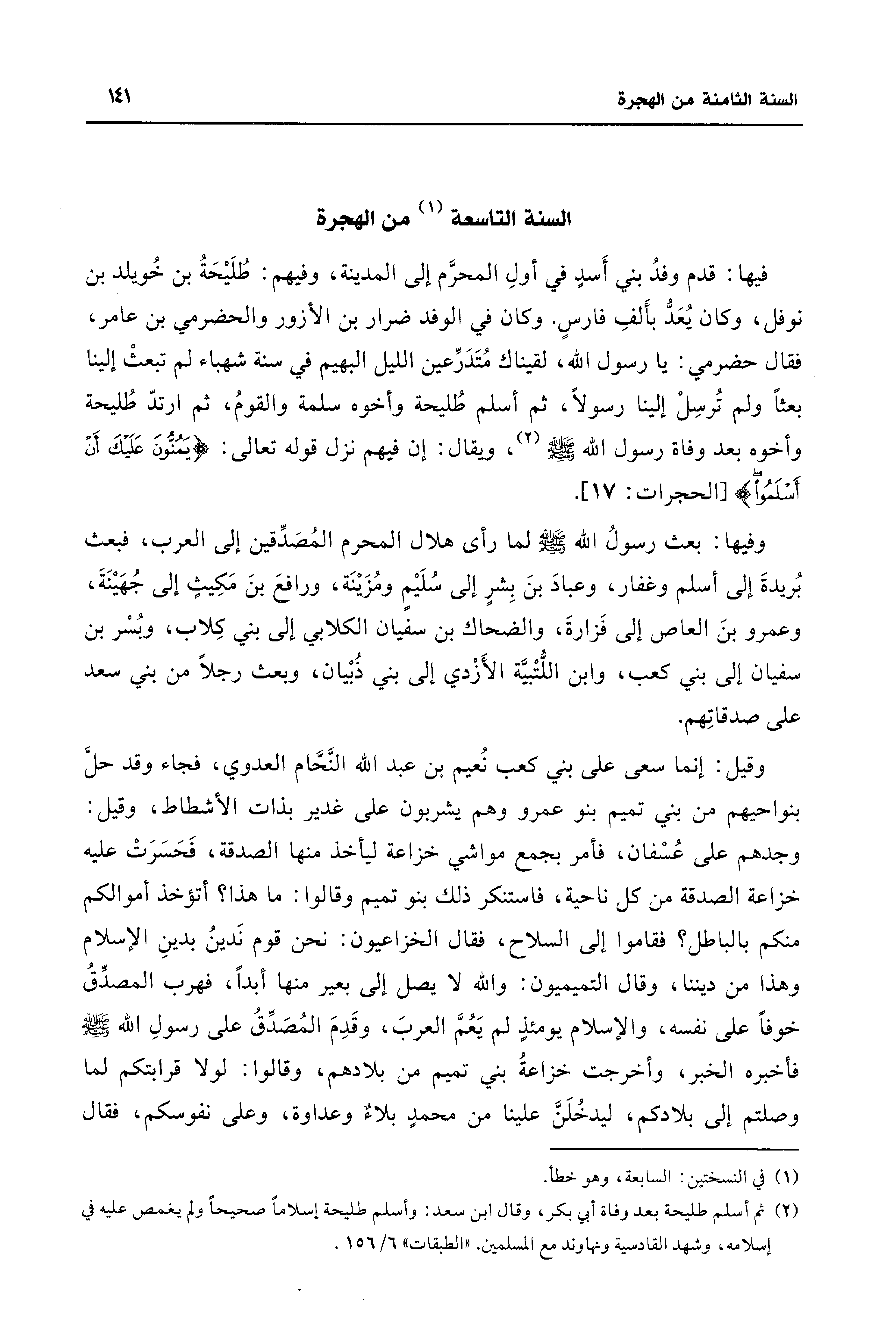 فيها: قدم وفدُ بني أَسدٍ في أولِ المحرَّم إلى المدينة، وفيهم: طُلَيْحَةُ بن خُويلد بن نوفل، وكان يُعَدُّ بأَلفِ فارسٍ. وكان في الوفد ضرار بن الأزور والحضرمي بن عامر، فقال حضرمي: يا رسول الله، لقيناك مُتَدَرِّعين الليل البهيم في سنة شهباء لم تبعثْ إلينا بعثًا ولم تُرسِلْ إلينا رسولًا، ثم أسلم طُليحة وأخوه سلمة والقومُ، ثم ارتدّ طُليحة وأخوه بعد وفاة رسول الله - صلى الله عليه وسلم - (¬2)، ويقال: إن فيهم نزل قوله تعالى: {يَمُنُّونَ عَلَيْكَ أَنْ أَسْلَمُوا} [الحجرات: 17].
