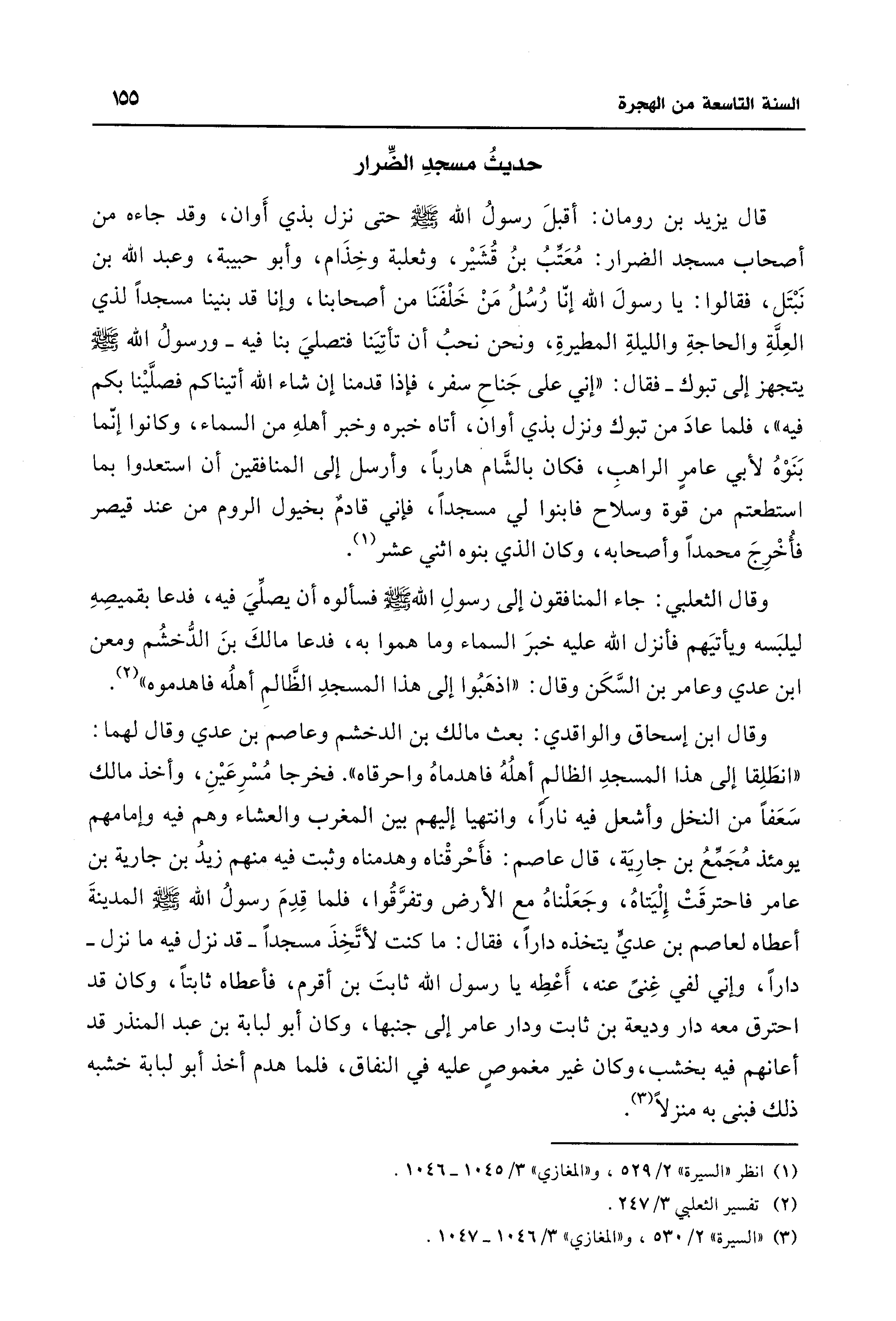 وقال الثعلبي: جاء المنافقون إلى رسولِ الله - صلى الله عليه وسلم - فسألوه أن يصلِّيَ فيه، فدعا بقميصِهِ ليلبَسه ويأتيَهم فأنزل الله عليه خبرَ السماء وما هموا به، فدعا مالكَ بنَ الدُّخشُم ومعن ابن عدي وعامر بن السَّكَن وقال: "اذهَبُوا إلى هذا المسجدِ الظَّالمِ أهلُه فاهدموه" (¬2).