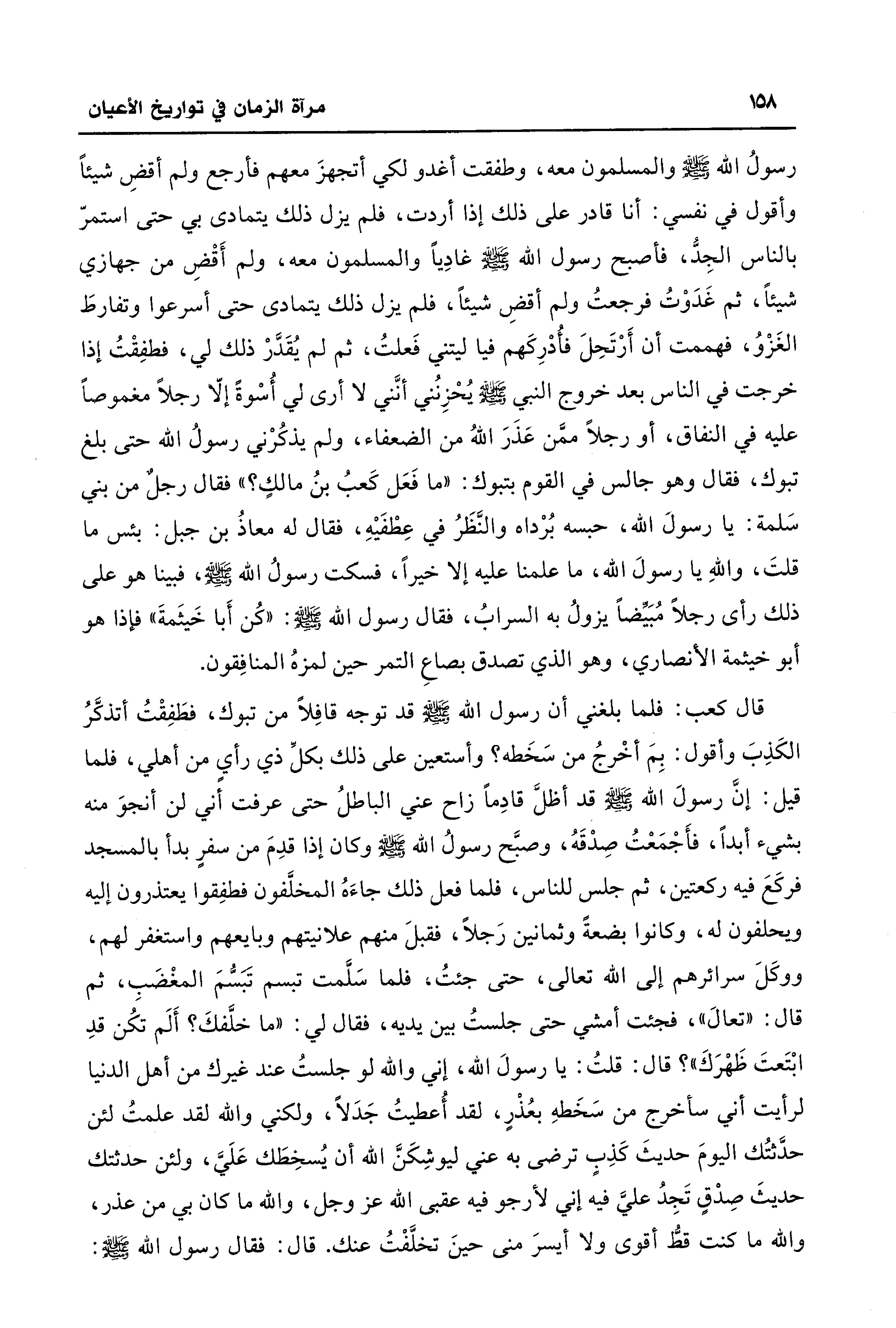 قال كعب: فلما بلغني أن رسول الله - صلى الله عليه وسلم - قد توجه قافِلًا من تبوك، فطَفِقْتُ أتذكَّرُ الكَذِبَ وأقول: بِمَ أخْرجُ من سَخَطه؟ وأستعين على ذلك بكلِّ ذي رأي من أهلي، فلما قيل: إن رسولَ الله - صلى الله عليه وسلم - قد أظلَّ قادِمًا زاح عني الباطلُ حتَّى عرفت أني لن أنجوَ منه بشيء أبدًا، فأَجْمَعْتُ صِدْقَهُ، وصبَّح رسولُ الله - صلى الله عليه وسلم - وكان إذا قدِمَ من سفرٍ بدأ بالمسجد فركَعَ فيه ركعتين، ثم جلس للناس، فلما فعل ذلك جاءَهُ المخلَّفون فطفِقوا يعتذرون إليه ويحلفون له، وكانوا بضعةً وثمانين رَجلًا، فقبلَ منهم علانيتهم وبايعهم واستغفر لهم، ووكَلَ سرائرهم إلى الله تعالى، حتَّى جئتُ, فلما سَلَّمت تبسم تَبَسُّمَ المغْضَبِ، ثم قال: "تعالَ"، فجئت أمشي حتَّى جلستُ بين يديه، فقال لي: "ما خلَّفكَ؟ أَلَم تكُن قدِ ابْتَعتَ ظَهْرَكَ"؟ قال: قلتُ: يا رسولَ الله، إني والله لو جلستُ عند غيرك من أهل الدنيا لرأيت أني سأخرج من سَخَطهِ بعُذْرٍ، لقد أُعطيتُ جَدَلًا، ولكني والله لقد علمتُ لئن حدَّثتُك اليومَ حديثَ كَذِبٍ ترضى به عني ليوشِكَنَّ الله أن يُسخِطَك عَلَيَّ، ولئن حدثتك حديثَ صِدْقٍ تَجِدُ عليَّ فيه إني لأرجو فيه عقبى الله عز وجل، والله ما كان بي من عذر، والله ما كنت قطُّ أقوى ولا أيسرَ منى حينَ تخلَّفْتُ عنك. قال: فقال رسول الله - صلى الله عليه وسلم -: