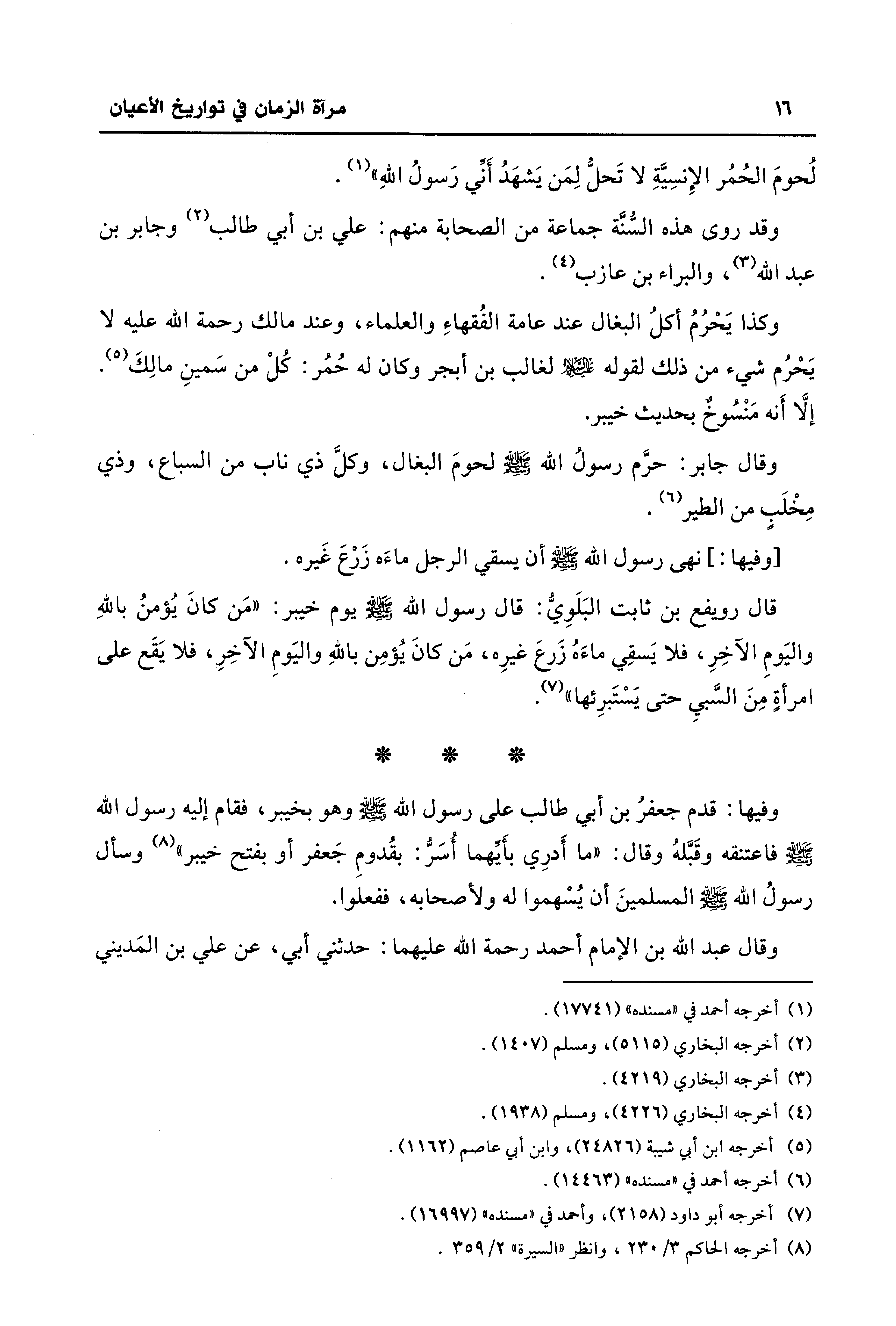 وفيها: قدم جعفرُ بن أبي طالب على رسول الله - صلى الله عليه وسلم - وهو بخيبر، فقام إليه رسول الله - صلى الله عليه وسلم - فاعتنقه وقَبَّلهُ وقال: "ما أَدرِي بأَيِّهما أُسَرُّ: بقُدومِ جَعفر أو بفتح خيبر" (¬8) وسأل رسولُ الله - صلى الله عليه وسلم - المسلمينَ أن يُسْهموا له ولأصحابه، ففعلوا.