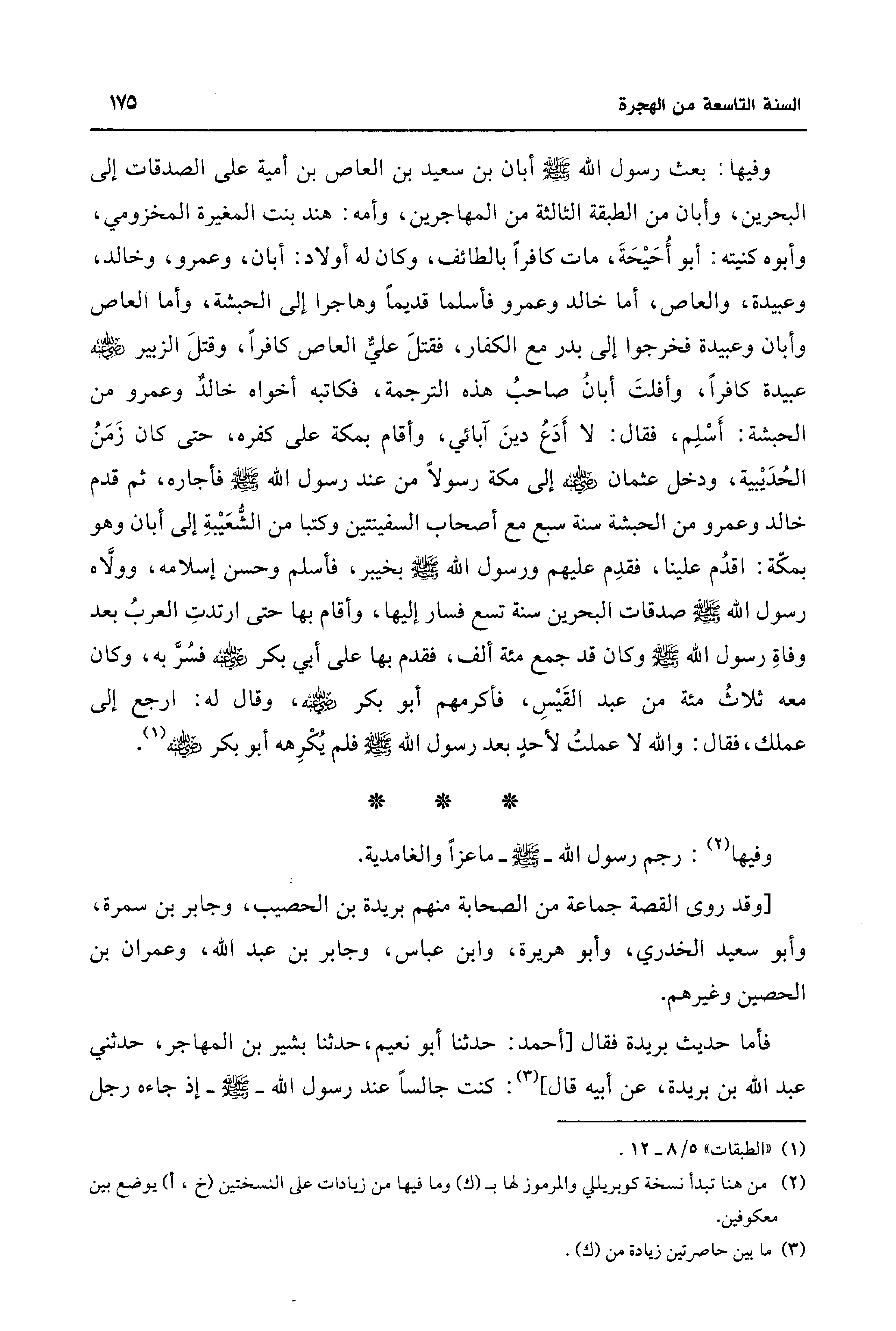 وفيها: بعث رسول الله - صلى الله عليه وسلم - أبان بن سعيد بن العاص بن أمية على الصدقات إلى البحرين، وأبان من الطبقة الثالثة من المهاجرين، وأمه: هند بنت المغيرة المخزومي، وأبوه كنيته: أبو أُحَيْحَةَ، مات كافرًا بالطائف، وكان له أولاد: أبان، وعمرو، وخالد، وعبيدة، والعاص، أما خالد وعمرو فأسلما قديمًا وهاجرا إلى الحبشة، وأما العاص وأبان وعبيدة فخرجوا إلى بدر مع الكفار، فقتلَ عليٌّ العاص كافرًا، وقتلَ الزبير - رضي الله عنه - عبيدة كافرًا، وأفلتَ أبانُ صاحبُ هذه الترجمة، فكاتبه أخواه خالدٌ وعمرو من الحبشة: أَسْلِم، فقال: لا أَدَعُ دينَ آبائي، وأقام بمكة على كفره، حتَّى كان زَمَنُ الحُدَيْبية، ودخل عثمان - رضي الله عنه - إلى مكة رسولًا من عند رسول الله - صلى الله عليه وسلم - فأجاره، ثم قدم خالد وعمرو من الحبشة سنة سبع مع أصحاب السفينتين وكتبا من الشُّعَيْبةِ إلى أبان وهو بمكّة: اقدُم علينا، فقدِم عليهم ورسول الله - صلى الله عليه وسلم - بخيبر، فأسلم وحسن إسلامه، وولَّاه رسول الله - صلى الله عليه وسلم - صدقات البحرين سنة تسع فسار إليها، وأقام بها حتَّى ارتدتِ العربُ بعد وفاةِ رسول الله - صلى الله عليه وسلم - وكان قد جمع مئة ألف، فقدم بها على أبي بكر - رضي الله عنه - فسُرَّ به، وكان معه ثلاثُ مئة من عبد القَيْسِ، فأكرمهم أبو بكر - رضي الله عنه -، وقال له: ارجع إلى عملك، فقال: والله لا عملتُ لأحدٍ بعد رسول الله - صلى الله عليه وسلم - فلم يُكْرِهه أبو بكر - رضي الله عنه - (¬1).