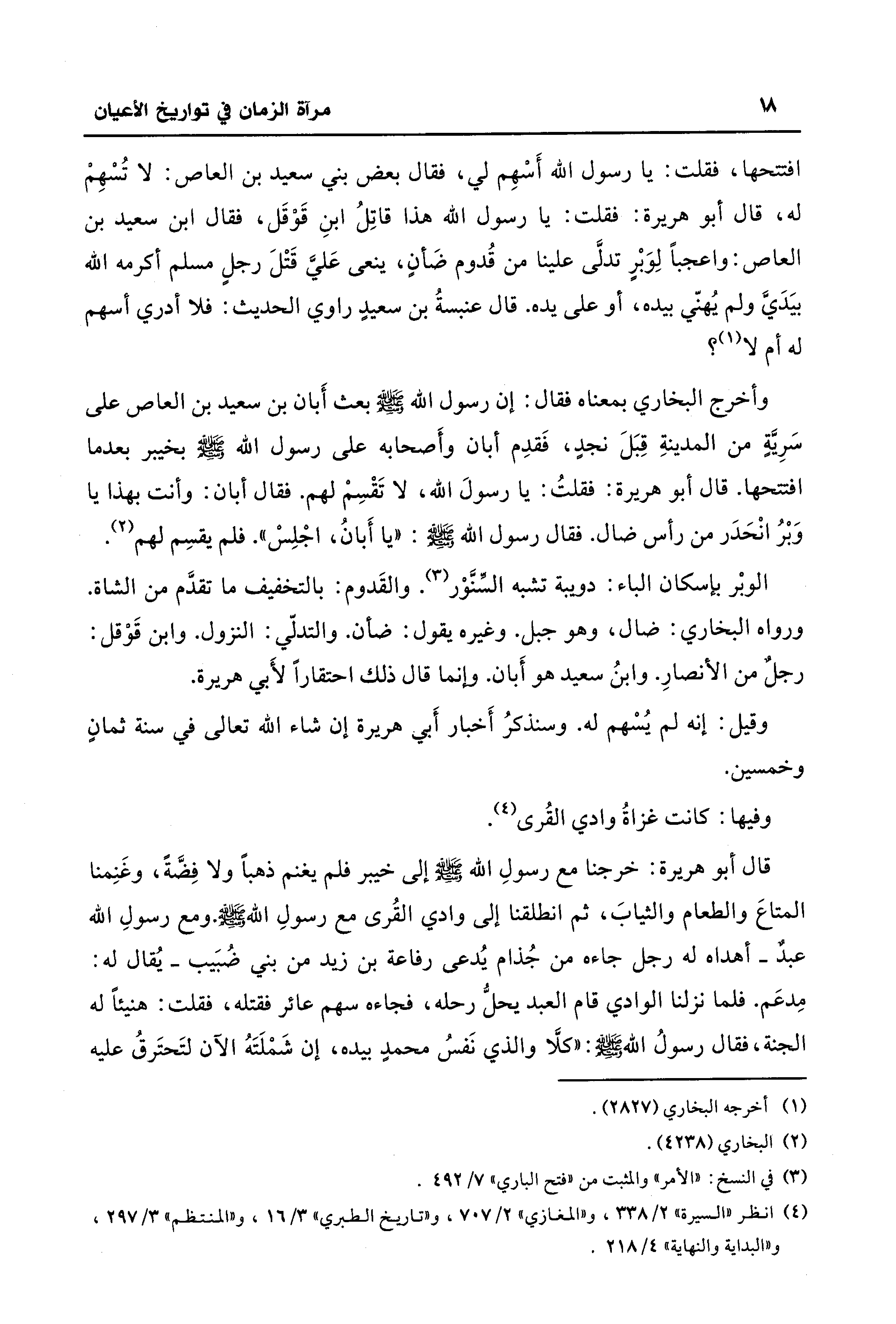 وأخرج البخاري بمعناه فقال: إن رسول الله - صلى الله عليه وسلم - بعث أَبان بن سعيد بن العاص على سَرِيَّةٍ من المدينةِ قِبَلَ نجدٍ، فَقدِم أبان وأَصحابه على رسول الله - صلى الله عليه وسلم - بخيبر بعدما افتتحها. قال أبو هريرة: فقلتُ: يا رسولَ الله، لا تَقْسِمْ لهم. فقال أبان: وأنت بهذا يا وَبْرُ انْحَدَر من رأس ضال. فقال رسول الله - صلى الله عليه وسلم -: "يا أَبانُ، اجْلِسْ". فلم يقسِم لهم (¬2).
