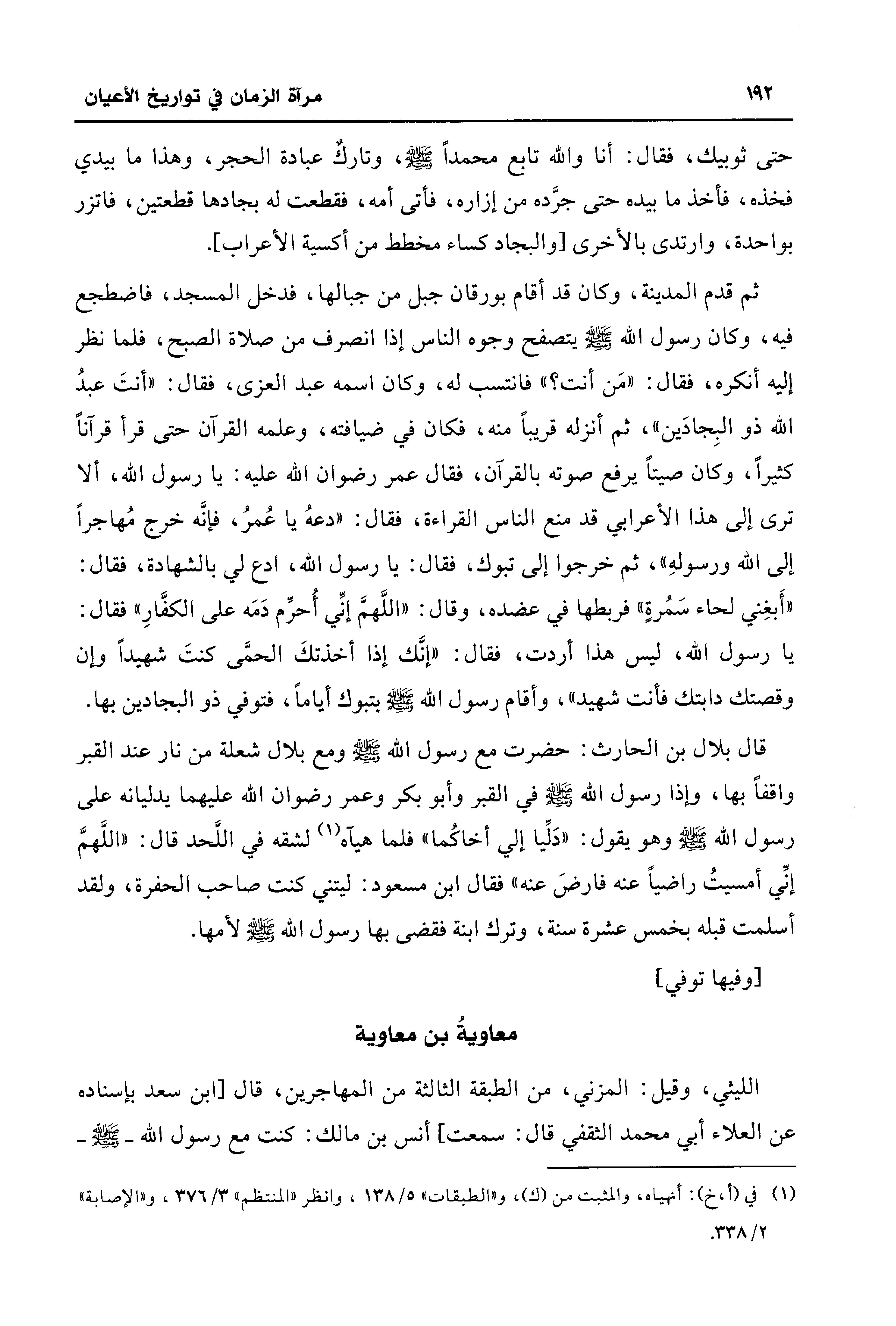 ثم قدم المدينة، وكان قد أقام بورقان جبل من جبالها، فدخل المسجد، فاضطجع فيه، وكان رسول الله - صلى الله عليه وسلم - يتصفح وجوه الناس إذا انصرف من صلاة الصبح، فلم انظر إليه أنكره، فقال: "مَن أنت؟ " فانتسب له، وكان اسمه عبد العزى، فقال: "أنتَ عبدُ الله ذو البِجادَين"، ثم أنزله قريبًا منه، فكان في ضيافته، وعلمه القرآن حتَّى قرأ قرآنًا كثيرًا، وكان صيتًا يرفع صوته بالقرآن، فقال عمر رضوان الله عليه: يا رسول الله، ألا ترى إلى هذا الأعرابي قد منع الناس القراءة، فقال: "دعهُ يا عُمرُ، فإنَّه خرج مُهاجرًا إلى الله ورسولهِ"، ثم خرجوا إلى تبوك، فقال: يا رسول الله، ادع لي بالشهادة، فقال: "أَبغِني لحاء سَمُرةٍ" فربطها في عضده، وقال: "اللَّهمَّ إنِّي أُحرِّم دَمَه على الكفَّارِ" فقال: يا رسول الله، ليس هذا أردت، فقال: "إنَّك إذا أخذتكَ الحمَّى كنتَ شهيدًا وإن وقصتك دابتك فأنت شهيد"، وأقام رسول الله - صلى الله عليه وسلم - بتبوك أيامًا، فتوفي ذو البجادين بها.
