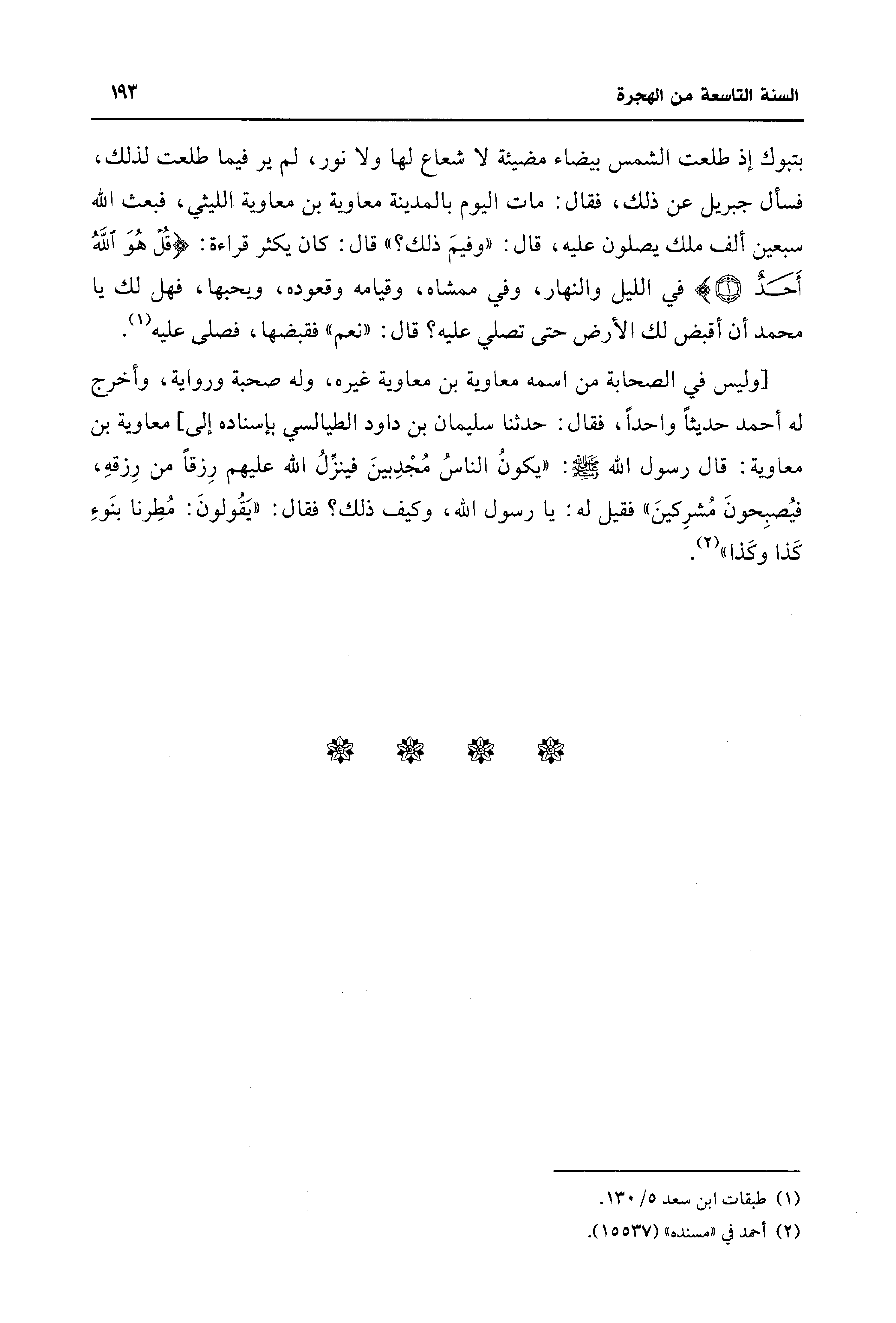 بتبوك إذ طلعت الشمس بيضاء مضيئة لا شعاع لها ولا نور، لم ير فيما طلعت لذلك، فسأل جبريل عن ذلك، فقال: مات اليوم بالمدينة معاوية بن معاوية الليثي، فبعث الله سبعين ألف ملك يصلون عليه، قال: "وفيمَ ذلك؟ " قال: كان يكثر قراءة: {قُلْ هُوَ اللَّهُ أَحَدٌ (1)} في الليل والنهار، وفي ممشاه، وقيامه وقعوده، ويحبها، فهل لك يا محمد أن أقبض لك الأرض حتَّى تصلي عليه؟ قال: "نعم" فقبضها، فصلى عليه (¬1).