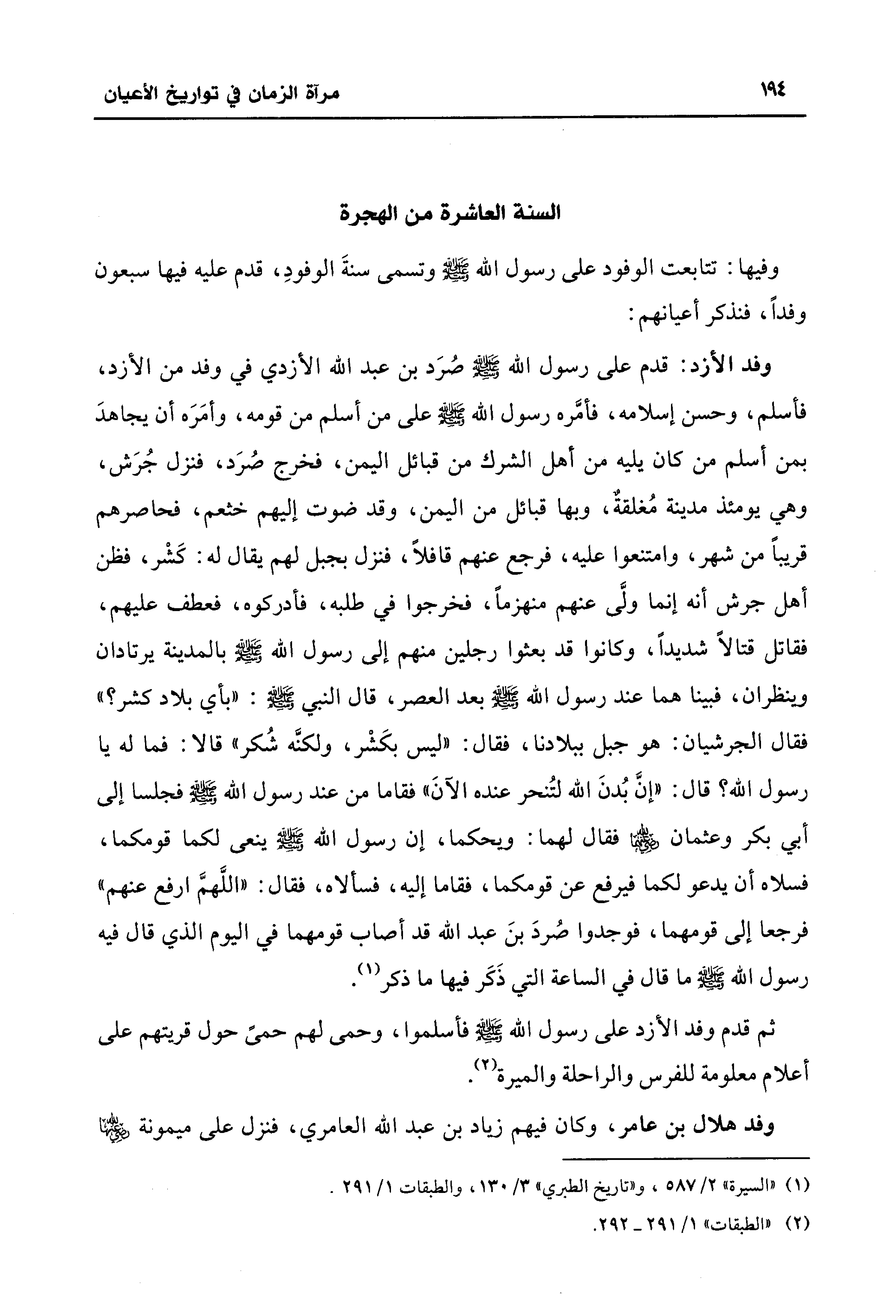 وفد الأزد: قدم على رسول الله - صلى الله عليه وسلم - صُرَد بن عبد الله الأزدي في وفد من الأزد، فأسلم، وحسن إسلامه، فأمَّره رسول الله - صلى الله عليه وسلم - على من أسلم من قومه، وأمَرَه أن يجاهدَ بمن أسلم من كان يليه من أهل الشرك من قبائل اليمن، فخرج صُرَد، فنزل جُرَش، وهي يومئذ مدينة مُغلقةٌ، وبها قبائل من اليمن، وقد ضوت إليهم خثعم، فحاصرهم قريبًا من شهر، وامتنعوا عليه، فرجع عنهم قافلًا، فنزل بجبل لهم يقال له: كَشْر، فظن أهل جرش أنَّه إنما ولَّى عنهم منهزمًا، فخرجوا في طلبه، فأدركوه، فعطف عليهم، فقاتل قتالًا شديدًا، وكانوا قد بعثوا رجلين منهم إلى رسول الله - صلى الله عليه وسلم - بالمدينة يرتادان وينظران، فبينا هما عند رسول الله - صلى الله عليه وسلم - بعد العصر، قال النبي - صلى الله عليه وسلم -: "بأي بلاد كشر؟ " فقال الجرشيان: هو جبل ببلادنا، فقال: "ليس بكَشْر، ولكنَّه شُكر" قالا: فما له يا رسول الله؟ قال: "إنَّ بُدنَ الله لتُنحر عنده الآنَ" فقاما من عند رسول الله - صلى الله عليه وسلم - فجلسا إلى أبي بكر وعثمان - رضي الله عنهما - فقال لهما: ويحكما، إن رسول الله - صلى الله عليه وسلم - ينعى لكما قومكما، فسلاه أن يدعو لكما فيرفع عن قومكما، فقاما إليه، فسألاه، فقال: "اللَّهمَّ ارفع عنهم" فرجعا إلى قومهما، فوجدوا صُردَ بنَ عبد الله قد أصاب قومهما في اليوم الَّذي قال فيه رسول الله - صلى الله عليه وسلم - ما قال في الساعة التي ذَكَر فيها ما ذكر (¬1).