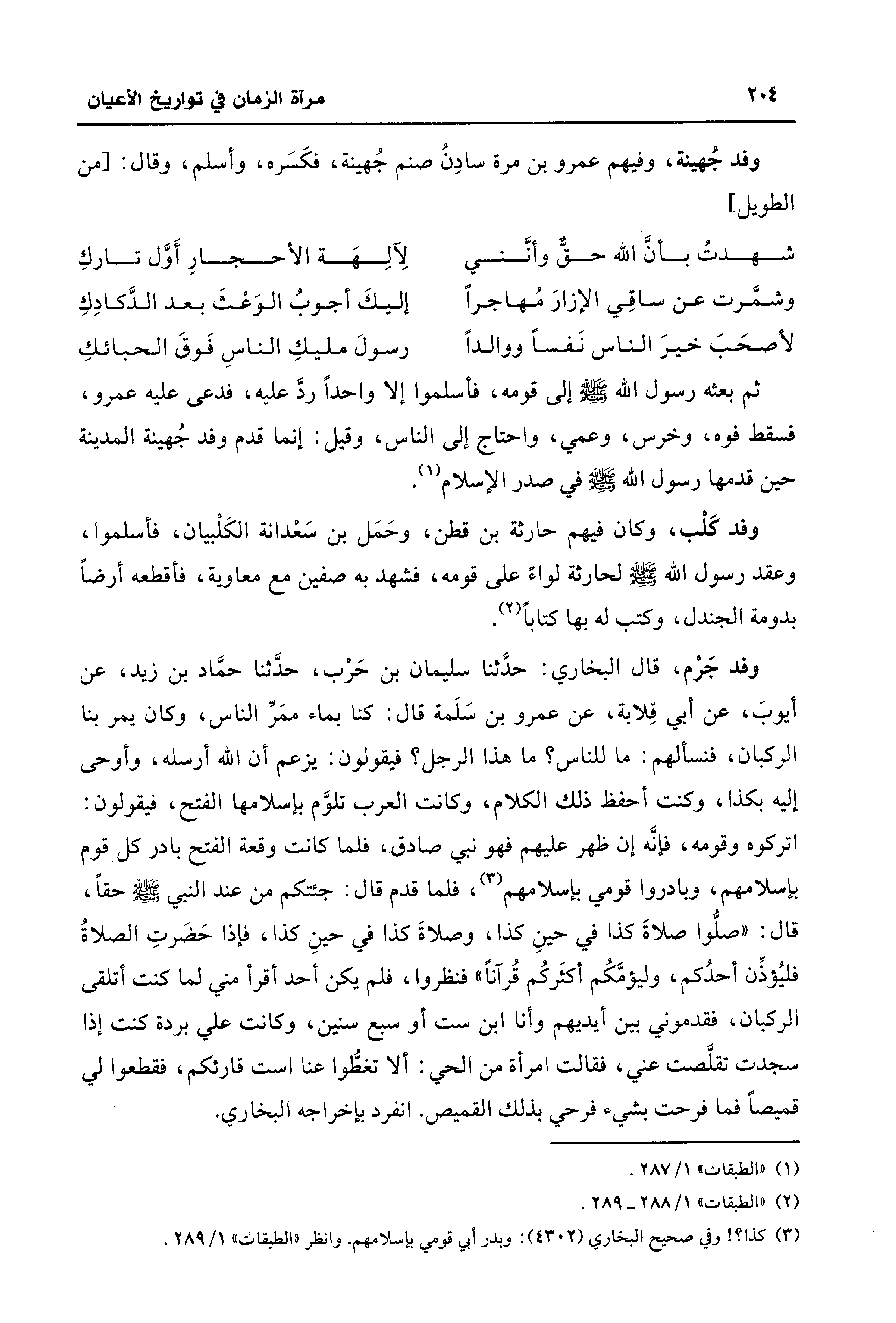 وفد جَرْم، قال البخاري: حدَّثنا سليمان بن حَرْب، حدَّثنا حمَّاد بن زيد، عن أيوبَ، عن أبي قِلابة، عن عمرو بن سَلَمة قال: كنا بماء ممَرَّ الناس، وكان يمر بنا الركبان، فنسألهم: ما للناس؟ ما هذا الرجل؟ فيقولون: يزعم أن الله أرسله، وأوحى إليه بكذا، وكنت أحفظ ذلك الكلام، وكانت العرب تلوَّم بإسلامها الفتح، فيقولون: اتركوه وقومه، فإنَّه إن ظهر عليهم فهو نبي صادق، فلما كانت وقعة الفتح بادر كل قوم بإسلامهم، وبادروا قومي بإسلامهم (¬3)، فلما قدم قال: جئتكم من عند النبي - صلى الله عليه وسلم - حقًا، قال: "صلُّوا صلاةَ كذا في حينِ كذا، وصلاةَ كذا في حينِ كذا، فإذا حَضرتِ الصلاةُ فليُؤذِّن أحدُكم، وليؤمَّكُم أكثَركُم قُرآنًا" فنظروا، فلم يكن أحد أقرأ مني لما كنت أتلقى الركبان، فقدموني بين أيديهم وأنا ابن ست أو سبع سنين، وكانت علي بردة كنت إذا سجدت تقلَّصت عني، فقالت امرأة من الحي: ألا تغطُّوا عنا است قارئكم، فقطعوا لي قميصًا فما فرحت بشيء فرحي بذلك القميص. انفرد بإخراجه البخاري.