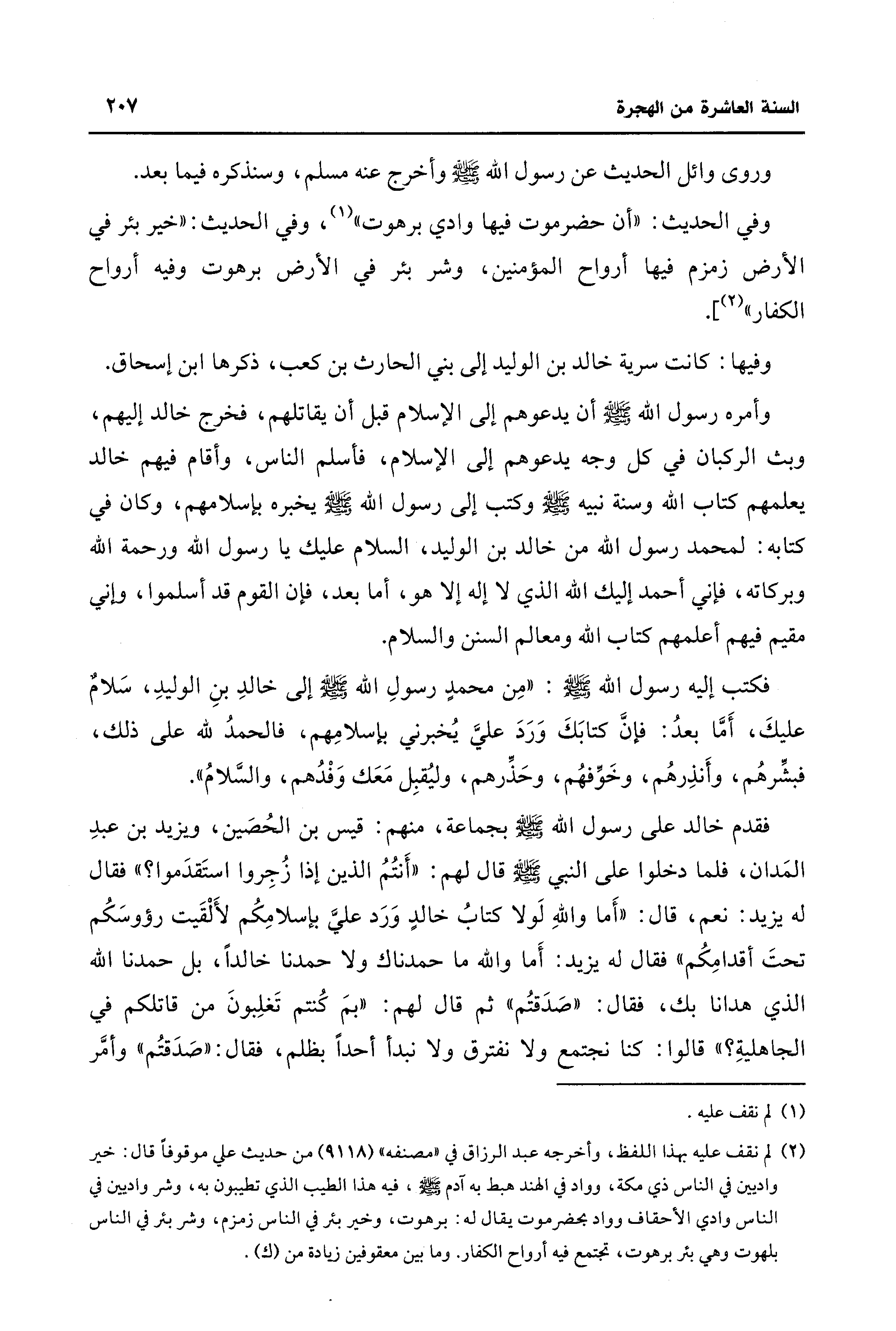 فكتب إليه رسول الله - صلى الله عليه وسلم -: "مِن محمدٍ رسولِ الله - صلى الله عليه وسلم - إلى خالدِ بنِ الوليدِ، سَلامٌ عليكَ، أَمَّا بعدُ: فإنَّ كتابَكَ وَرَدَ عليَّ يُخبرني بإسلامِهم، فالحمدُ لله على ذلك، فبشِّرهُم، وأَنذِرهُم، وخَوِّفهُم، وحَذِّرهم، وليُقبِل مَعَك وَفْدُهم، والسَّلامُ".