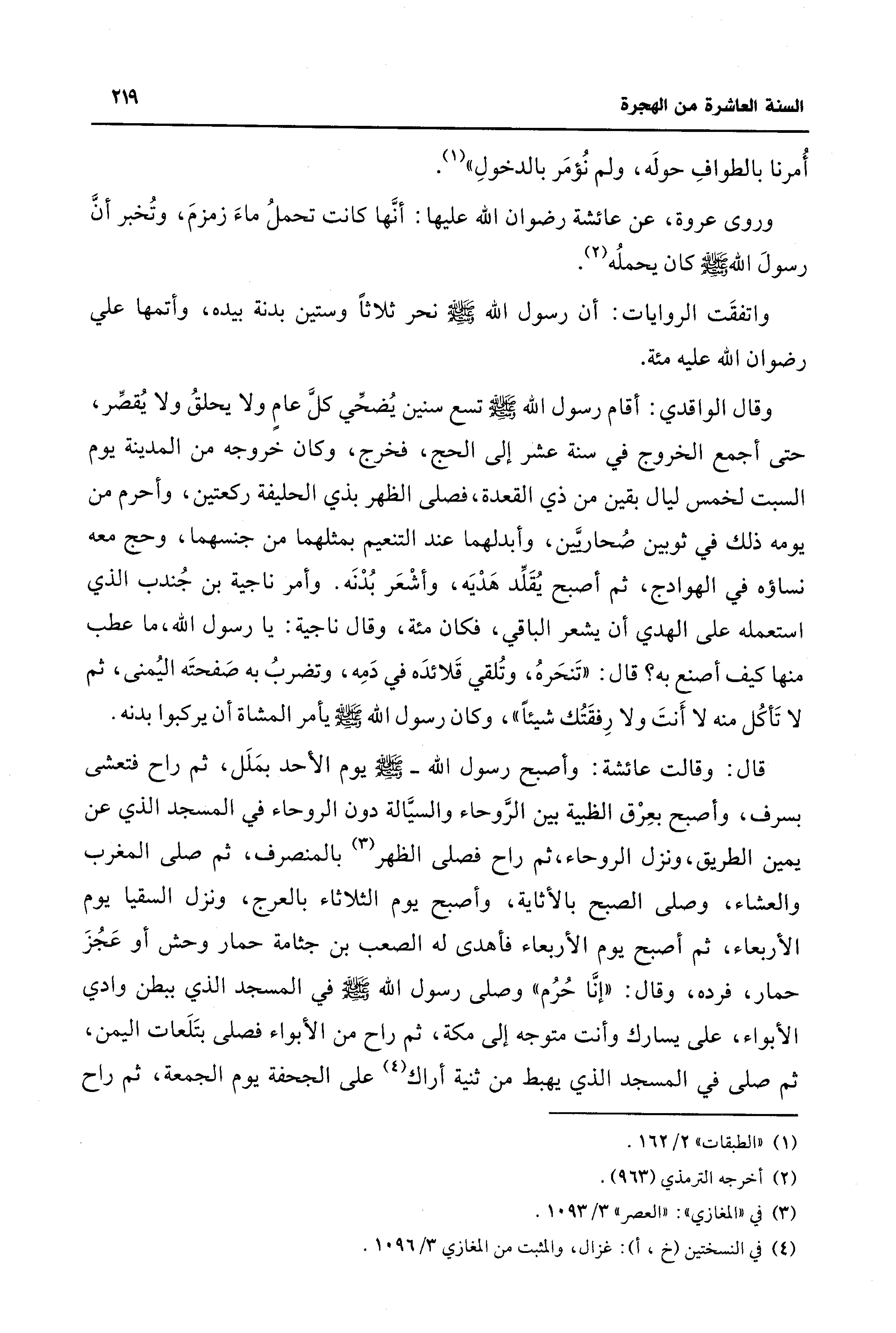 وقال الواقدي: أقام رسول الله - صلى الله عليه وسلم - تسع سنين يُضحِّي كلَّ عامٍ ولا يحلقُ ولا يُقصِّر، حتى أجمع الخروج في سنة عشر إلى الحج، فخرج، وكان خروجه من المدينة يوم السبت لخمس ليال بقين من ذي القعدة، فصلى الظهر بذي الحليفة ركعتين، وأحرم من يومه ذلك في ثوبين صُحاريَّين، وأبدلهما عند التنعيم بمثلهما من جنسهما، وحج معه نساؤه في الهوادج، ثم أصبح يُقَلِّد هَدْيَه، وأشْعَر بُدْنَه. وأمر ناجية بن جُندب الذي استعمله على الهدي أن يشعر الباقي، فكان مئة، وقال ناجية: يا رسول الله، ما عطب منها كيف أصنع به؟ قال: "تَنحَرهُ، وتُلقي قَلائدَه في دَمِه، وتضربُ به صَفحتَه اليُمنى، ثم لا تَأكُل منه لا أَنتَ ولا رِفقَتُك شيئًا"، وكان رسول الله - صلى الله عليه وسلم - يأمر المشاة أن يركبوا بدنه.