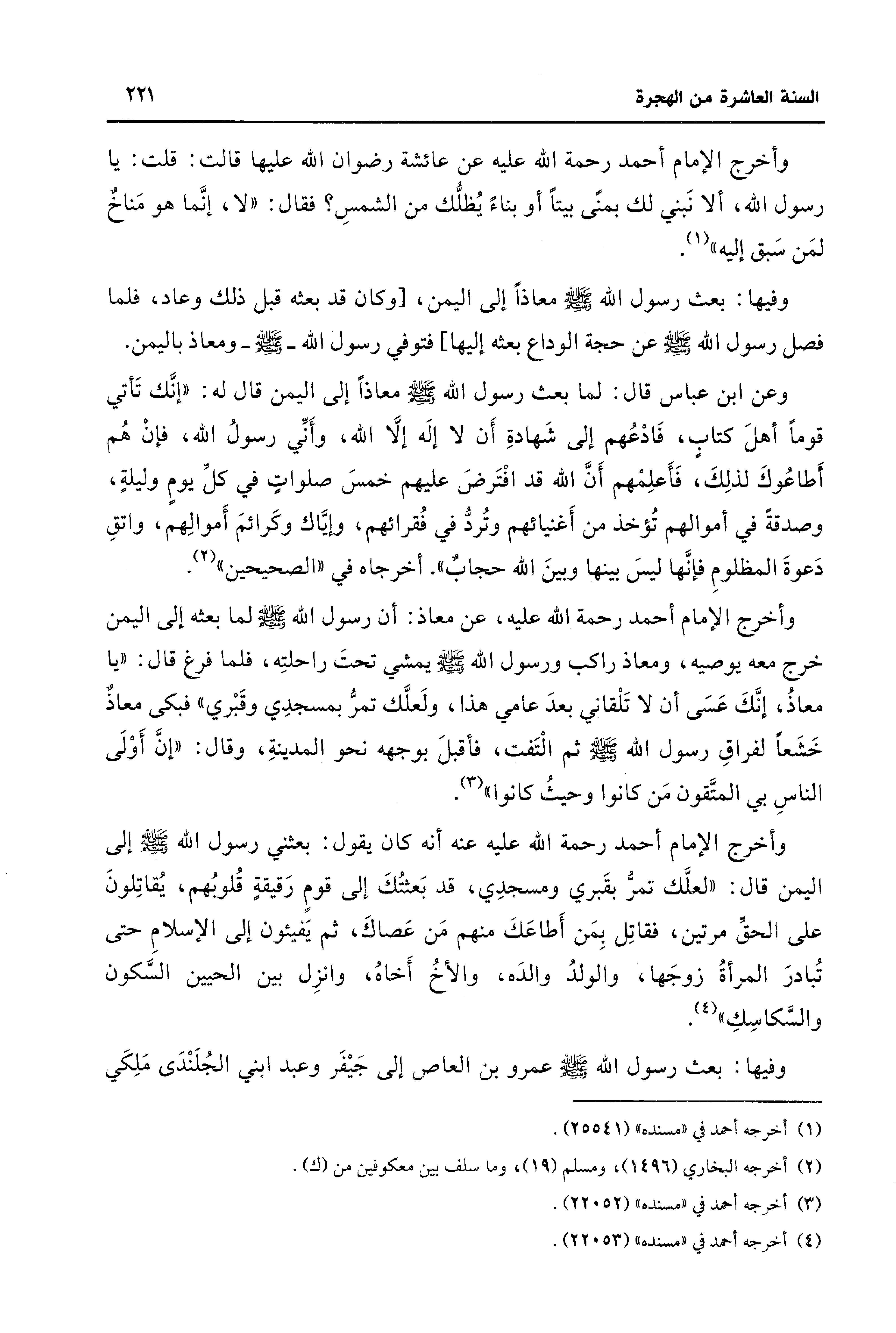 وأخرج الإمام أحمد رحمة الله عليه عنه أنه كان يقول: بعثني رسول الله - صلى الله عليه وسلم - إلى اليمن قال: "لعلَّك تمرُّ بقَبري ومسجدِي، قد بَعثتُكَ إلى قومٍ رَقيقةٍ قُلوبُهم، يُقاتِلونَ على الحقَّ مرتين، فقاتِل بِمَن أَطاعَكَ منهم مَن عَصاك، ثم يَفيئون إلى الإسلامِ حتى تُبادرَ المرأةُ زوجَها، والولدُ والدَه، والأخُ أَخاهُ، وانزِل بين الحيين السَّكون والسَّكاسِكِ" (¬4).