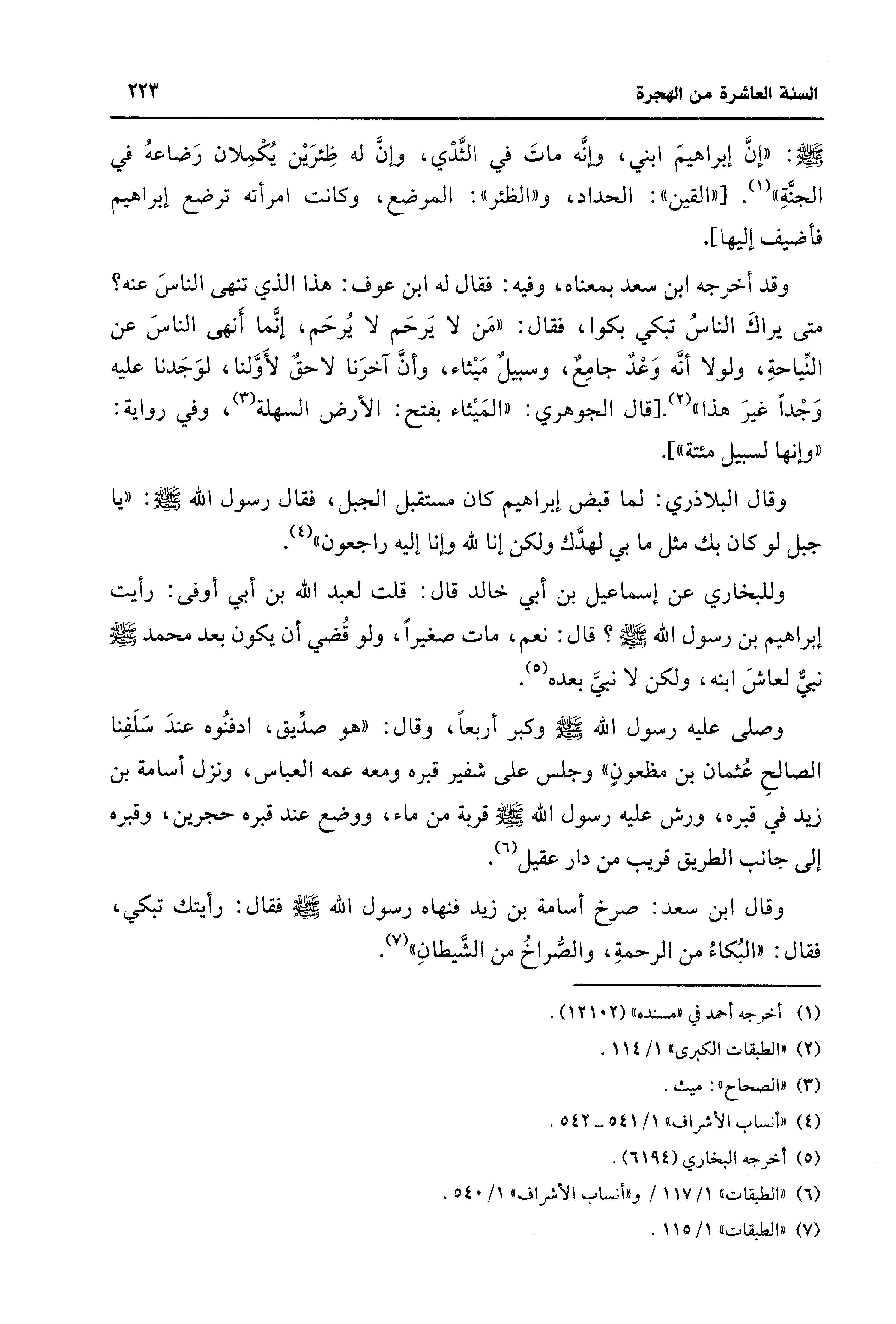 وقال ابن سعد: صرخ أسامة بن زيد فنهاه رسول الله - صلى الله عليه وسلم - فقال: رأيتك تبكي، فقال: "البُكاءُ من الرحمةِ، والصُّراخُ من الشَّيطانِ" (¬7).