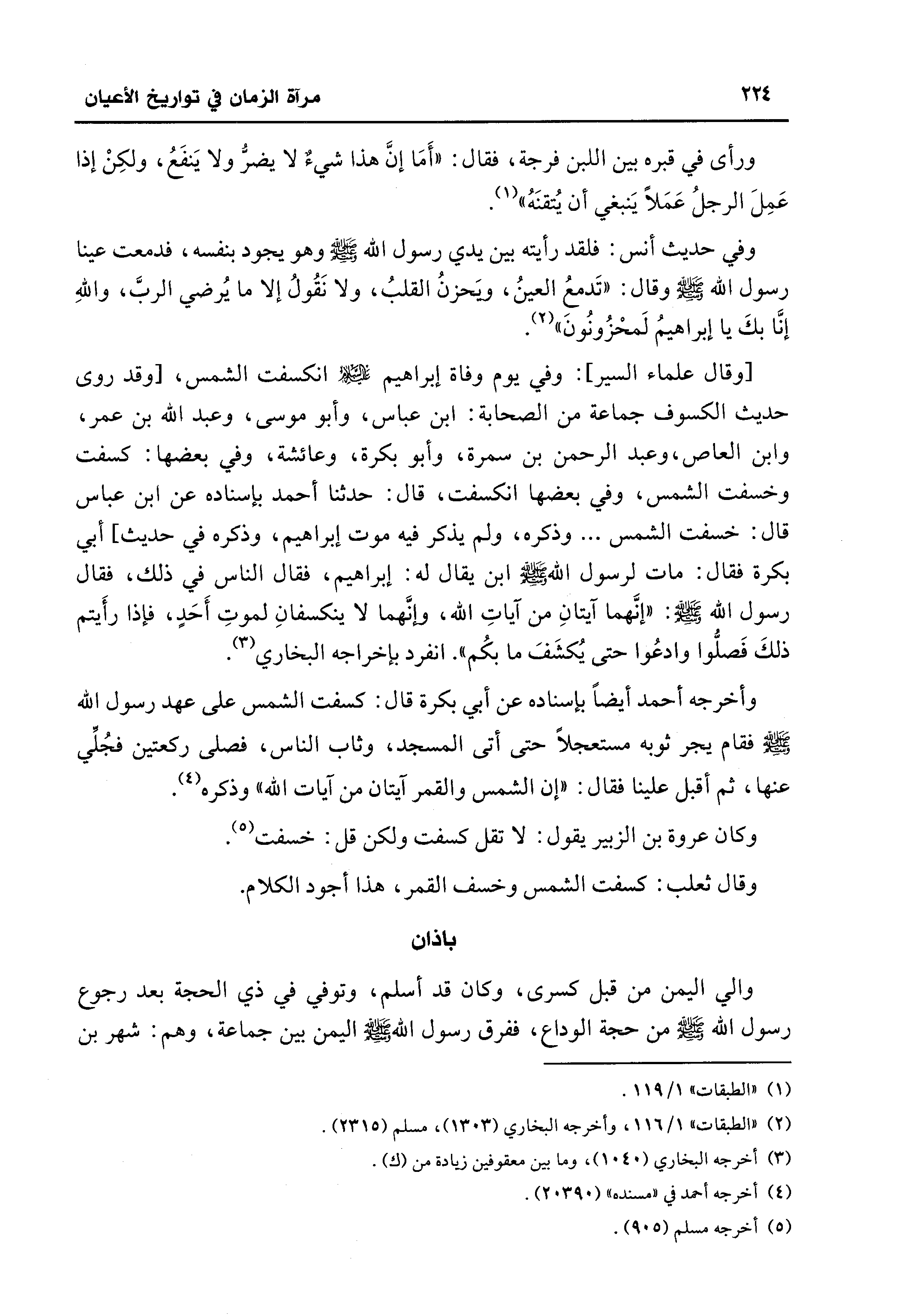 [وقال علماء السير]: وفي يوم وفاة إبراهيم - عليه السلام - انكسفت الشمس، [وقد روى حديث الكسوف جماعة من الصحابة: ابن عباس، وأبو موسى، وعبد الله بن عمر، وابن العاص، وعبد الرحمن بن سمرة، وأبو بكرة، وعائشة، وفي بعضها: كسفت وخسفت الشمس، وفي بعضها انكسفت، قال: حدثنا أحمد بإسناده عن ابن عباس قال: خسفت الشمس ... وذكره، ولم يذكر فيه موت إبراهيم، وذكره في حديث] أبي بكرة فقال: مات لرسول الله - صلى الله عليه وسلم - ابن يقال له: إبراهيم، فقال الناس في ذلك، فقال رسول الله - صلى الله عليه وسلم -: "إنَّهما آيتانِ من آياتِ الله، وإنَّهما لا ينكسفانِ لموتِ أَحَدٍ، فإذا رأَيتم ذلكَ فَصلُّوا وادعُوا حتى يُكشَفَ ما بكُم". انفرد بإخراجه البخاري (¬3).