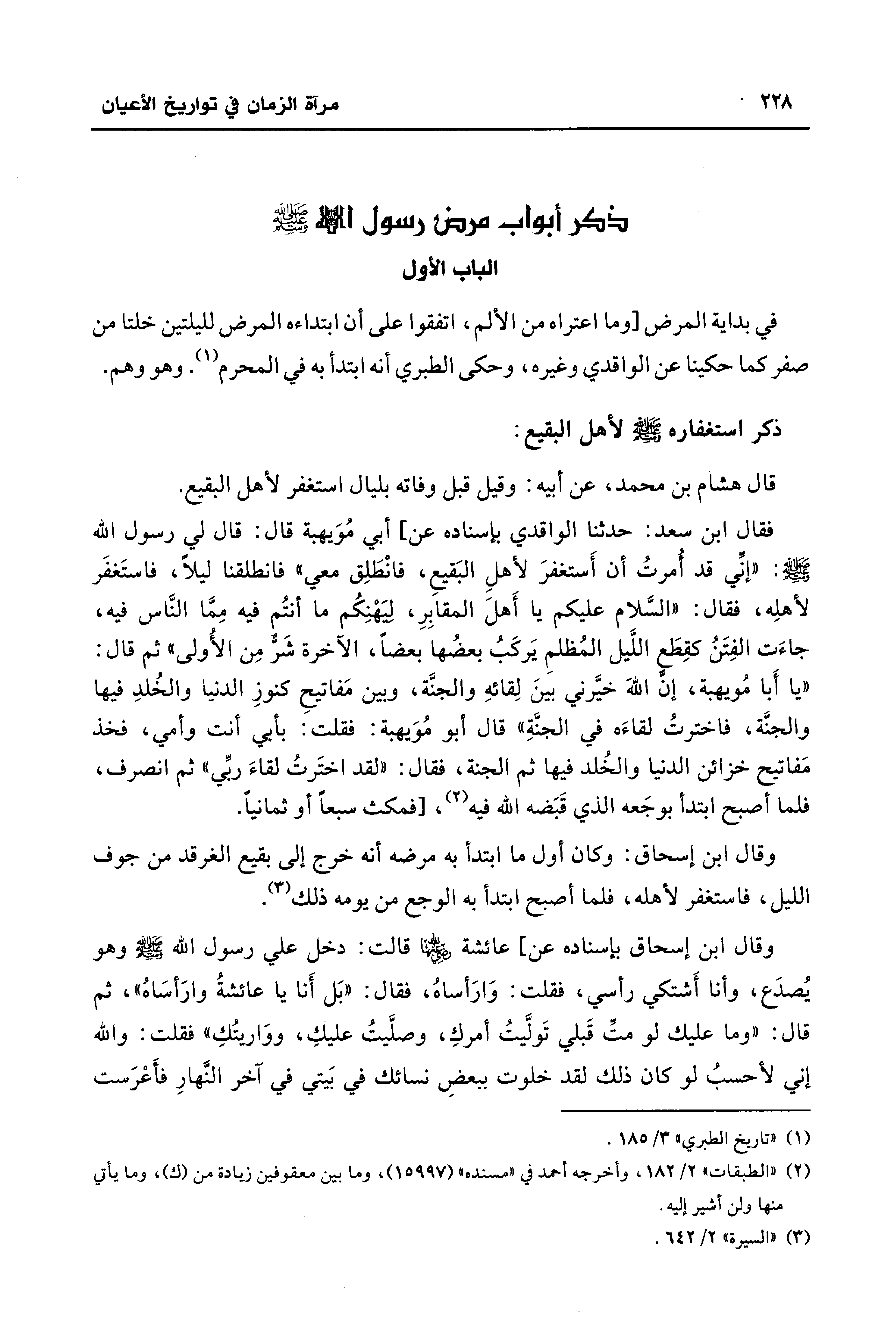 فقال ابن سعد: حدثنا الواقدي بإسناده عن] أبي مُوَيهبة قال: قال لي رسول الله - صلى الله عليه وسلم -: "إنِّي قد أُمرتُ أن أَستغفرَ لأهلِ البَقيعِ، فانْطَلِق معي" فانطلقنا ليلًا، فاستَغفَر لأهلِه، فقال: "السَّلام عليكم يا أَهلَ المقابِرِ، لِيَهْنِكُم ما أنتُم فيه مِمَّا النَّاس فيه، جاءَت الفِتَنُ كقِطَع اللَّيل المُظلمِ يَركَبُ بعضُها بعضًا، الآخرة شَرٌّ مِن الأُولى" ثم قال: "يا أَبا مُويهبة، إنَّ اللهَ خيَّرني بينَ لِقائهِ والجنَّة، وبين مَفاتيحِ كنوزِ الدنيا والخُلدِ فيها والجنَّة، فاخترتُ لقاءَه في الجنَّةِ" قال أبو مُوَيهبة: فقلت: بأبي أنت وأمي، فخذ مَفاتيح خزائن الدنيا والخُلد فيها ثم الجنة، فقال: "لقد اختَرتُ لقاءَ ربِّي" ثم انصرف، فلما أصبح ابتدأ بوجَعه الذي قَبَضه الله فيه (¬2)، [فمكث سبعًا أو ثمانيًا.