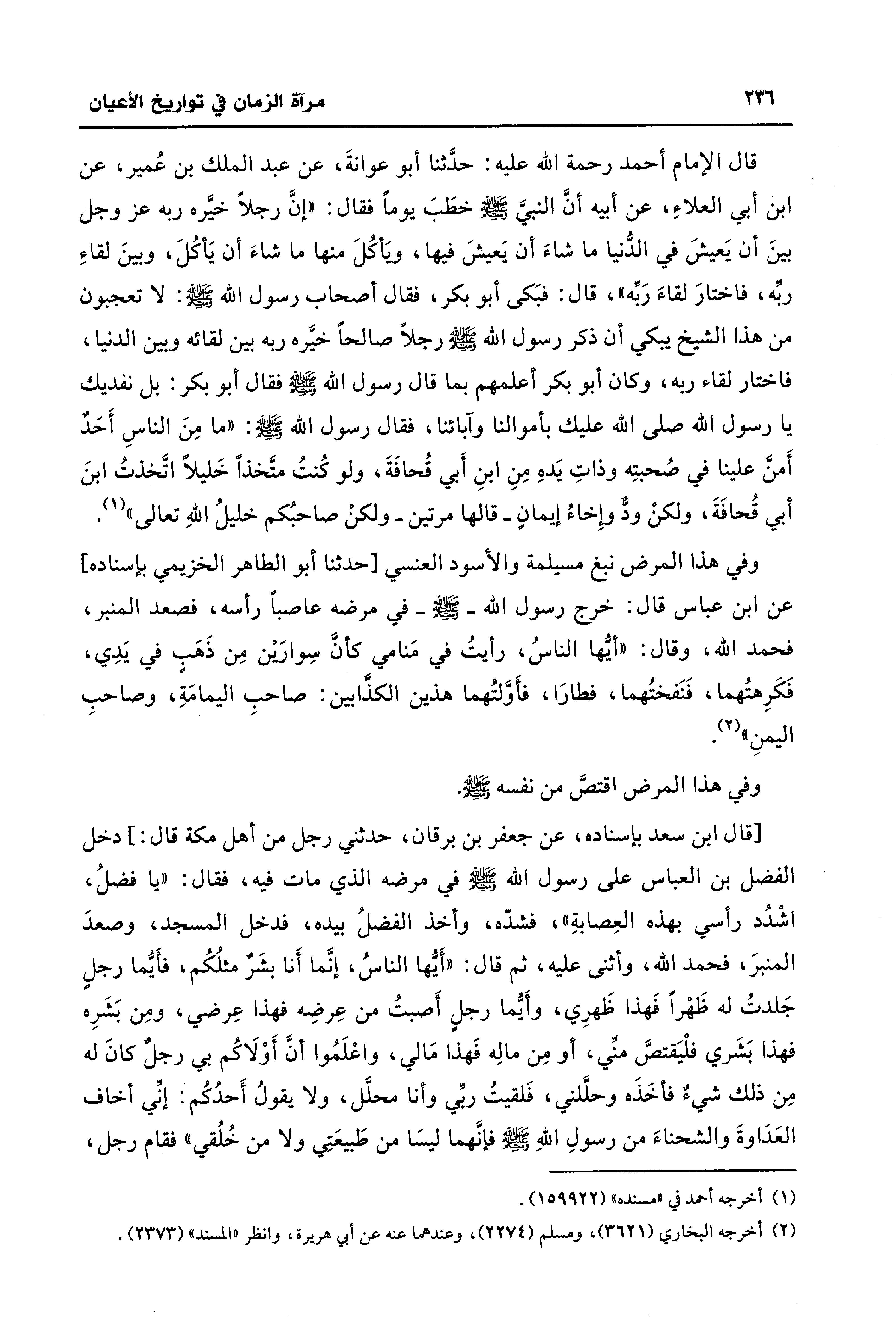 وفي هذا المرض نبغ مسيلمة والأسود العنسي [حدثنا أبو الطاهر الخزيمي بإسناده] عن ابن عباس قال: خرج رسول الله - صلى الله عليه وسلم - في مرضه عاصبًا رأسه، فصعد المنبر، فحمد الله، وقال: "أيُّها الناسُ، رأيتُ في مَنامي كأنَّ سِوارَيْن مِن ذَهَبٍ في يَدِي، فَكَرِهتُهما، فَنَفختُهما، فطارَا، فأَوَّلتُهما هذين الكذَّابين: صاحبِ اليمامَةِ، وصاحبِ اليمنِ" (¬2).