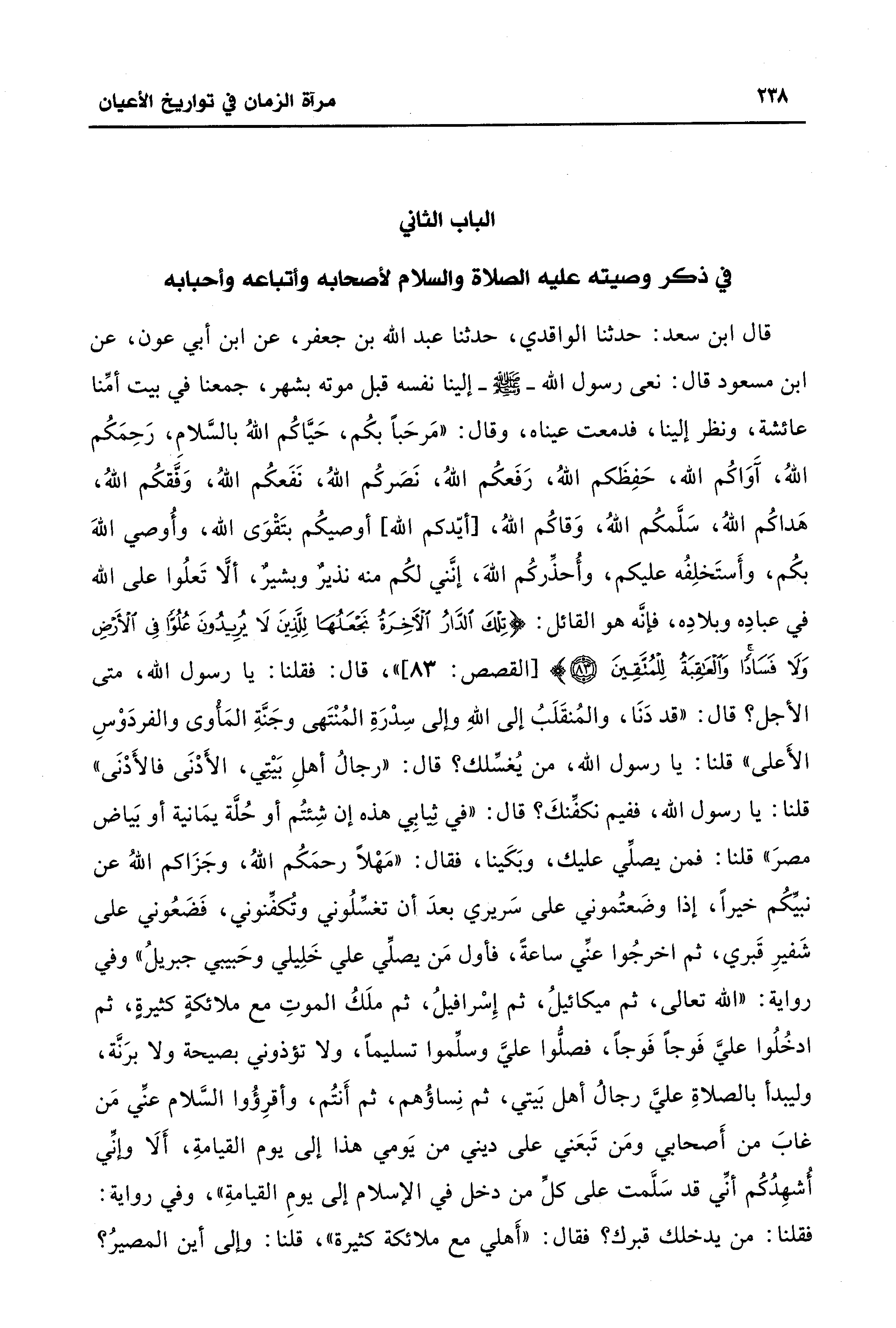قال ابن سعد: حدثنا الواقدي، حدثنا عبد الله بن جعفر، عن ابن أبي عون، عن ابن مسعود قال: نعى رسول الله - صلى الله عليه وسلم - إلينا نفسه قبل موته بشهر، جمعنا في بيت أمِّنا عائشة، ونظر إلينا، فدمعت عيناه، وقال: "مَرحَبًا بكُم، حَيَّاكُم اللهُ بالسَّلامِ، رَحِمَكُم اللهُ، آَوَاكُم الله، حَفِظَكم اللهُ، رَفَعكُم اللهُ، نَصَركُم اللهُ، نَفَعكُم اللهُ، وَفَّقكُم اللهُ، هَداكُم اللهُ، سَلَّمكُم اللهُ، وَقاكُم اللهُ، [أيّدكم الله] أوصيكُم بتَقْوَى الله، وأُوصي اللهَ بكُم، وأَستَخلِفُه عليكم، وأُحذِّركُم اللهَ، إنَّني لكُم منه نذيرٌ وبشيرٌ، ألَّا تَعلُوا على الله في عبادِه وبلادِه، فإنَّه هو القائل: {تِلْكَ الدَّارُ الْآخِرَةُ نَجْعَلُهَا لِلَّذِينَ لَا يُرِيدُونَ عُلُوًّا فِي الْأَرْضِ وَلَا فَسَادًا وَالْعَاقِبَةُ لِلْمُتَّقِينَ (83)} [القصص: 83] "، قال: فقلنا: يا رسول الله، متى الأجل؟ قال: "قد دَنَا، والمُنقَلَبُ إلى اللهِ وإلى سِدْرَةِ المُنْتَهى وجَنَّةِ المَأْوى والفردَوْسِ الأَعلى" قلنا: يا رسول الله، من يُغسَّلك؟ قال: "رجالُ أهلِ بَيْتِي، الأَدْنَى فالأَدْنَى" قلنا: يا رسول الله، ففيم نكفَّنكَ؟ قال: "في ثِيابِي هذه إن شِئتُم أو حُلَّة يمَانية أو بَياض مصرَ" قلنا: فمن يصلَّي عليك، وبَكَينا، فقال: "مَهْلًا رحمَكُم اللهُ، وجَزَاكم اللهُ عن نبيَّكُم خيرًا، إذا وضَعتُموني على سَريري بعدَ أن تغسَّلُوني وتُكفَّنوني، فَضَعُوني على شَفيرِ قَبري، ثم اخرجُوا عنِّي ساعةً، فأول مَن يصلِّي علي خَلِيلي وحَبيبي جبريلُ" وفي رواية: "الله تعالى، ثم ميكائيلُ، ثم إِسْرافيلُ، ثم ملَكُ الموتِ مع ملائكةٍ كثيرةٍ، ثم ادخُلُوا عليَّ فَوجًا فَوجًا، فصلُّوا عليَّ وسلَّموا تسليمًا، ولا تؤذوني بصيحة ولا برَنَّة، وليبدأ بالصلاةِ عليَّ رجالُ أهل بَيتي، ثم نِساؤُهم، ثم أَنتُم، وأقرِؤُوا السَّلام عنِّي مَن غابَ من أَصحابي ومَن تَبعَني على ديني من يَومي هذا إلى يوم القيامةِ، أَلَا وإنِّي أُشهِدُكُم أنَّي قد سَلَّمت على كلِّ من دخل في الإسلام إلى يومِ القيامةِ"، وفي رواية: فقلنا: من يدخلك قبرك؟ فقال: "أَهلي مع ملائكة كثيرة"، قلنا: وإلى أين المصيرُ؟