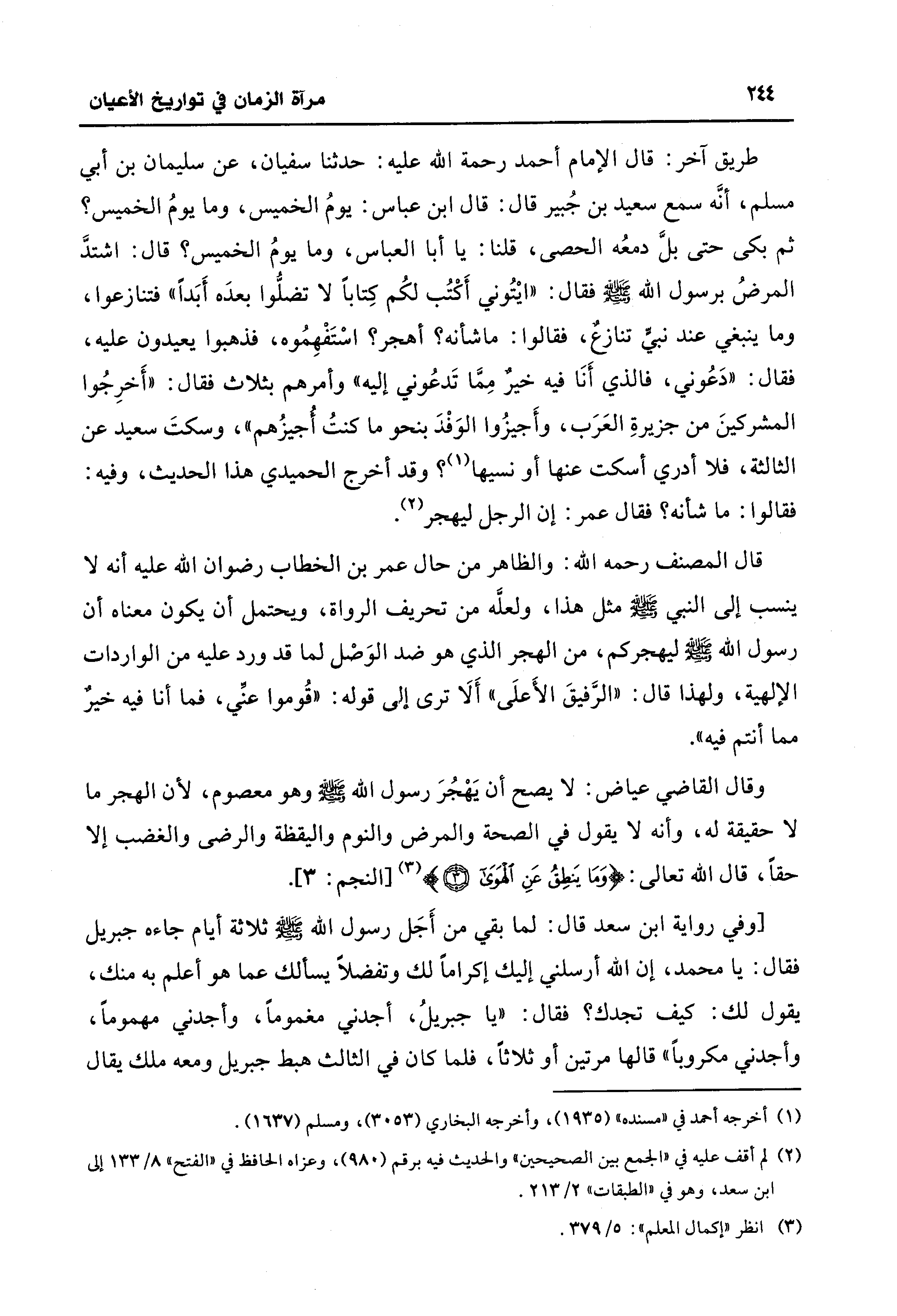 طريق آخر: قال الإمام أحمد رحمة الله عليه: حدثنا سفيان، عن سليمان بن أبي مسلم، أنَّه سمع سعيد بن جُبير قال: قال ابن عباس: يومُ الخميس، وما يومُ الخميس؟ ثم بكى حتى بلَّ دمعُه الحصى، قلنا: يا أبا العباس، وما يومُ الخميس؟ قال: اشتدَّ المرضُ برسول الله - صلى الله عليه وسلم - فقال: "ايْتُوني أَكْتُب لكُم كِتابًا لا تضلُّوا بعدَه أَبَدًا" فتنازعوا، وما ينبغي عند نبيًّ تنازعٌ، فقالوا: ما شأنه؟ أهجر؟ اسْتَفْهِمُوه، فذهبوا يعيدون عليه، فقال: "دَعُوني، فالذي أَنَا فيه خيرٌ مِمَّا تَدعُوني إليه" وأمرهم بثلاث فقال: "أَخرِجُوا المشركينَ من جزيرةِ العَرَب، وأَجيزُوا الوَفْدَ بنحو ما كنتُ أُجيزُهم"، وسكتَ سعيد عن الثالثة، فلا أدري أسكت عنها أو نسيها (¬1)؟ وقد أخرج الحميدي هذا الحديث، وفيه: فقالوا: ما شأنه؟ فقال عمر: إن الرجل ليهجر (¬2).