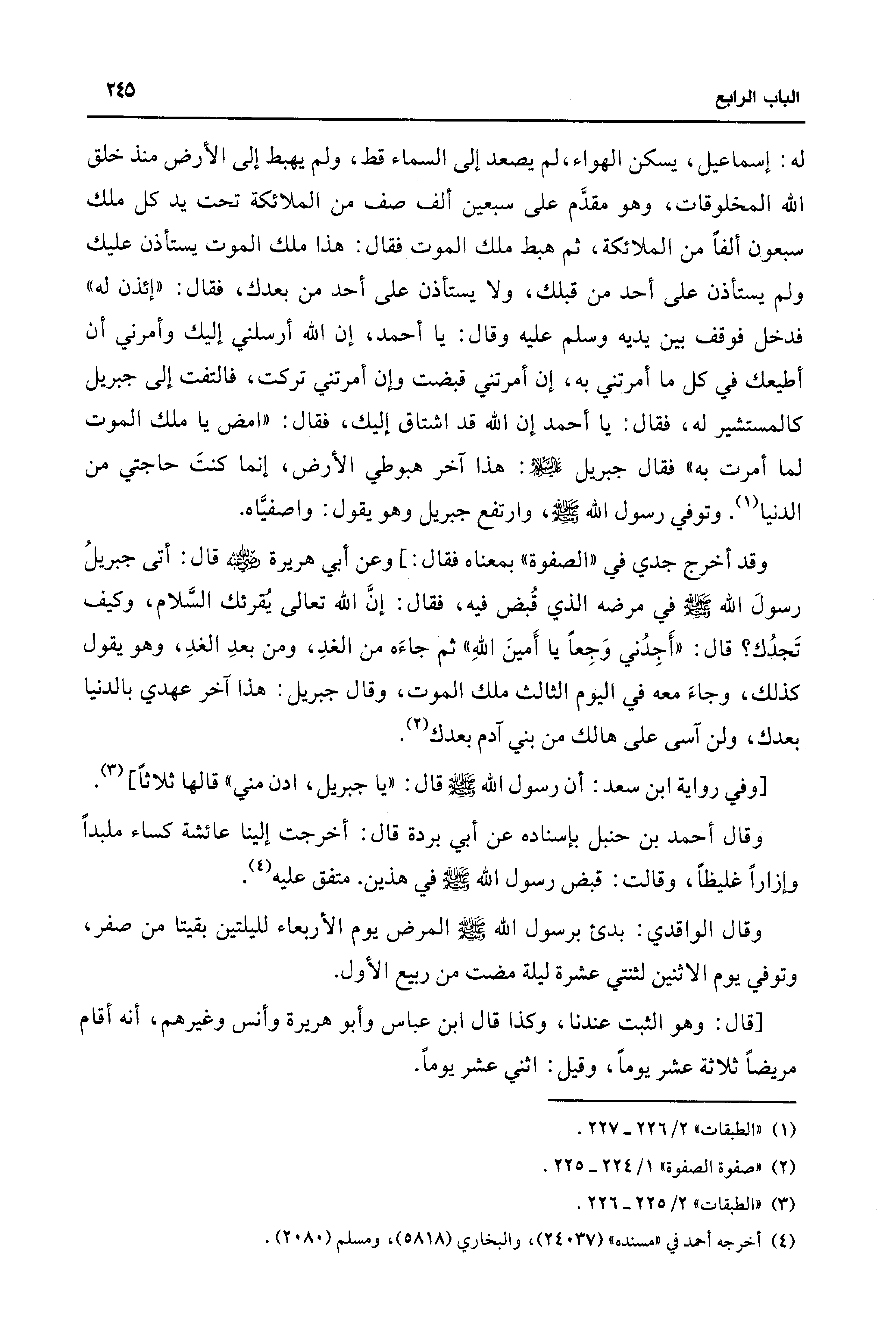 وقد أخرج جدي في "الصفوة" بمعناه فقال: ] وعن أبي هريرة - رضي الله عنه - قال: أتى جبريلُ رسولَ الله - صلى الله عليه وسلم - في مرضه الذي قُبض فيه، فقال: إنَّ الله تعالى يُقرئك السَّلام، وكيف تَجدُك؟ قال: "أَجِدُني وَجِعًا يا أَمينَ اللهِ" ثم جاءَه من الغدِ، ومن بعدِ الغدِ، وهو يقول كذلك، وجاءَ معه في اليوم الثالث ملك الموت، وقال جبريل: هذا آخر عهدي بالدنيا بعدك، ولن آسى على هالك من بني آدم بعدك (¬2).