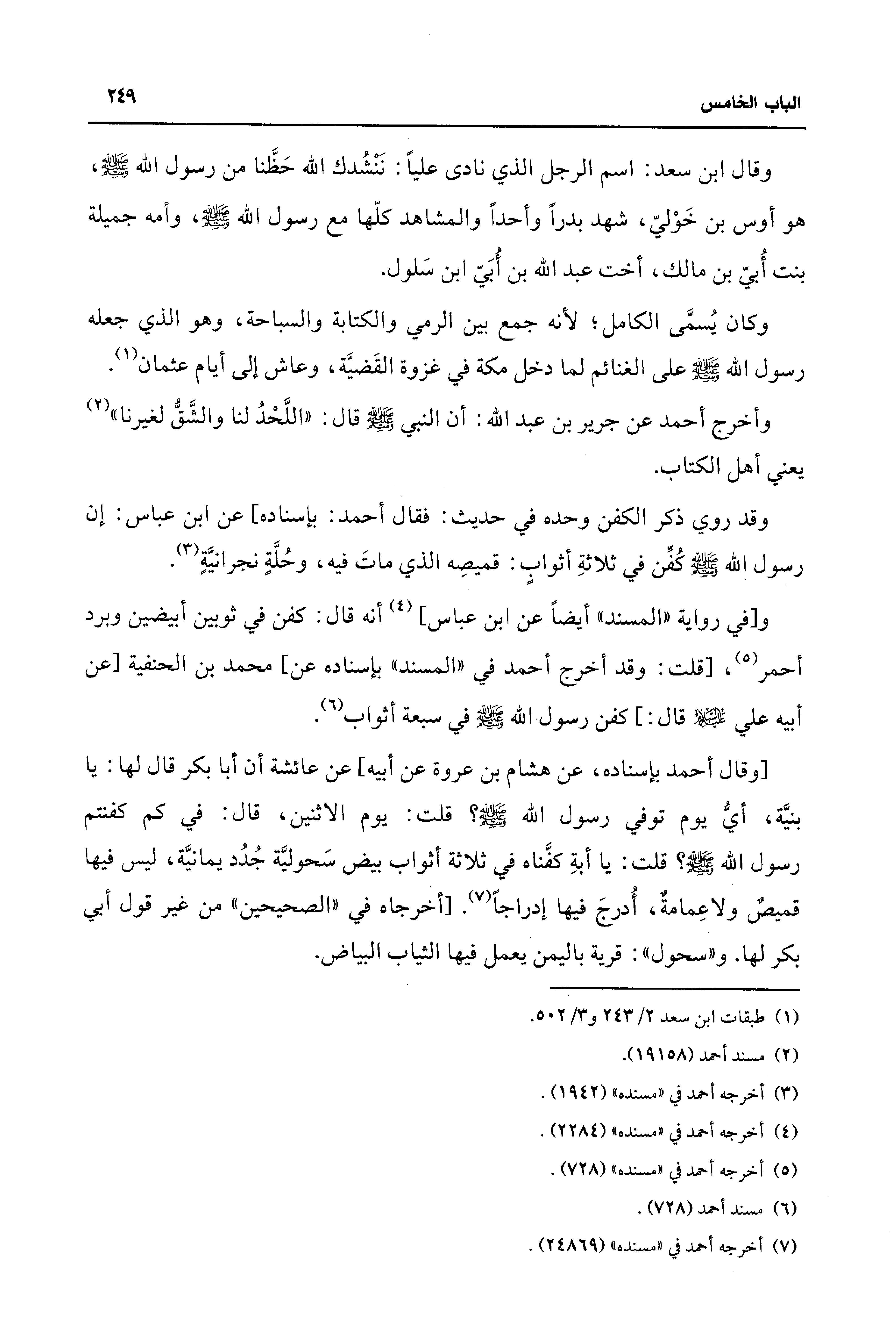 [وقال أحمد بإسناده، عن هشام بن عروة عن أبيه] عن عائشة أن أبا بكر قال لها: يا بنيَّة، أيُّ يوم توفي رسول الله - صلى الله عليه وسلم -؟ قلت: يوم الاثنين، قال: في كم كفنتم رسول الله - صلى الله عليه وسلم -؟ قلت: يا أبةِ كفَّناه في ثلاثة أثواب بيض سَحوليَّة جُدُد يمانيَّة، ليس فيها قميصٌ ولا عِمامةٌ، أُدرجَ فيها إدراجًا (¬7). [أخرجاه في "الصحيحين" من غير قول أبي بكر لها. و"سحول": قرية باليمن يعمل فيها الثياب البياض.