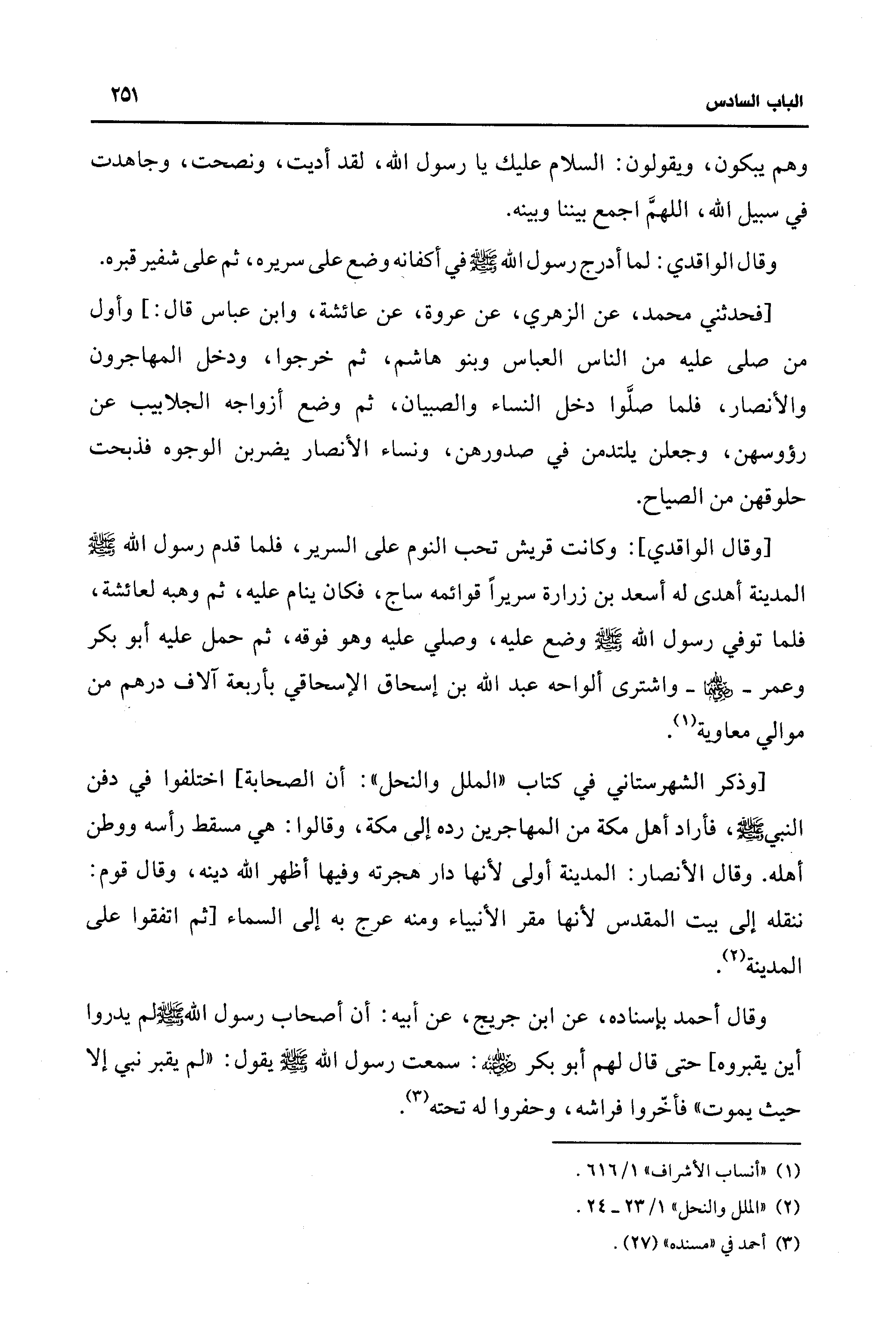 [وذكر الشهرستاني في كتاب "الملل والنحل": أن الصحابة] اختلفوا في دفن النبي - صلى الله عليه وسلم -، فأراد أهل مكة من المهاجرين رده إلى مكة، وقالوا: هي مسقط رأسه ووطن أهله. وقال الأنصار: المدينة أولى لأنها دار هجرته وفيها أظهر الله دينه، وقال قوم: ننقله إلى بيت المقدس لأنها مقر الأنبياء ومنه عرج به إلى السماء [ثم اتفقوا على المدينة (¬2).