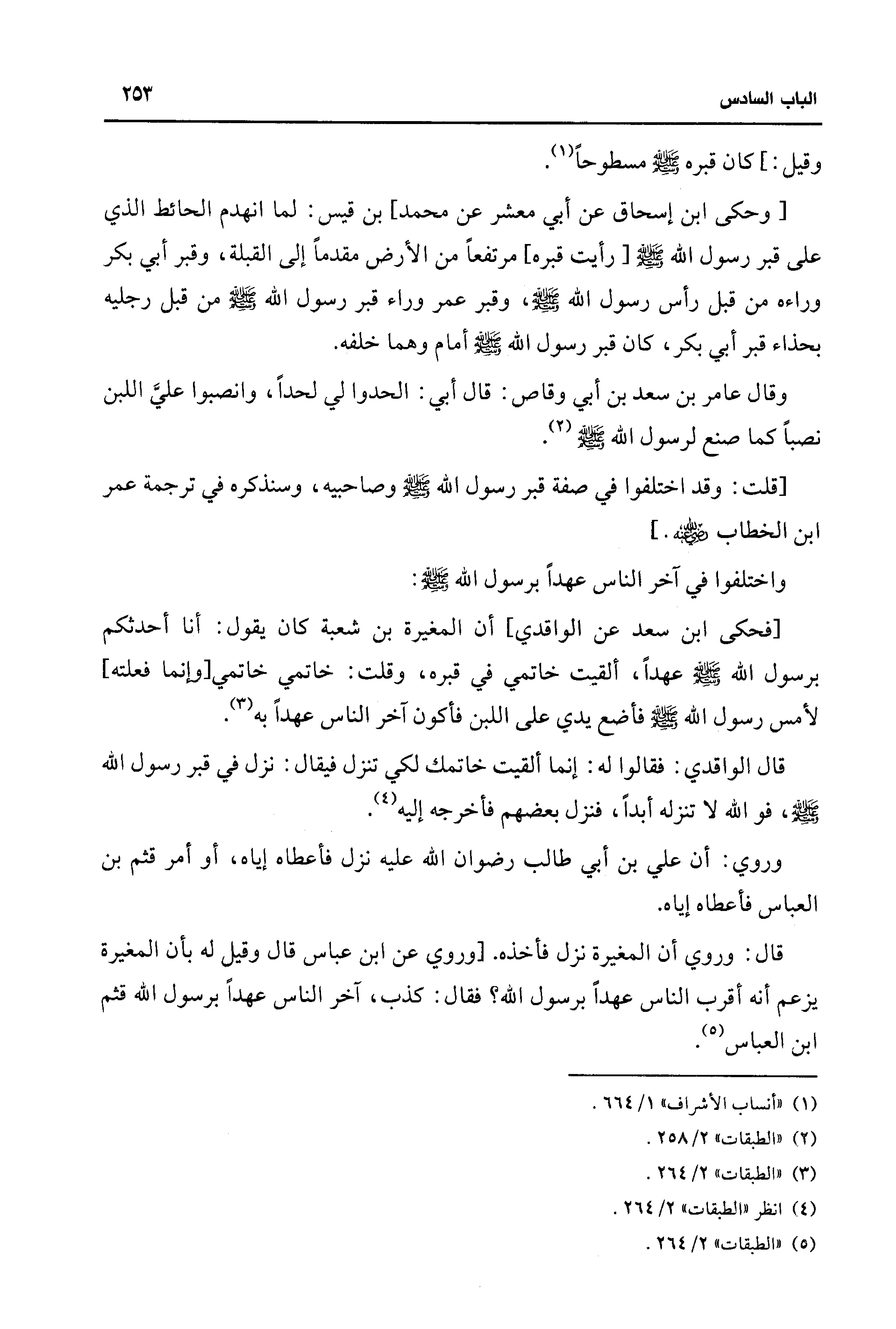 [قلت: وقد اختلفوا في صفة قبر رسول الله - صلى الله عليه وسلم - وصاحبيه، وسنذكره في ترجمة عمر ابن الخطاب - رضي الله عنه -.]